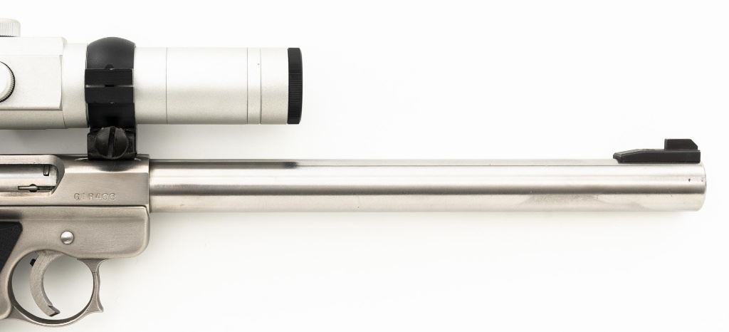 Arcadia Machine & Tool (AMT) Lightning Mark II Semi-Automatic Pistol with Extras, #G18403, .22 LR cal., 10" heavy barrel, stainless steel finish, checkered rubber two-piece Pachmayr wraparound grips, ramped blade front sight, drift adjustable square-notch rear sight, factory ribbed adjustable trigger, with one 10-round AMT magazine. Pistol is topped with two-piece bases, rings, and an Illusion by Laseraim red dot sight. Sight was tested and functions properly. Also included is a plastic Crosman Air Guns stabilizer arm, (4) additional 10-round magazines, additional upper receiver (s/n G07267) with a 6.5" barrel. The extra receiver has a stainless steel finish, Patridge front sight, fixed square-notch rear sight, and is topped with rings and Simmons 4X fixed power pistol scope. Scope has a silver finish and duplex reticle, with bright optics. This pistol also comes with notes and test targets from the previous owner and a large foam lined plastic hard case. Pistol is in very good+ overall condition, with light handling and storage marks. Grips with sharp checkering. Action functions smoothly. Bore is very good with well-defined rifling. Est.: $600-$800. (Modern/PPT)
