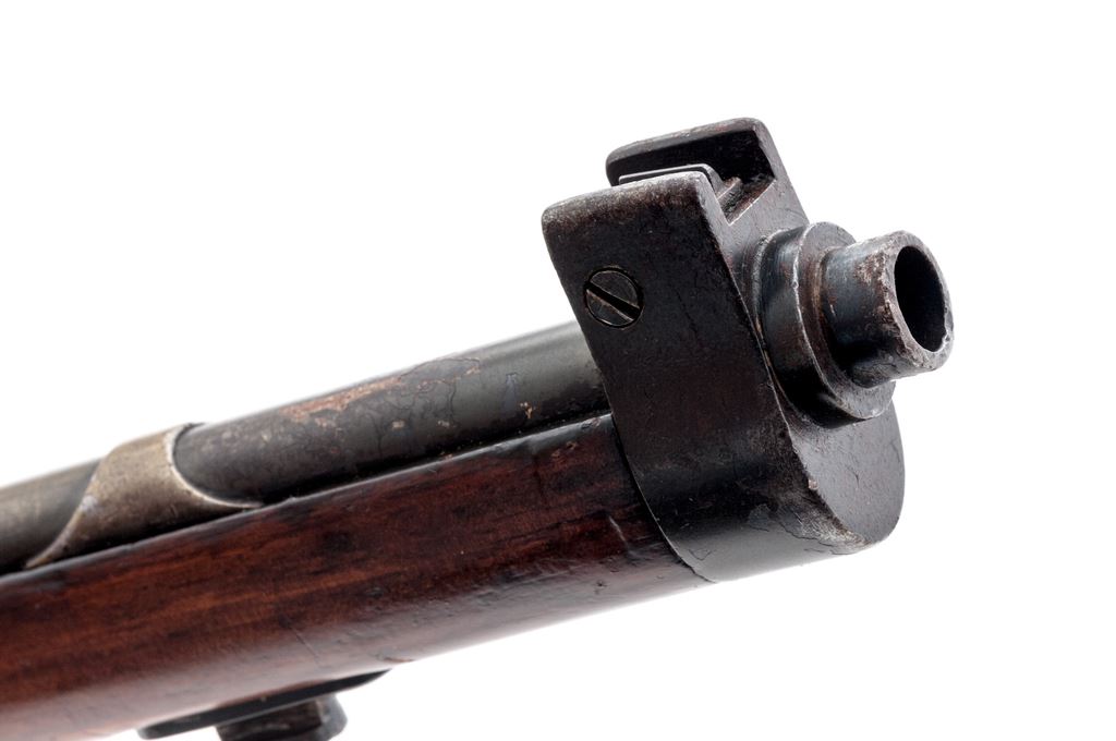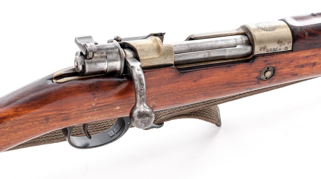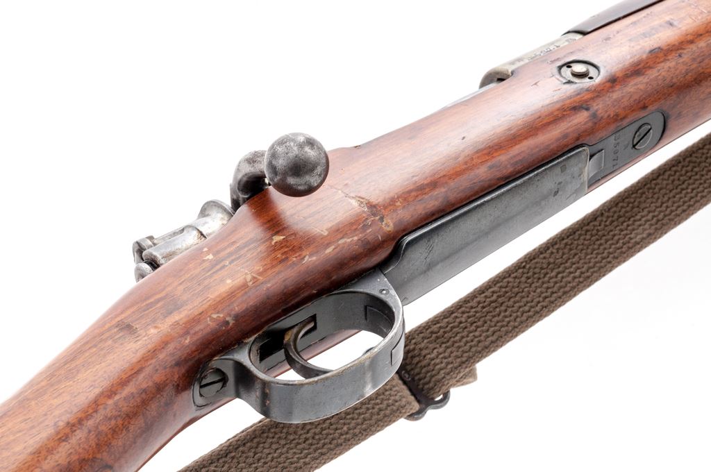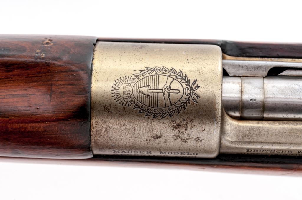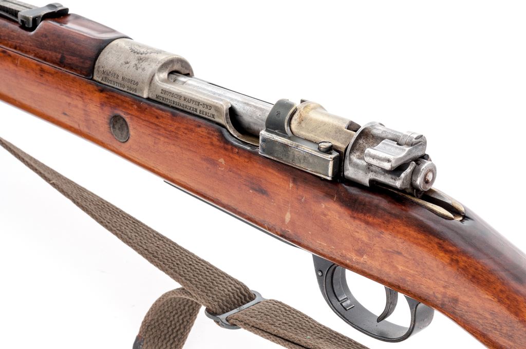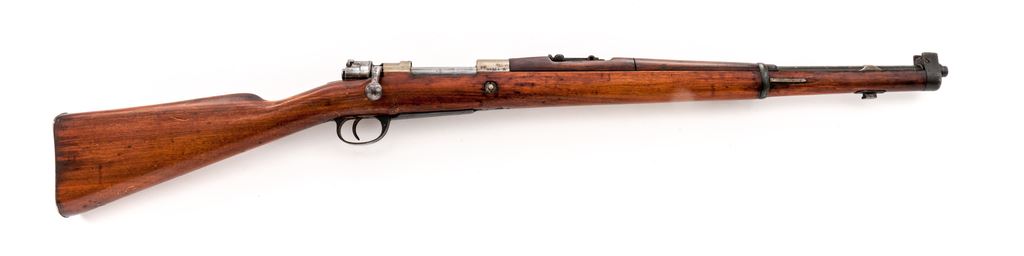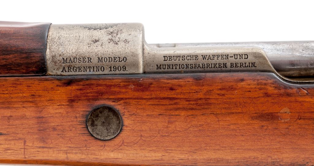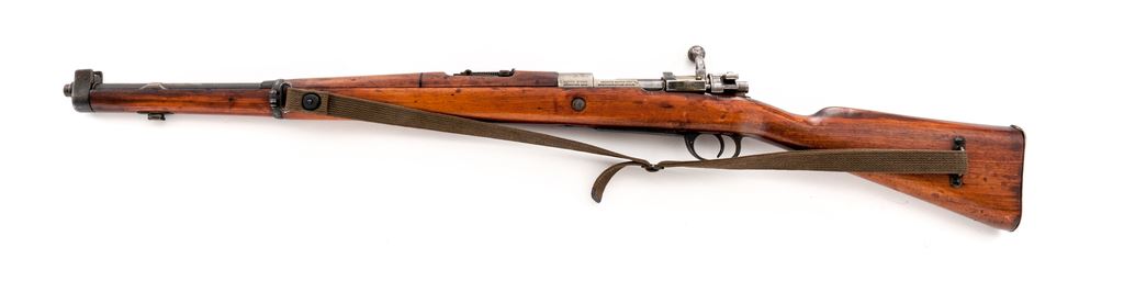 Argentine Model 1909/26 Mauser Bolt Action Cavalry Carbine, #B5971, 7.65x53 mm cal., 22'' barrel, blued finish, hardwood stock, blade front sight with protecting ears and adjustable tangent rear sight, with U.S. M1 carbine sling. Marked on top of receiver ring with intact Argentine crest, and on left side ''MAUSER MODELO ARGENTINO 1909''. ''DEUTSCHE WAFFEN-UND MUNITIONSFABRIKEN BERLIN'' marked on left side receiver rail. Matching numbers on bolt and trigger guard. Condition overall is very good with the blued metal parts retaining approx. 70% finish, which appears to have had varnish applied. There is rust pitting around the muzzle nose cap. The bright receiver and bands have a gold toned color, possibly from varnish also. Wood has been vigorously sanded and the buttplate extends over the buttstock. Condition is very good with handling marks around the receiver area. Action is smooth; bore is slightly frosted, otherwise very good with very good rifling. No visible import marks. Est.: $500-$700. (C&R)