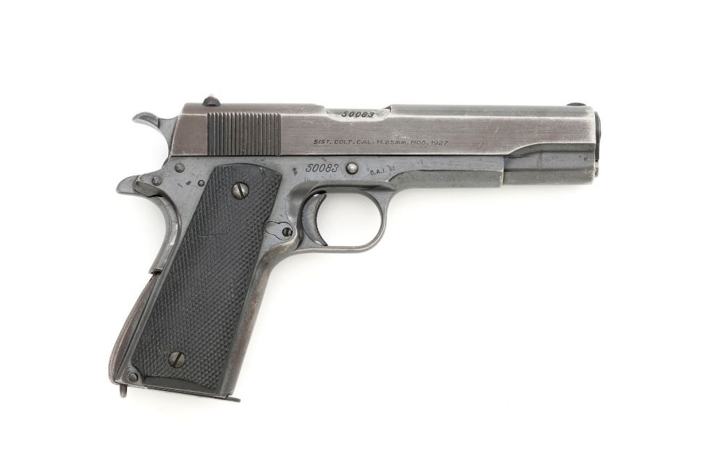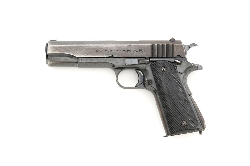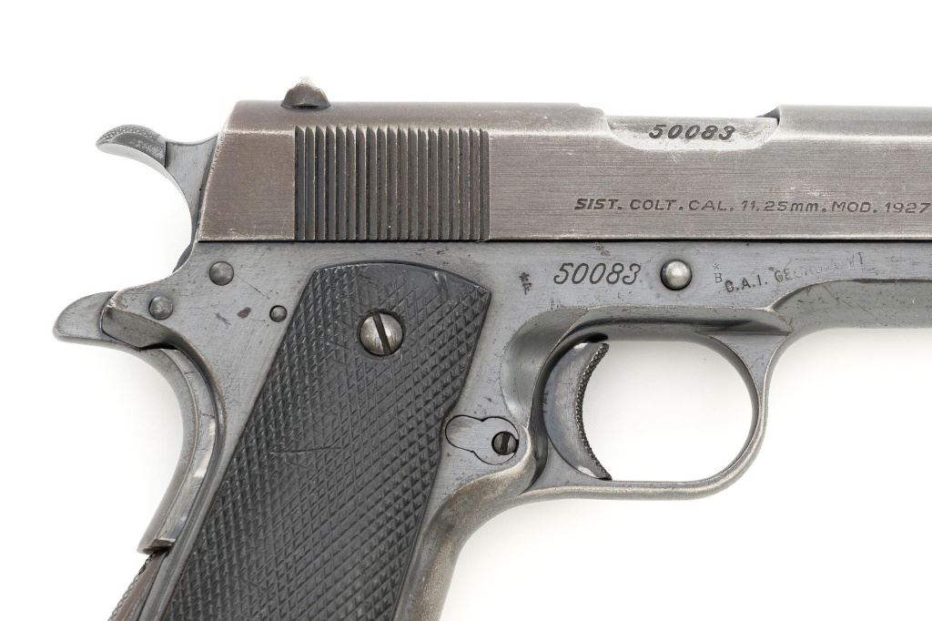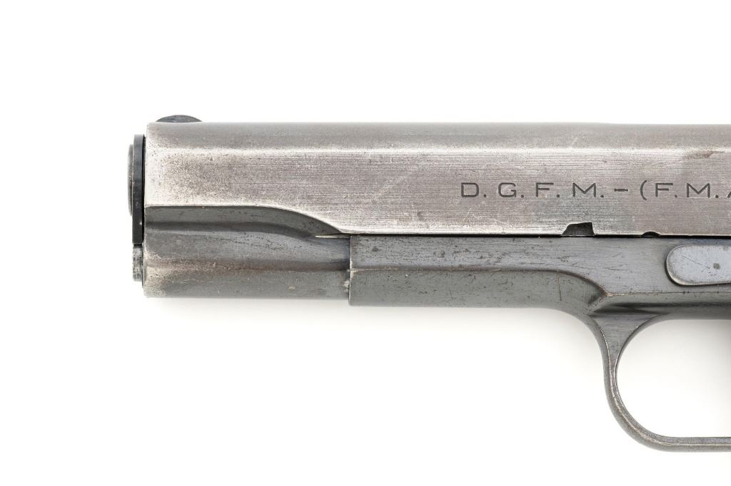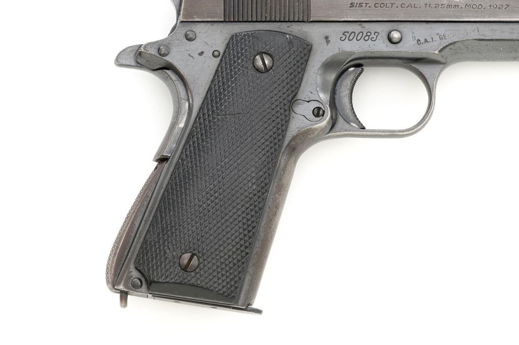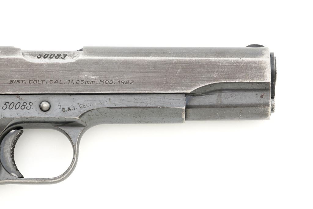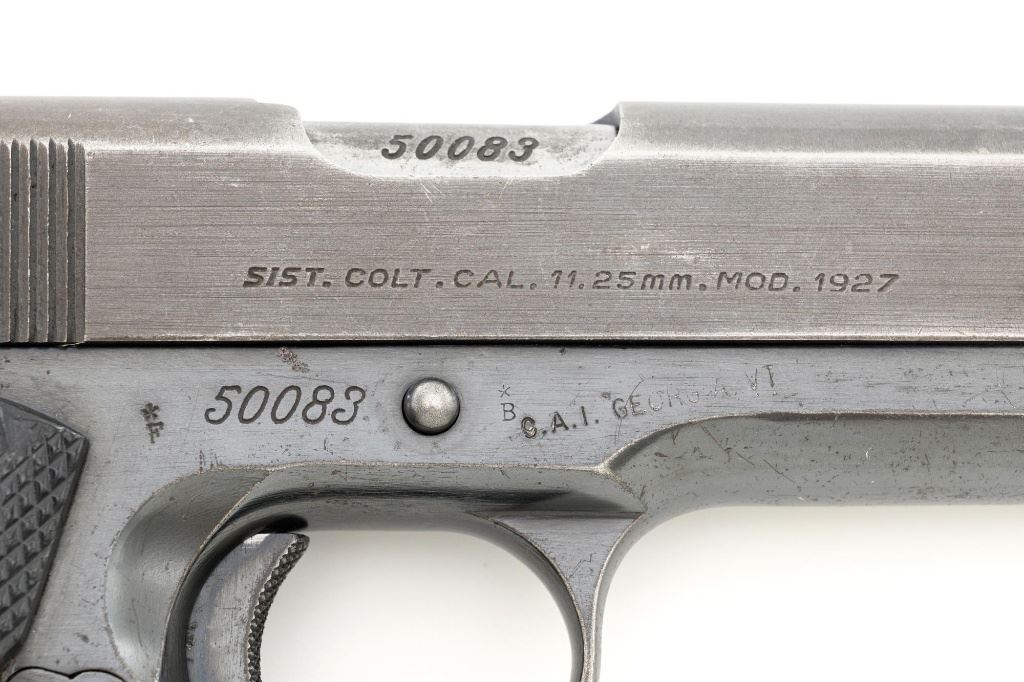 Argentine Model 1927 Semi-Automatic Pistol, #50083, 11.25mm (.45 ACP) cal., 5" barrel, blued finish, checkered plastic grips, blade front sight, and "U"-notched rear sight, with one newer production blued steel magazine that has two holes in the base for a rubber pad. Receiver is marked "P" on the left side and "50083" on the right side. Slide is marked "D.G.F.M. (F.M.A.P.)" on the left side and "SIST. COLT. CAL. 11.25 mm MOD. 1927 on the right side". Matching numbers on frame, barrel, and slide. C.A.I. import mark on right side of the receiver. Pistol is in good overall condition, retaining approx. 50%-55% blue, with wear mostly on the grip area and the sides of the slide. Grips show wear, with scratches and some smoothing of the checkering. Action works properly. Bore is good with clearly defined rifling. Est.: $600-$900. (C&R/PPT)