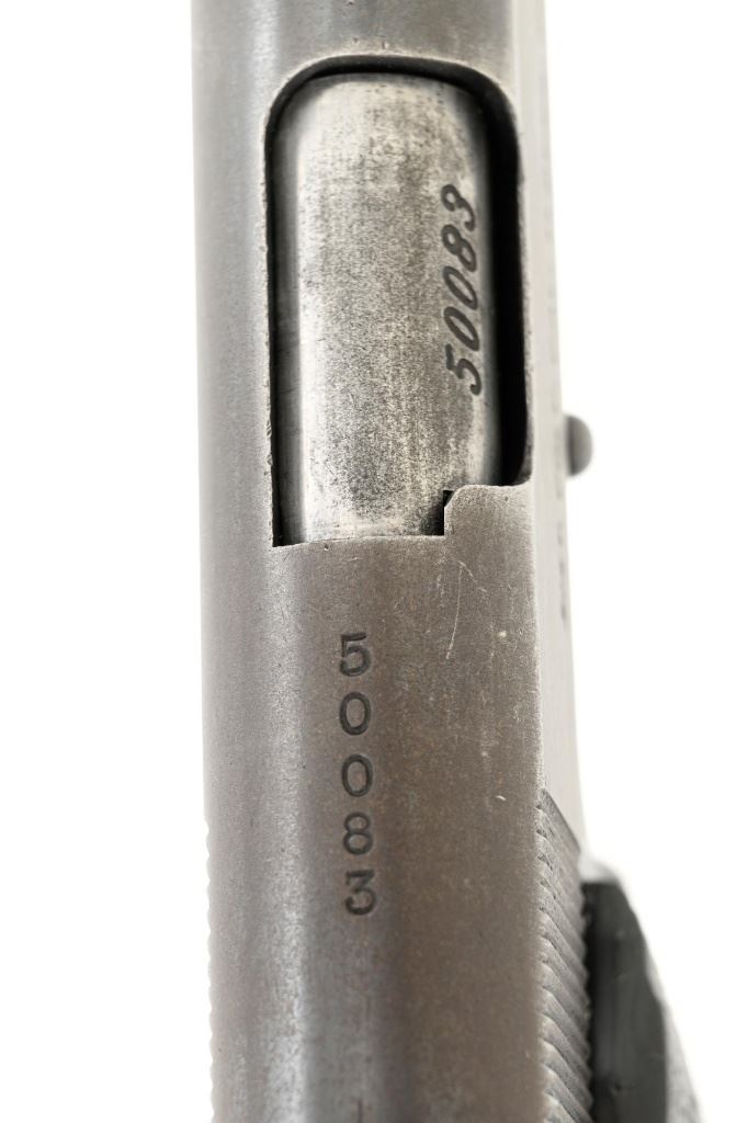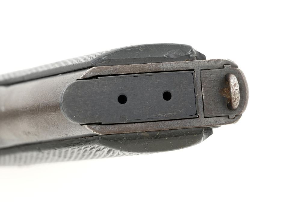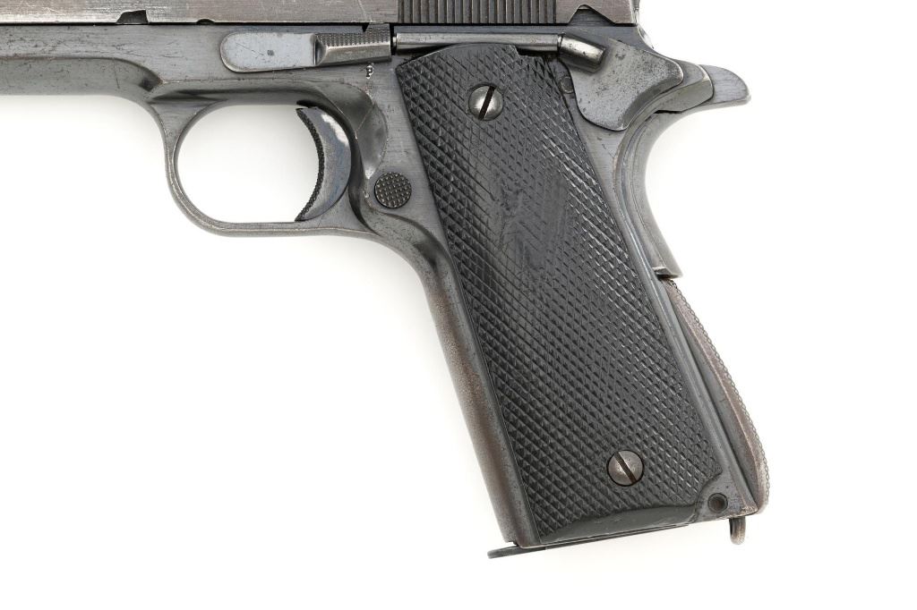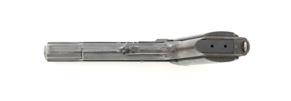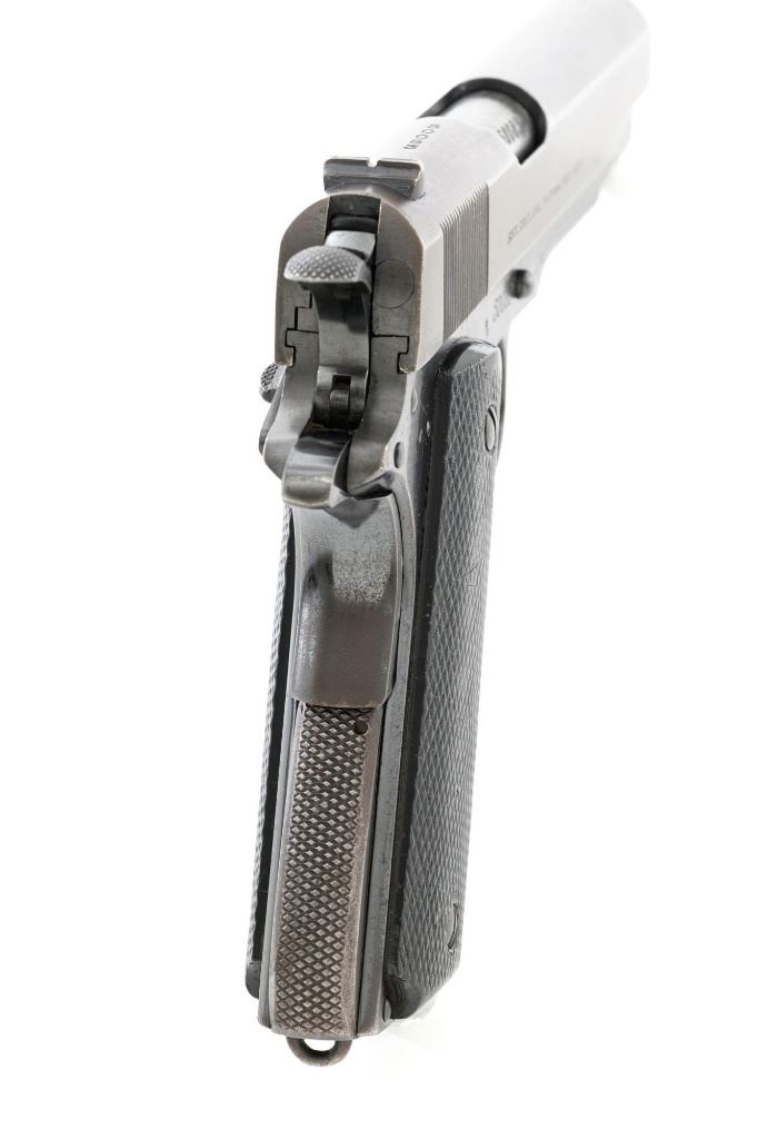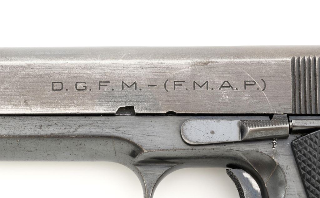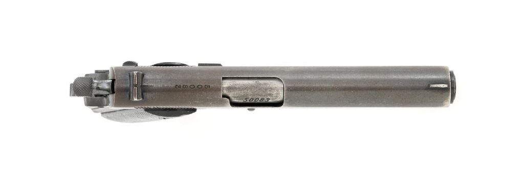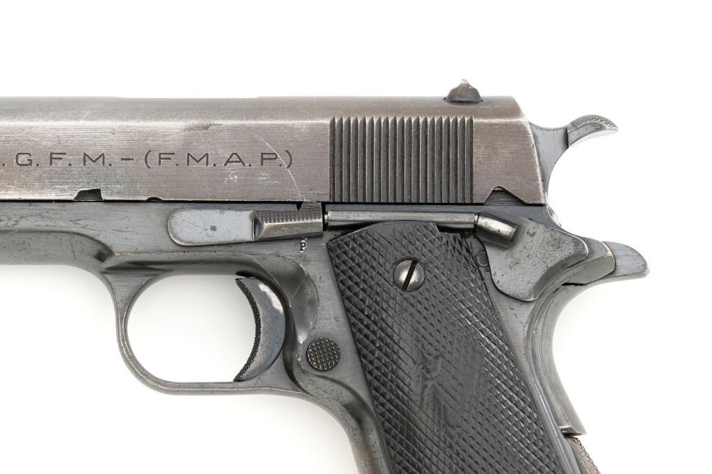 Argentine Model 1927 Semi-Automatic Pistol, #50083, 11.25mm (.45 ACP) cal., 5" barrel, blued finish, checkered plastic grips, blade front sight, and "U"-notched rear sight, with one newer production blued steel magazine that has two holes in the base for a rubber pad. Receiver is marked "P" on the left side and "50083" on the right side. Slide is marked "D.G.F.M. (F.M.A.P.)" on the left side and "SIST. COLT. CAL. 11.25 mm MOD. 1927 on the right side". Matching numbers on frame, barrel, and slide. C.A.I. import mark on right side of the receiver. Pistol is in good overall condition, retaining approx. 50%-55% blue, with wear mostly on the grip area and the sides of the slide. Grips show wear, with scratches and some smoothing of the checkering. Action works properly. Bore is good with clearly defined rifling. Est.: $600-$900. (C&R/PPT)