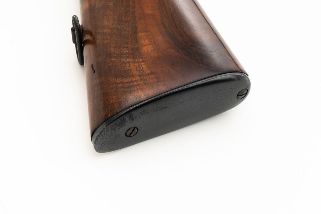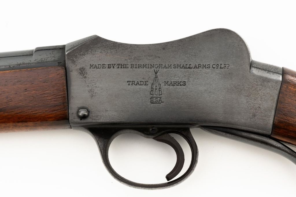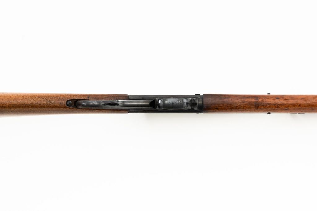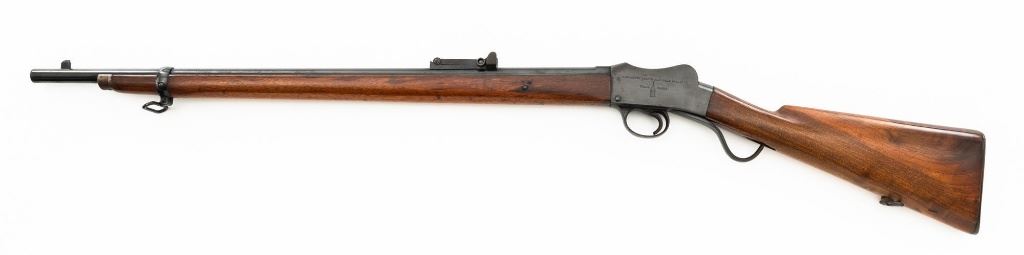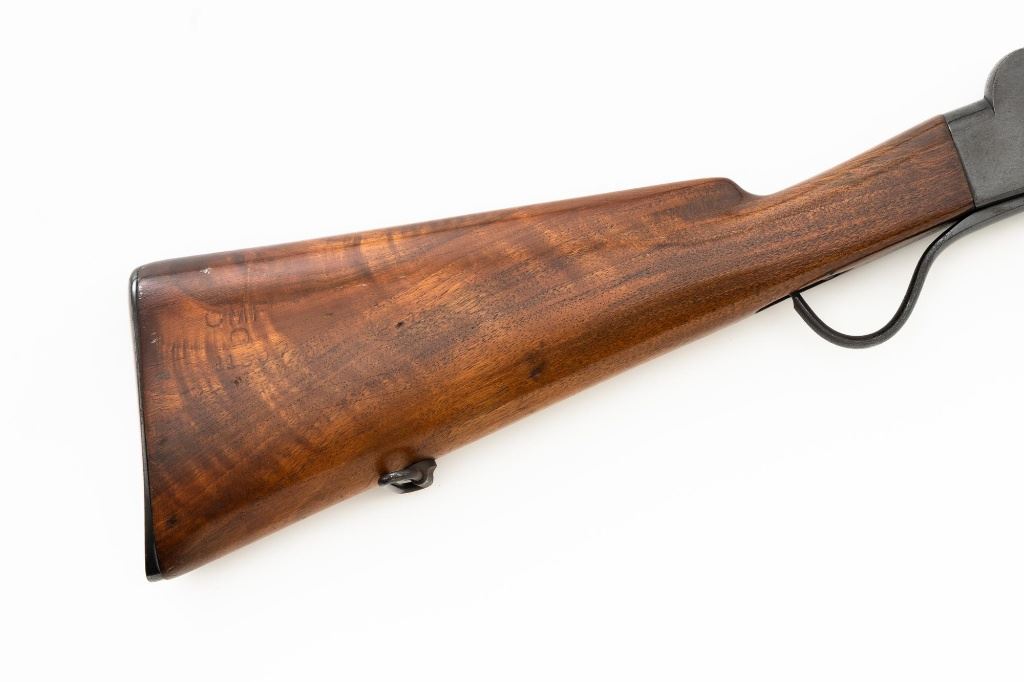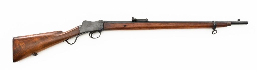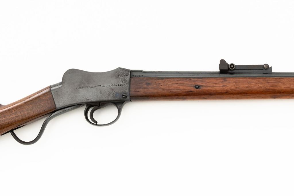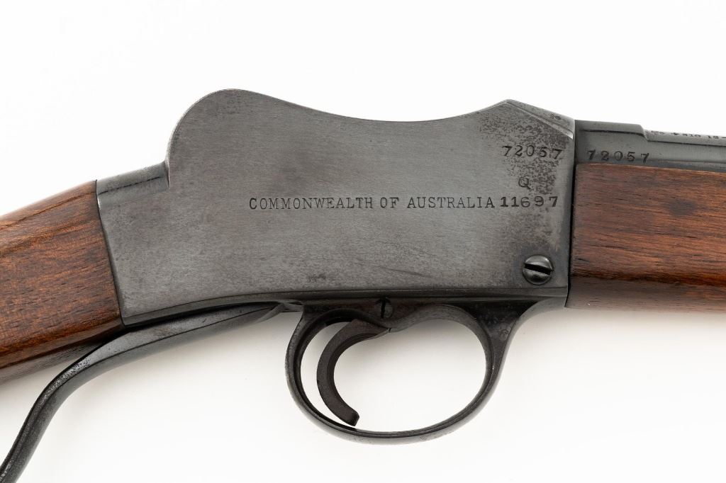Australian Issue BSA Martini Cadet Single Shot Rifle, #72057, .32-20 Win. cal., 25.25" barrel, blued finish with bright breech block, hardwood stock set, blade front sight, and adjustable leaf rear sight with "V"- notched groove, graduated to 600 yards. Rear sight bed screw is missing. Left side of the receiver is marked "MADE BY THE BIRMINGHAM SMALL ARMS Co LTD/TRADE MARKS/BSA" and the right side with "COMMONWEALTH OF AUSTRALIA". There is an image of a Kangaroo on top of the receiver flat. Rifle was issued to the Commonwealth Military Forces in Queensland and stamped "CMF/Q/11697" on right side of the buttstock and "Q/11697"on right side of the receiver. The caliber was importer converted and is stamped "32 20" on the barrel knox form. Matching numbers on barrel and receiver. No visible import marks. Condition overall is very good as refinished, retaining approx. 75%-80% reblued finish; showing fine frosting to the receiver, barrel, and trigger guard/lever. Locking block is good with toning. Wood has been sanded and varnished, now very good, with a few scattered handling marks. Action and loaded chamber indicator operate smoothly. Bore is bright, with a few spots of pitting mid-barrel, rifling is good. Est.: $400-$600. (C&R)
