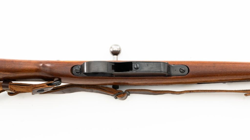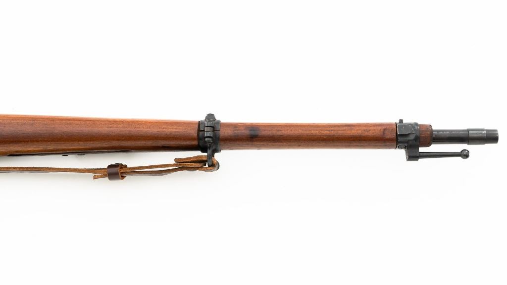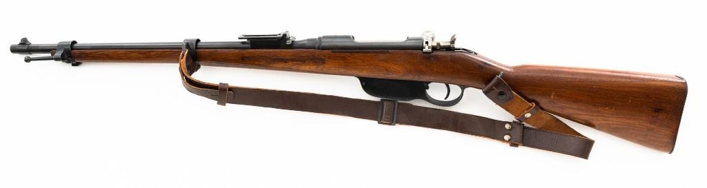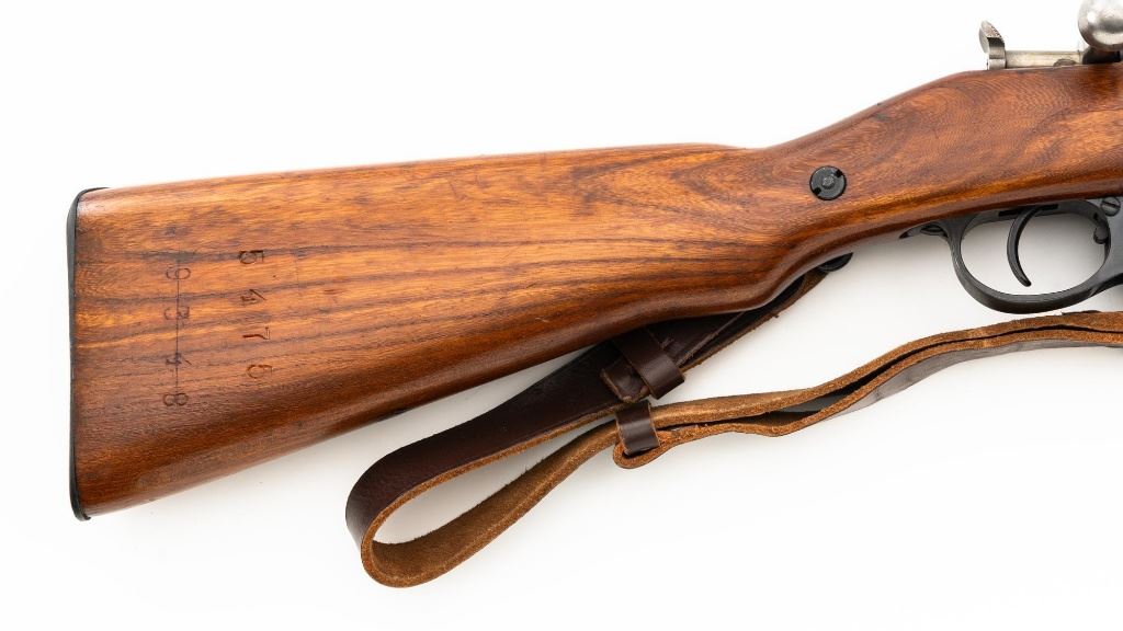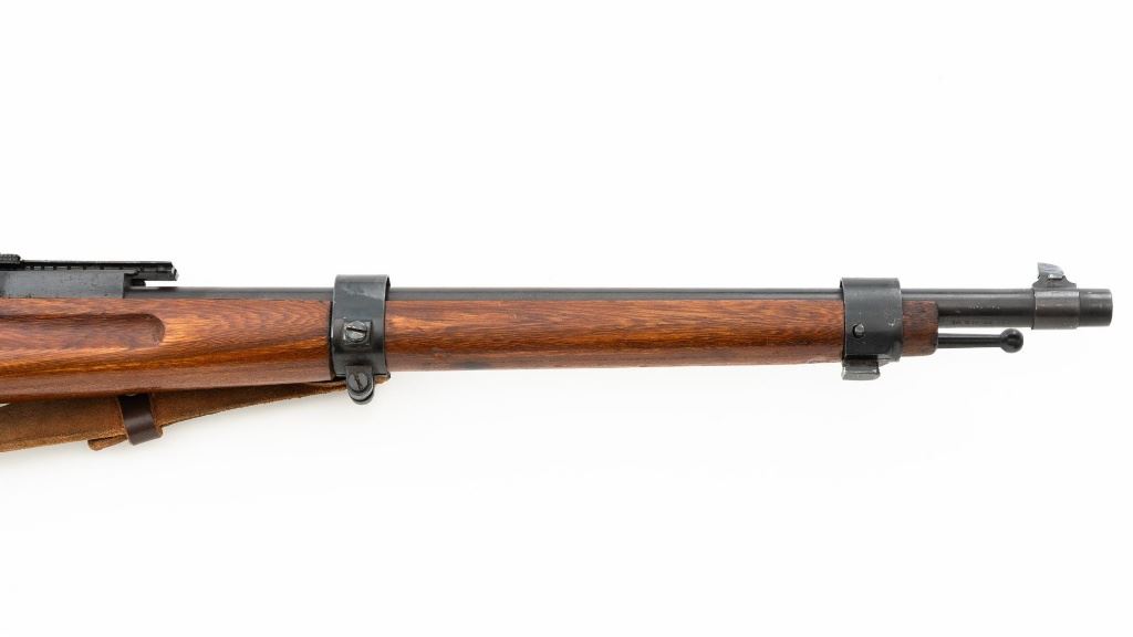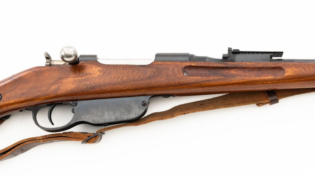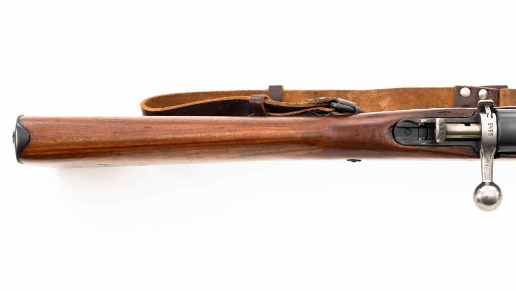 Austrian M.95 Steyr Mannlicher Straight Pull Short Rifle, #5475, 8x56Rmm cal., 20"barrel, blued finish, hardwood stock, missing the handguard, dovetailed inverted-"V" front sight, and adjustable folding leaf rear sight with "V"-notched groove, graduated to 2200 meters. Includes a brown leather military sling, in very good used condition. Top of the receiver ring is marked "STEYR/M.95". Top of the barrel shank is stamped "S(Austrian Eagle)6/16" with a large "S" conversion stamp. Matching visible numbers. Import marked on underside of the barrel. Condition overall is near fine, retaining approx. 95% arsenal reblued finish, showing light handling marks around the muzzle and to the front barrel band. Stock is very good, sanded, now with scattered impressions and handling marks to the varnished finish. Finger grooves on both sides are shallow from sanding. Action operates smoothly. Bore with darkening in the grooves, rifling is defined and rates good overall. Est.: $250-$350. (C&R)