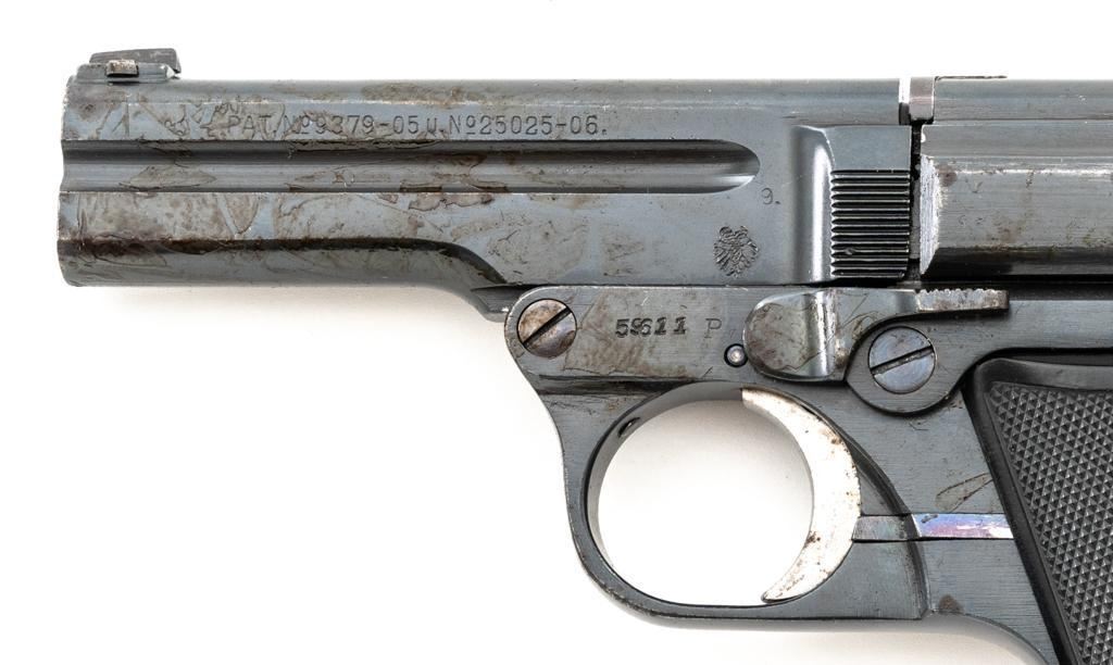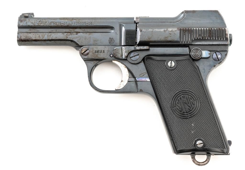 Austrian Steyr Model 1908/34 Semi-Automatic Pistol, #59611P, .32 ACP cal., 3.7" flat sided tip up barrel, blued finish, checkered black plastic grips embossed with the "STEYR" logo on each side, dovetailed inverted-"V" front sight, fixed rear sight with "V"-notched groove, with a fixed lanyard loop on left side of the frame. Includes one unmarked blued magazine. Left side of the barrel is marked with an "(Austrian eagle)" and patent information, right side with patent information and "NDV" stamp. No visible import marks. Condition overall is fine, retaining approx. 85%-90% blue, showing areas of thinning and toning. Grips are very good , with the right side showing light scratches and an area of wear to the checkering. Action operates smoothly. Bore is bright with very good, clearly defined rifling. Est.: $500-$750. (C&R/PPT)