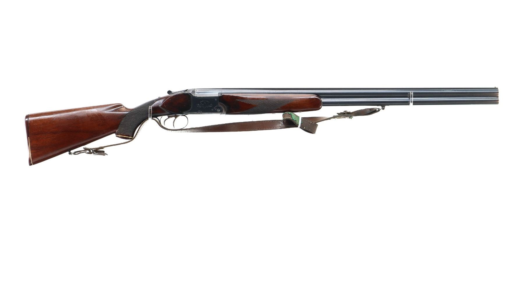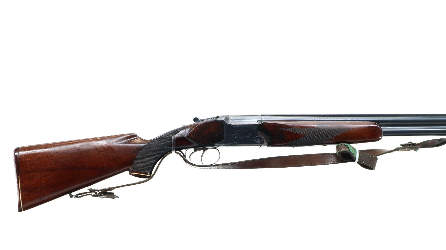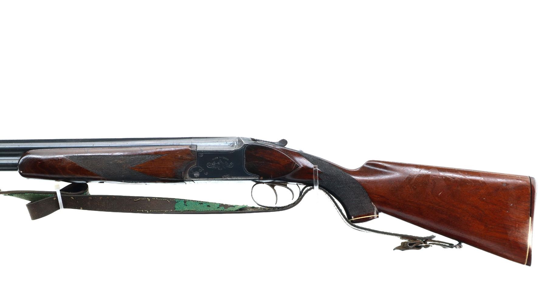 Main Description: Brass bead, blued finish, solid rib, engraved receiver, manual safety, missing extractors, has double triggers. Two piece wood stocks, checkered forearm and pistol grip, grooved brown polymer butt plate, white spacer is broken, grip cap, sling swivels with brown leather sling