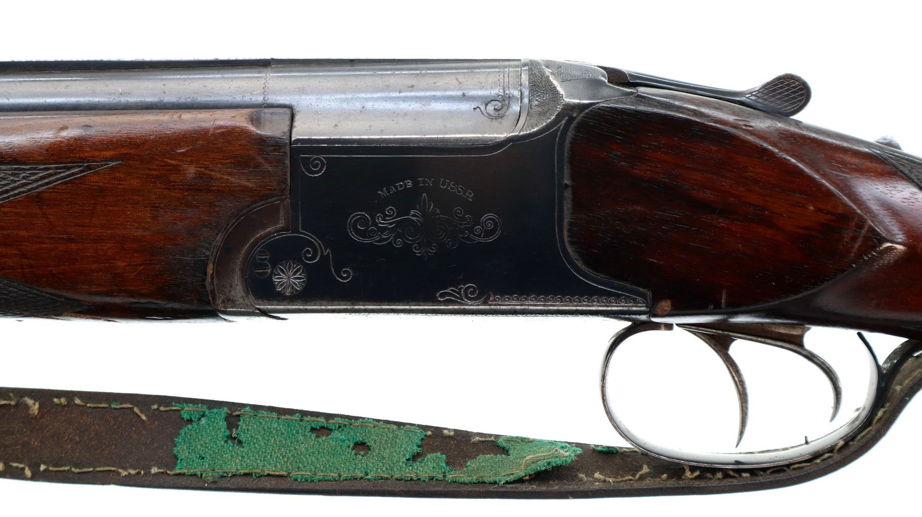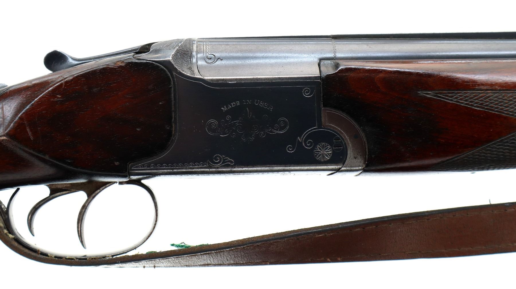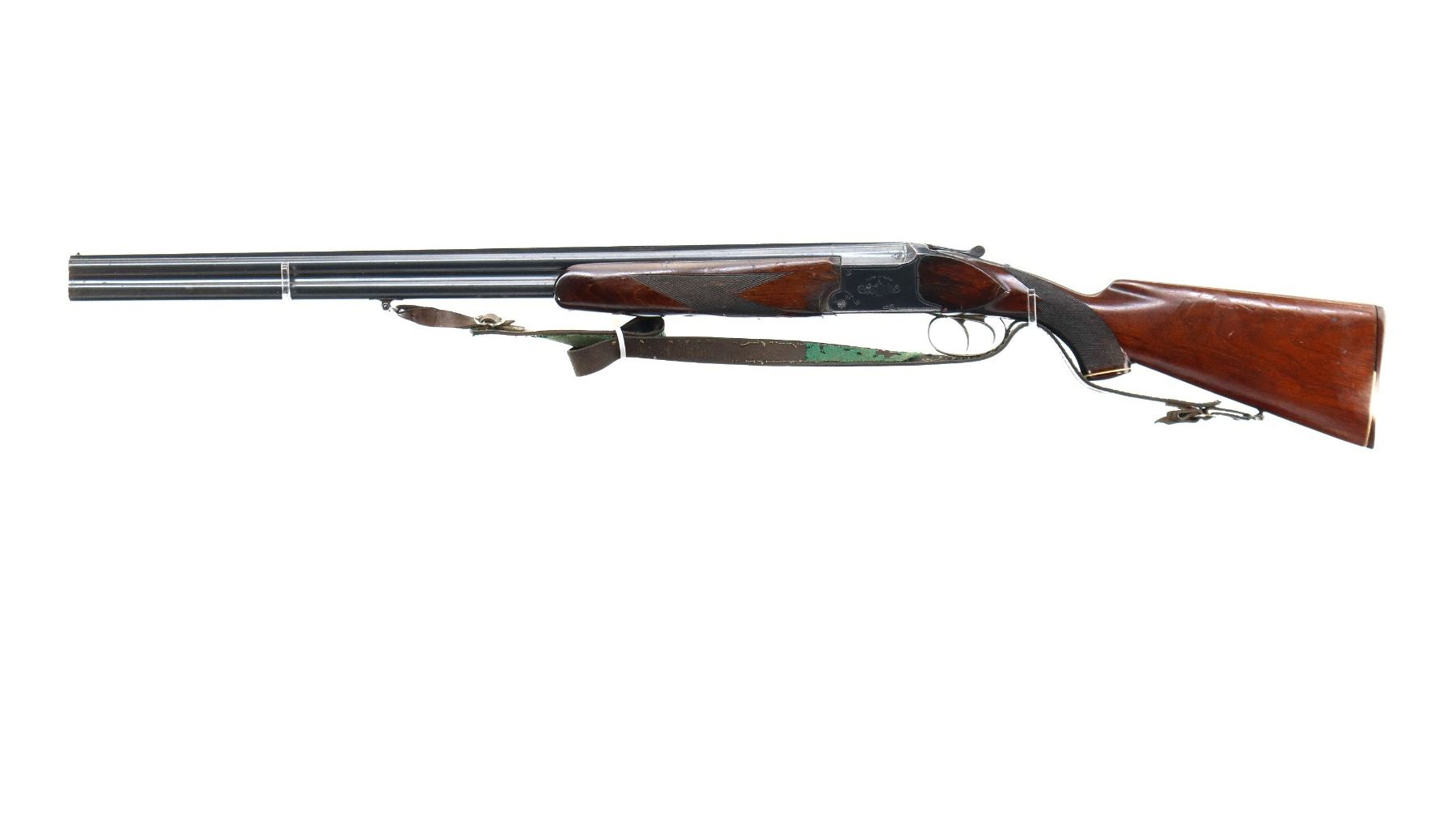Main Description: Brass bead, blued finish, solid rib, engraved receiver, manual safety, missing extractors, has double triggers. Two piece wood stocks, checkered forearm and pistol grip, grooved brown polymer butt plate, white spacer is broken, grip cap, sling swivels with brown leather sling