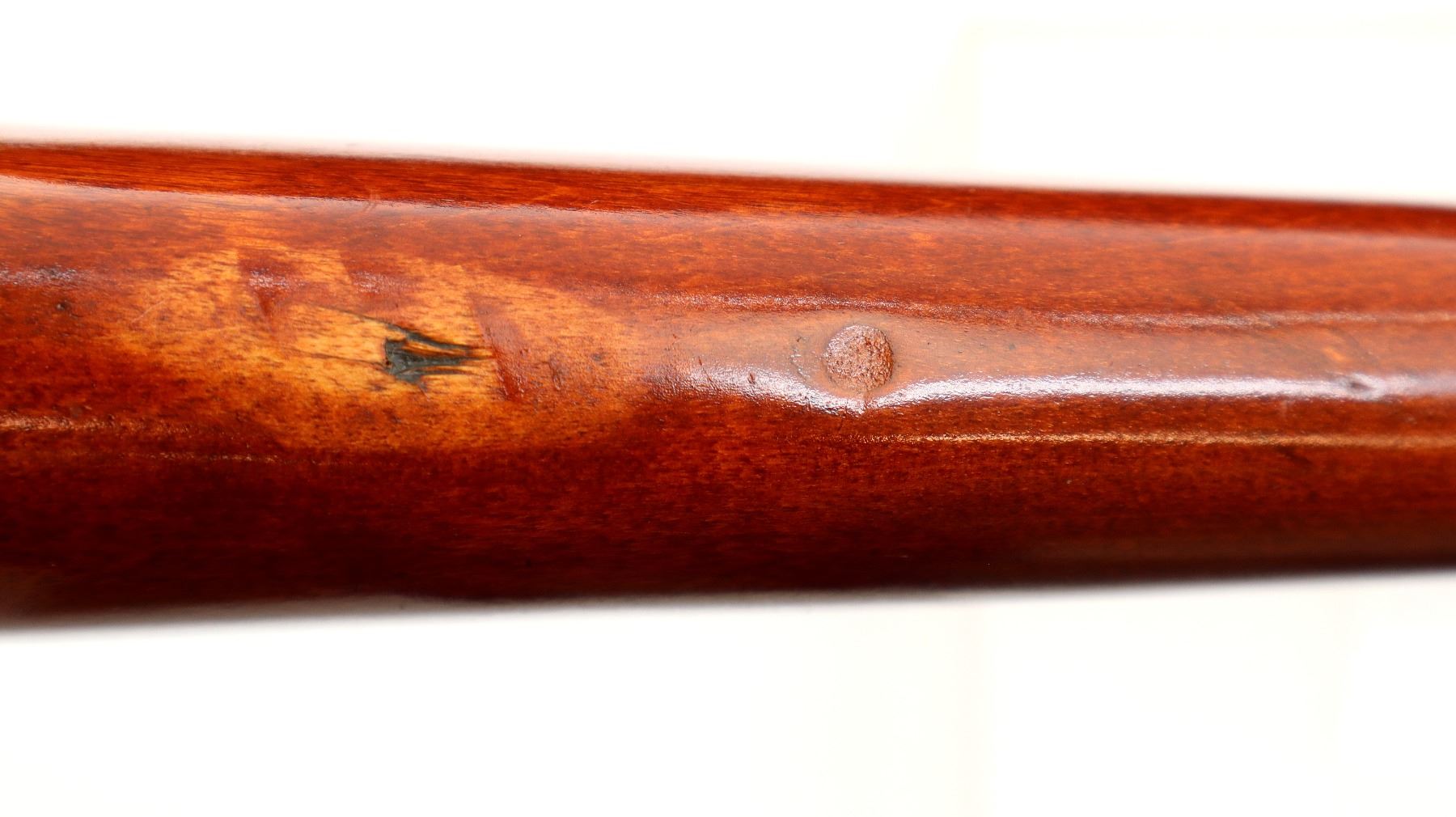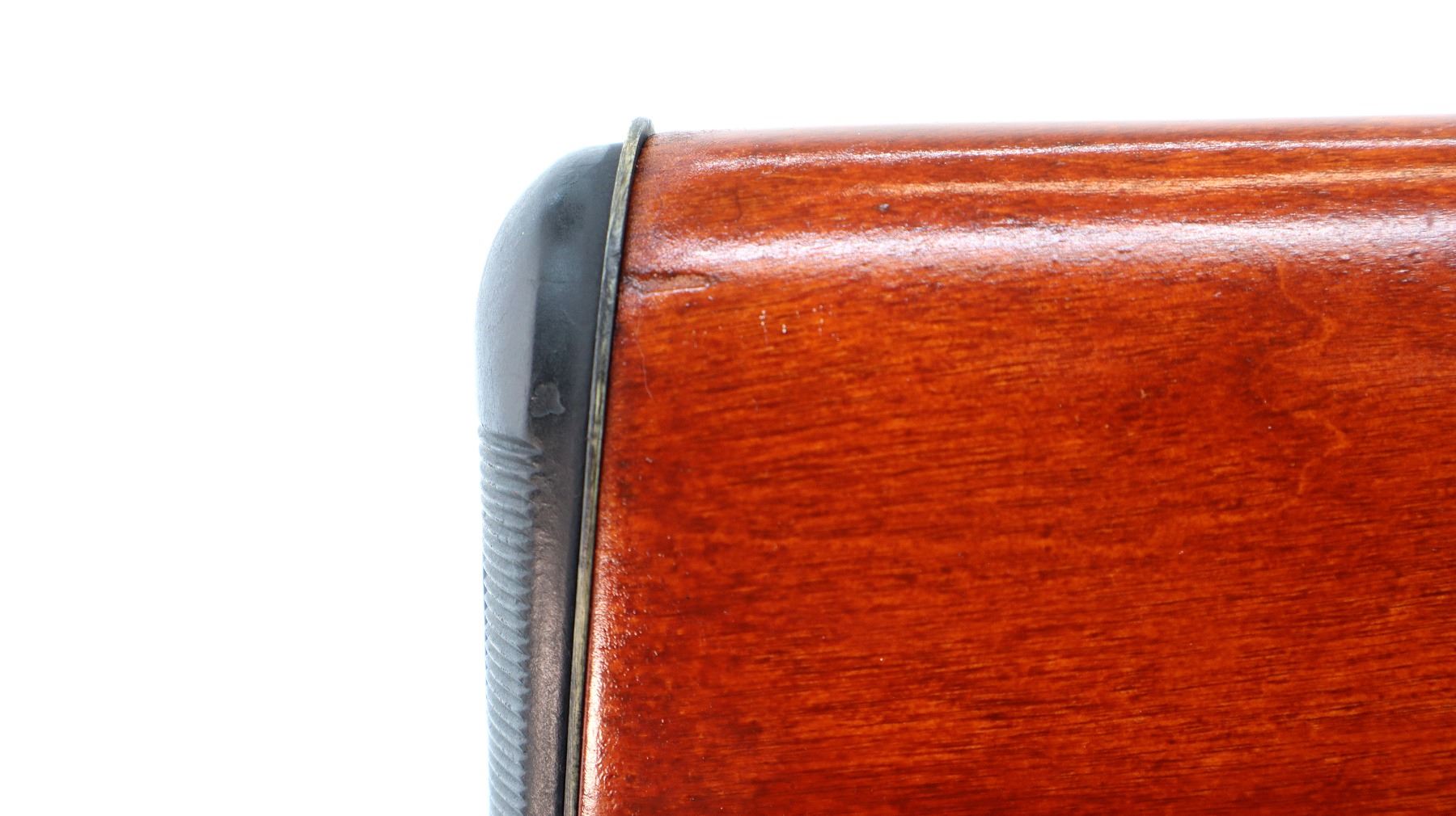 Main Description: Brass bead, metal has been reblued with pitting underneath, round barrel, cocking indicator, extractor, grooved opening lever behind trigger guard. Two piece wood stocks, checkered pistol grip, grooved black polymer butt plate with replaced screws