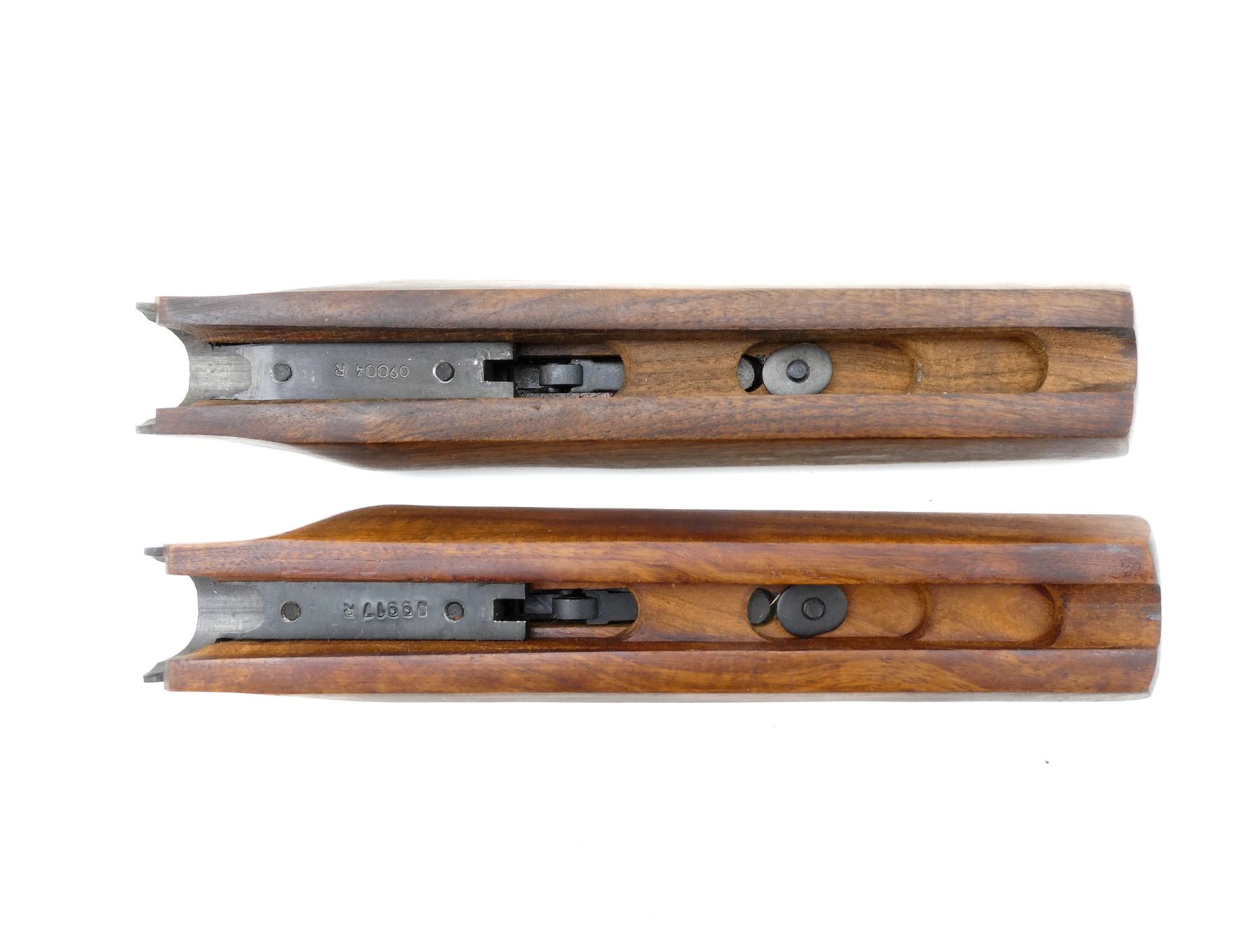 LOT INCLUDES; (2) WOODEN FORENDS, SMOOTH, MARKED: "09917R" & "09004R", MAY HAVE SMALL CRACKS & CHIPS, OVERALL LENGTH APPROX. 9.25". MAY REQUIRE FITTING. SEE PHOTOS.