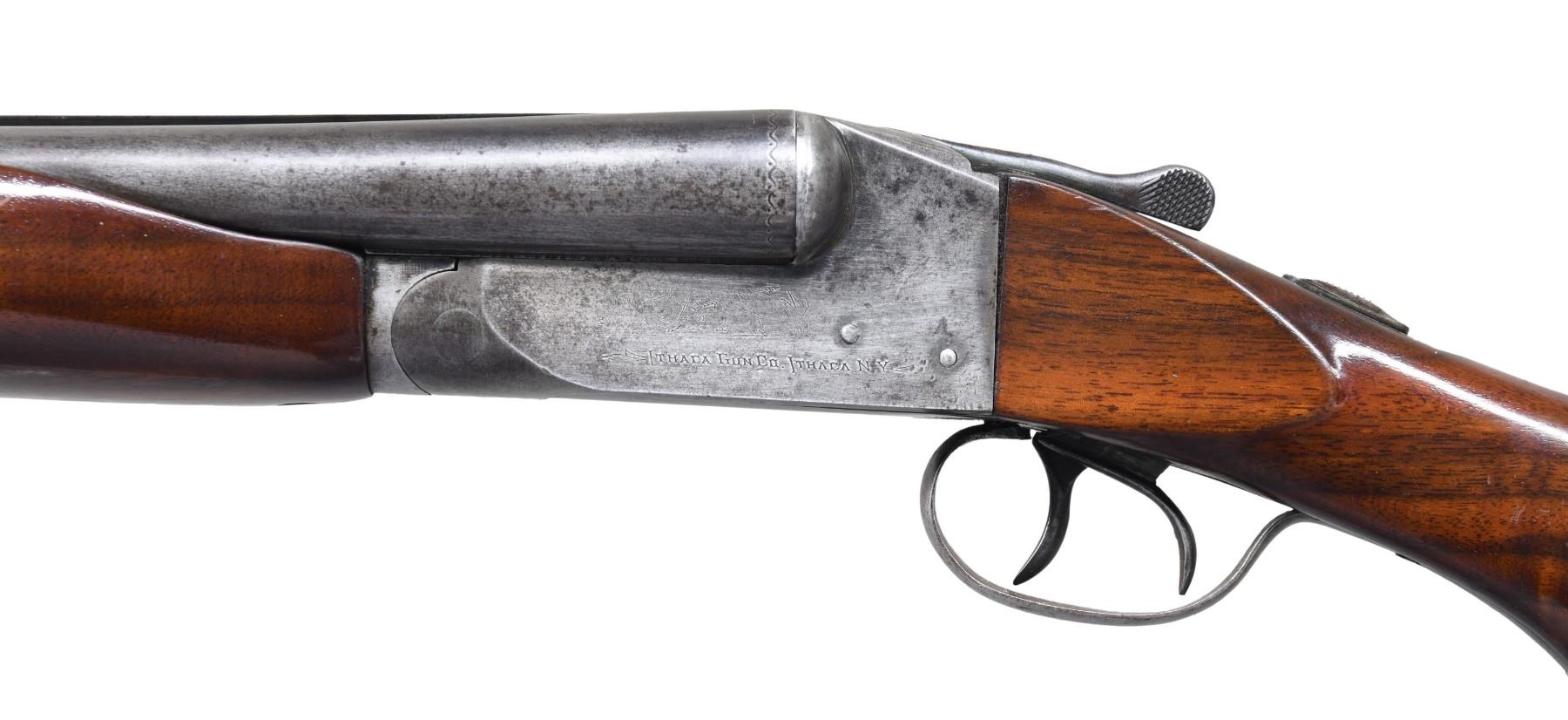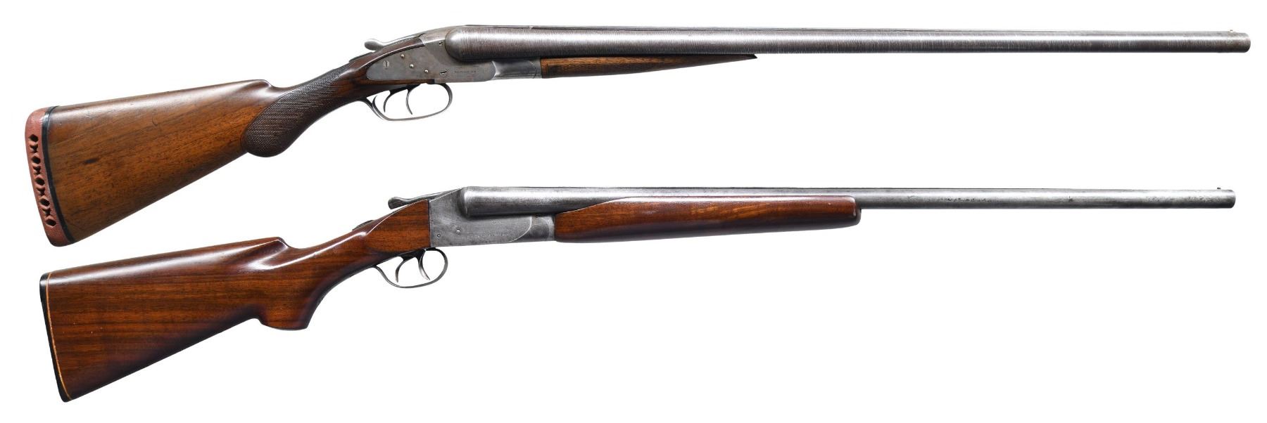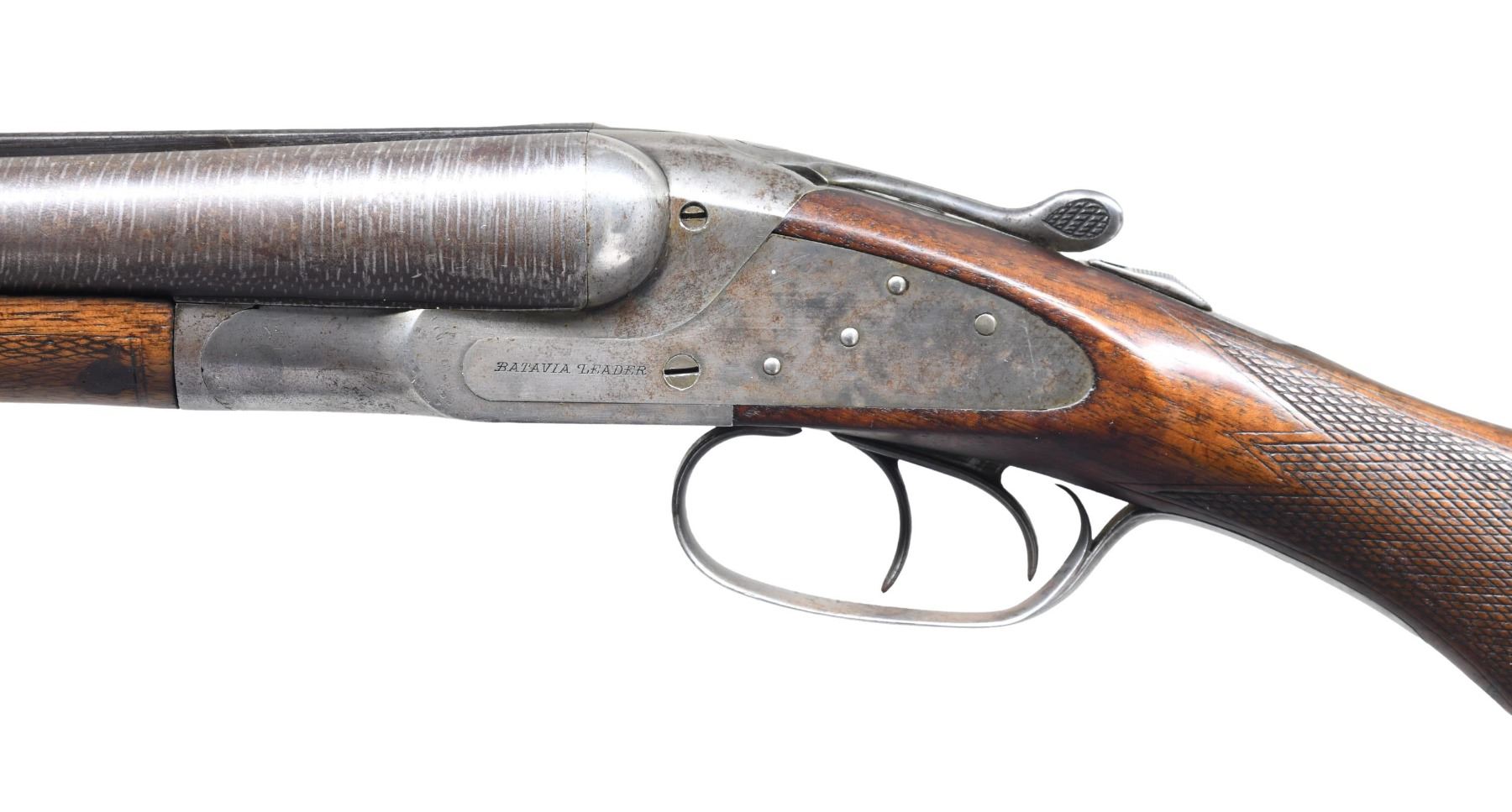 1) BAKER CO. BATAVIA LEADER. Cal. 12 Ga. S# 79748. London Twist 29 3/4" barrels have brass bead. Bore choke measures Mod & Full. Sidelock action with dbl. triggers, extractors. English walnut stock set. LOP: 13 7/8" to replacement red pad. CONDITION: Fair metal finish having gray patina appearance with scattered spots of oxidation. Fair worn finish on wood with worn checkering, marks, large crack on forearm. Bores show pitting. (25-1444/MD). 2) ITHACA FLUES MODEL FIELD. Cal. 16 Ga. S# 382943. Mfg. 1924. The 28" barrels have brass bead. Bore chokes measure Full & Mod. Boxlock action with double triggers, extractors & auto-safety. Replacement walnut stock set with Fajen buttplate. CONDITION: metal has gray patina with blue in protected areas, marks & scratches. Good wood set with scuffs. Bores show light fouling. (25-1452/MD). ALL MODERN. $400-600.