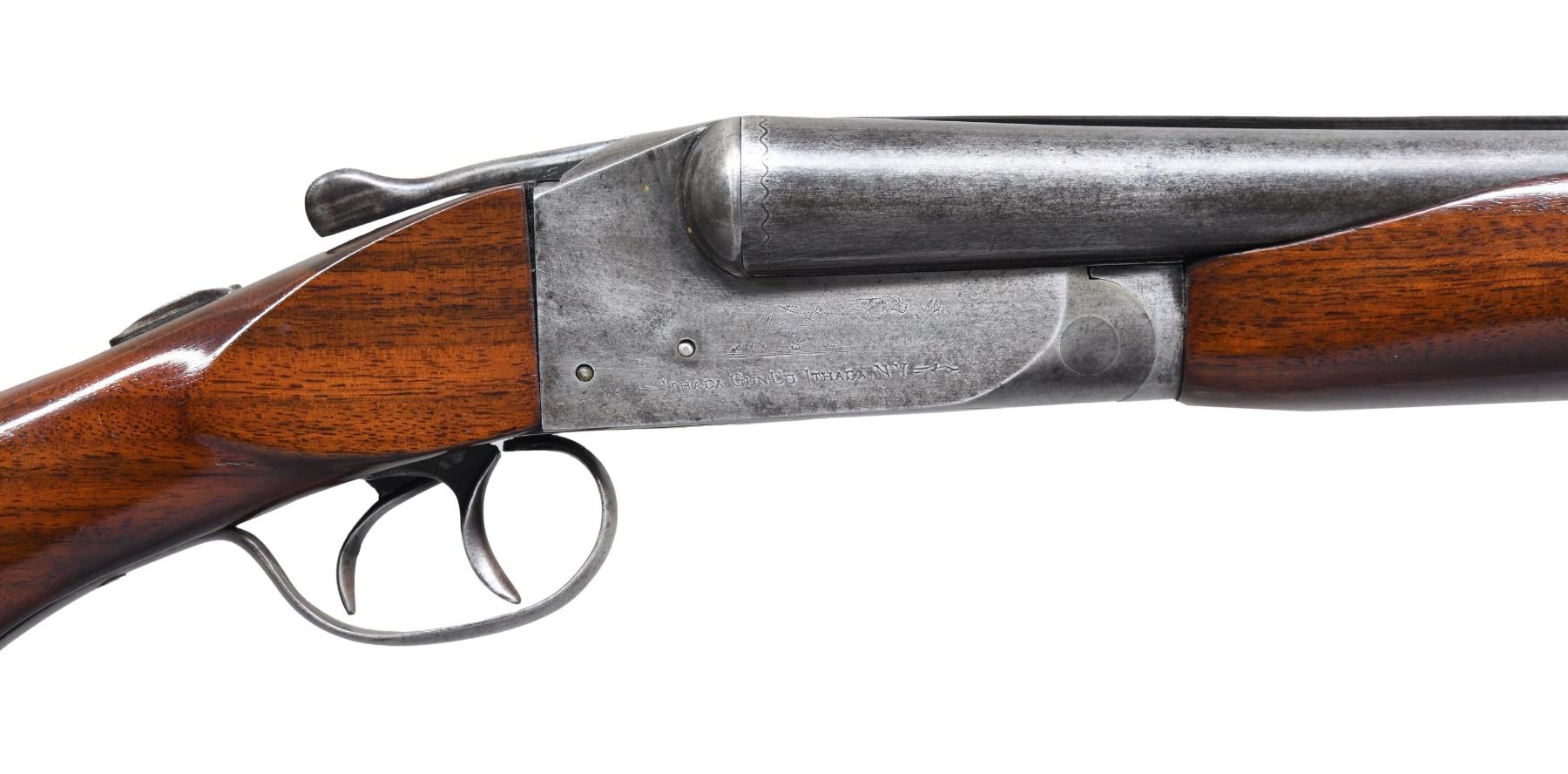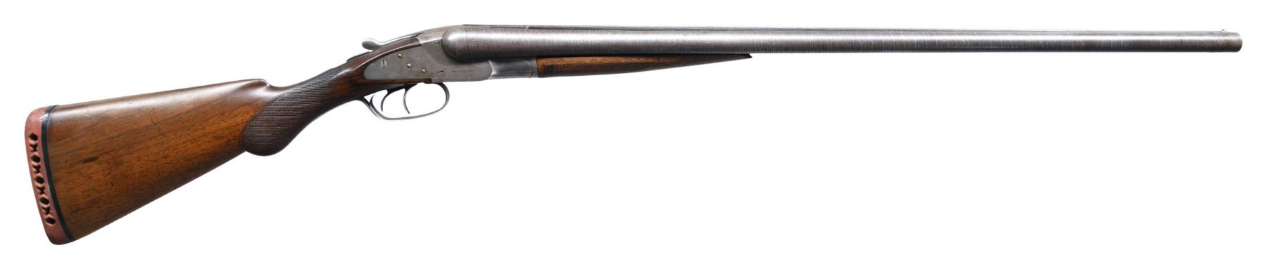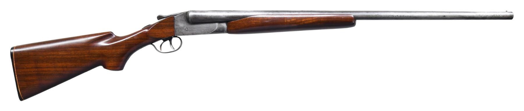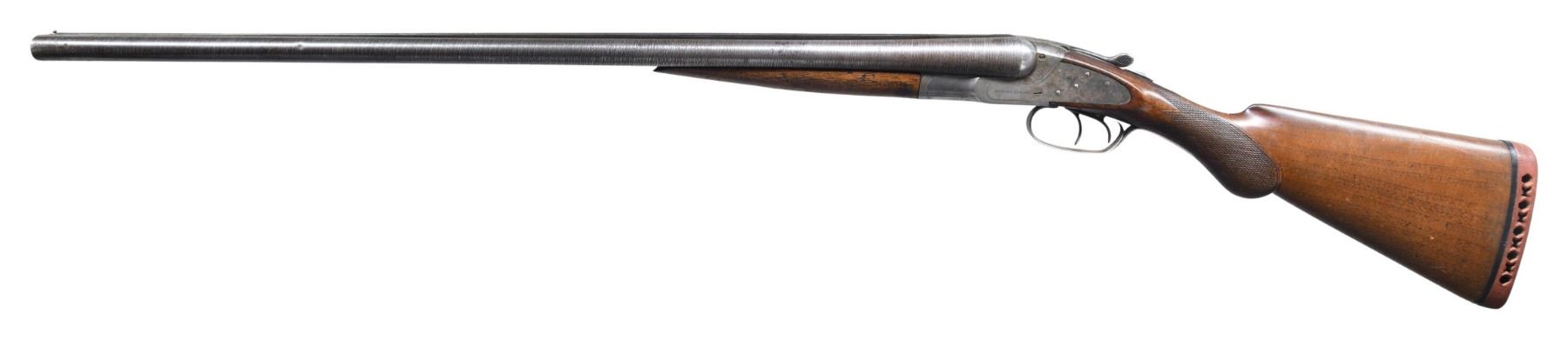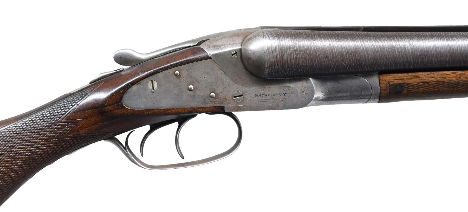 1) BAKER CO. BATAVIA LEADER. Cal. 12 Ga. S# 79748. London Twist 29 3/4" barrels have brass bead. Bore choke measures Mod & Full. Sidelock action with dbl. triggers, extractors. English walnut stock set. LOP: 13 7/8" to replacement red pad. CONDITION: Fair metal finish having gray patina appearance with scattered spots of oxidation. Fair worn finish on wood with worn checkering, marks, large crack on forearm. Bores show pitting. (25-1444/MD). 2) ITHACA FLUES MODEL FIELD. Cal. 16 Ga. S# 382943. Mfg. 1924. The 28" barrels have brass bead. Bore chokes measure Full & Mod. Boxlock action with double triggers, extractors & auto-safety. Replacement walnut stock set with Fajen buttplate. CONDITION: metal has gray patina with blue in protected areas, marks & scratches. Good wood set with scuffs. Bores show light fouling. (25-1452/MD). ALL MODERN. $400-600.