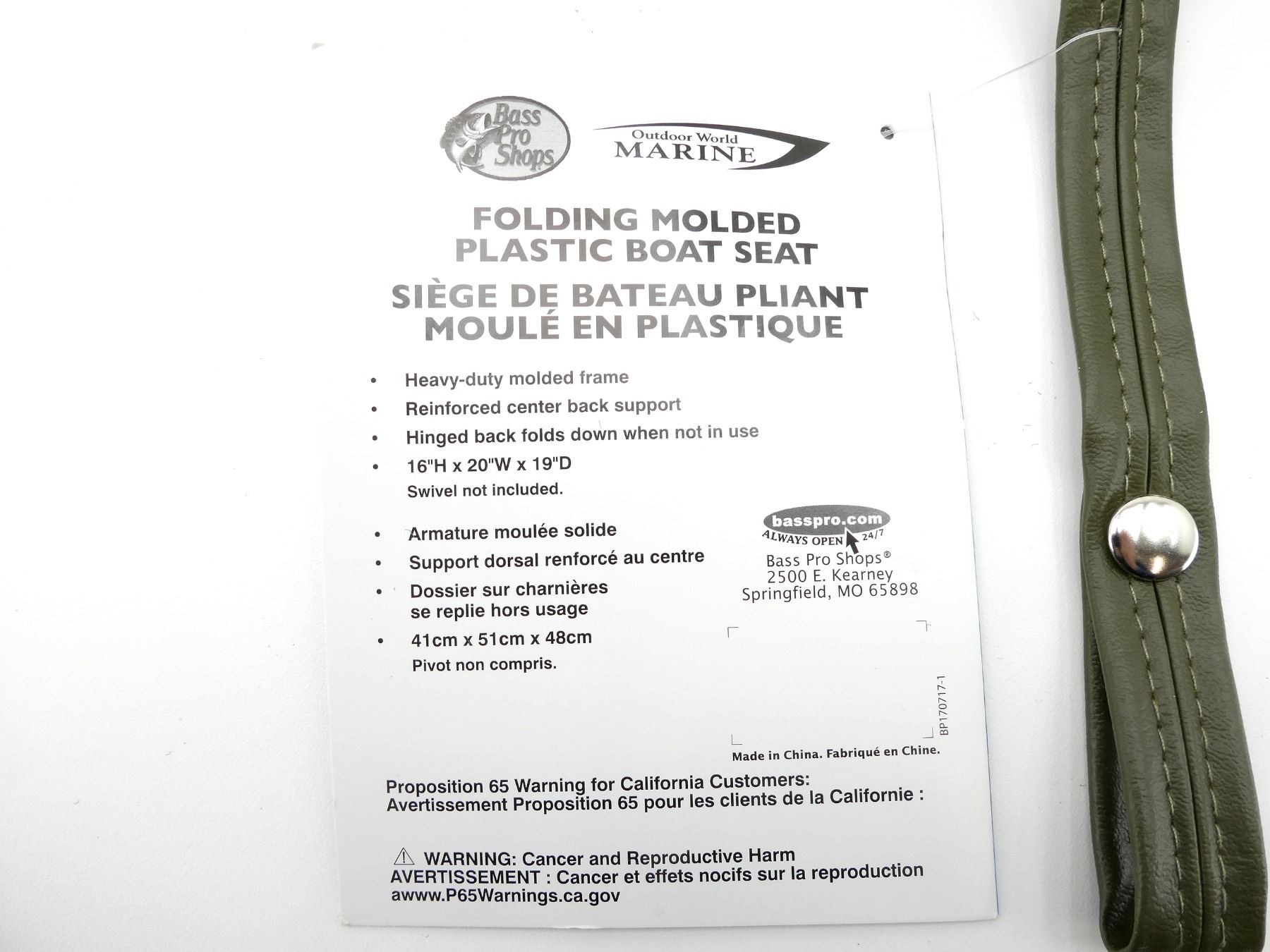 LOT INCLUDES; (1) BASS PRO SHOPS OUTDOOR WORLD MARINE FOLDING BOAT SEAT, POLYMER CONSTRUCTION, WITH CARRY HANDLE, APPEARS NEW OLD STOCK, OVERALL LENGTH APPROX. 16" X 20" X 19" & (1) BASS PRO SHOPS OUTDOOR WORLD MARINE QUICK-RELEASE SEAT SWIVEL, POLYMER CONSTRUCTION, 360 DEGREES, RUST-FREE PERFORMANCE, NEW OLD STOCK, SEALED IN ORIGINAL PACKAGING. SEE PHOTOS.