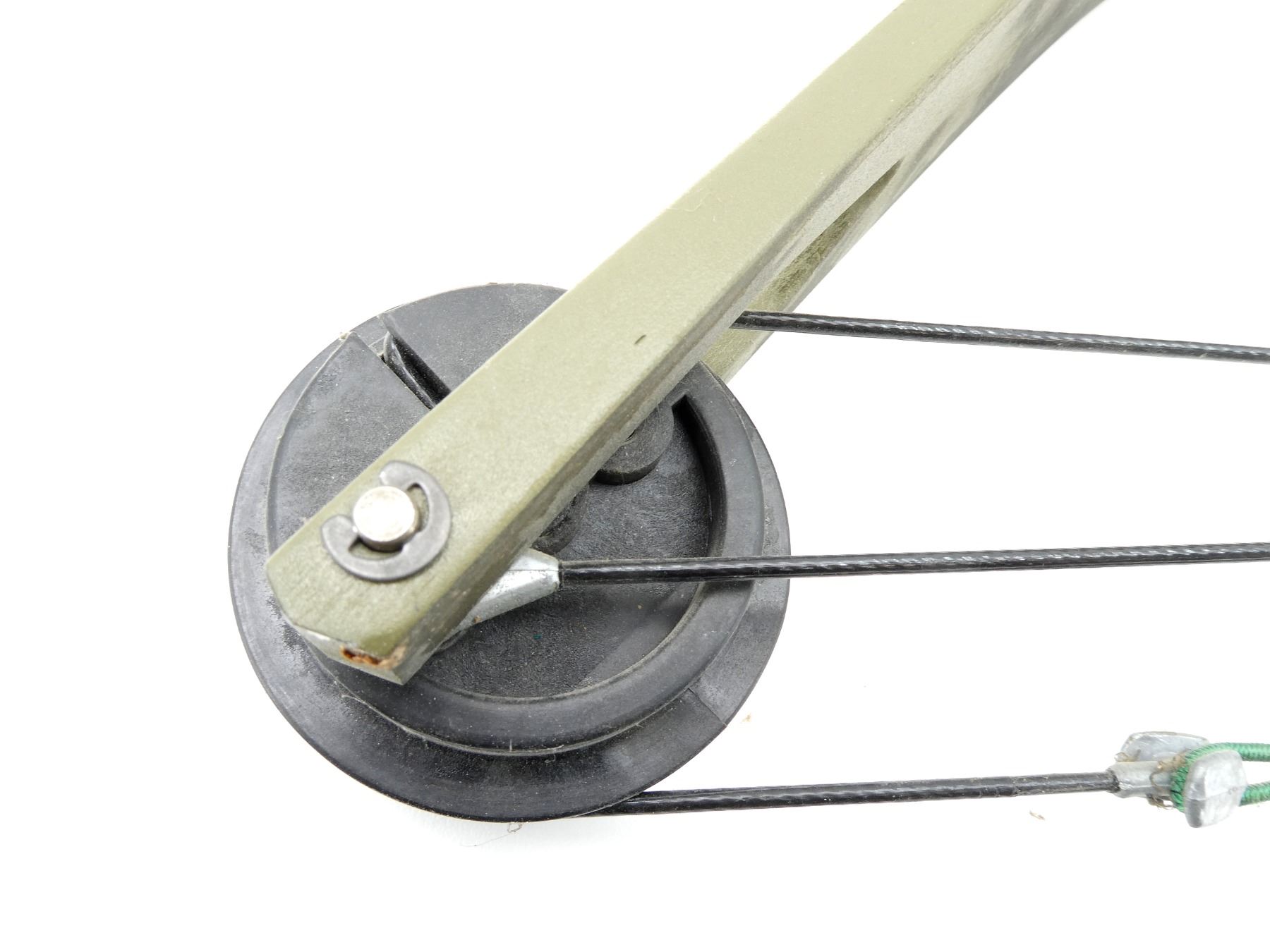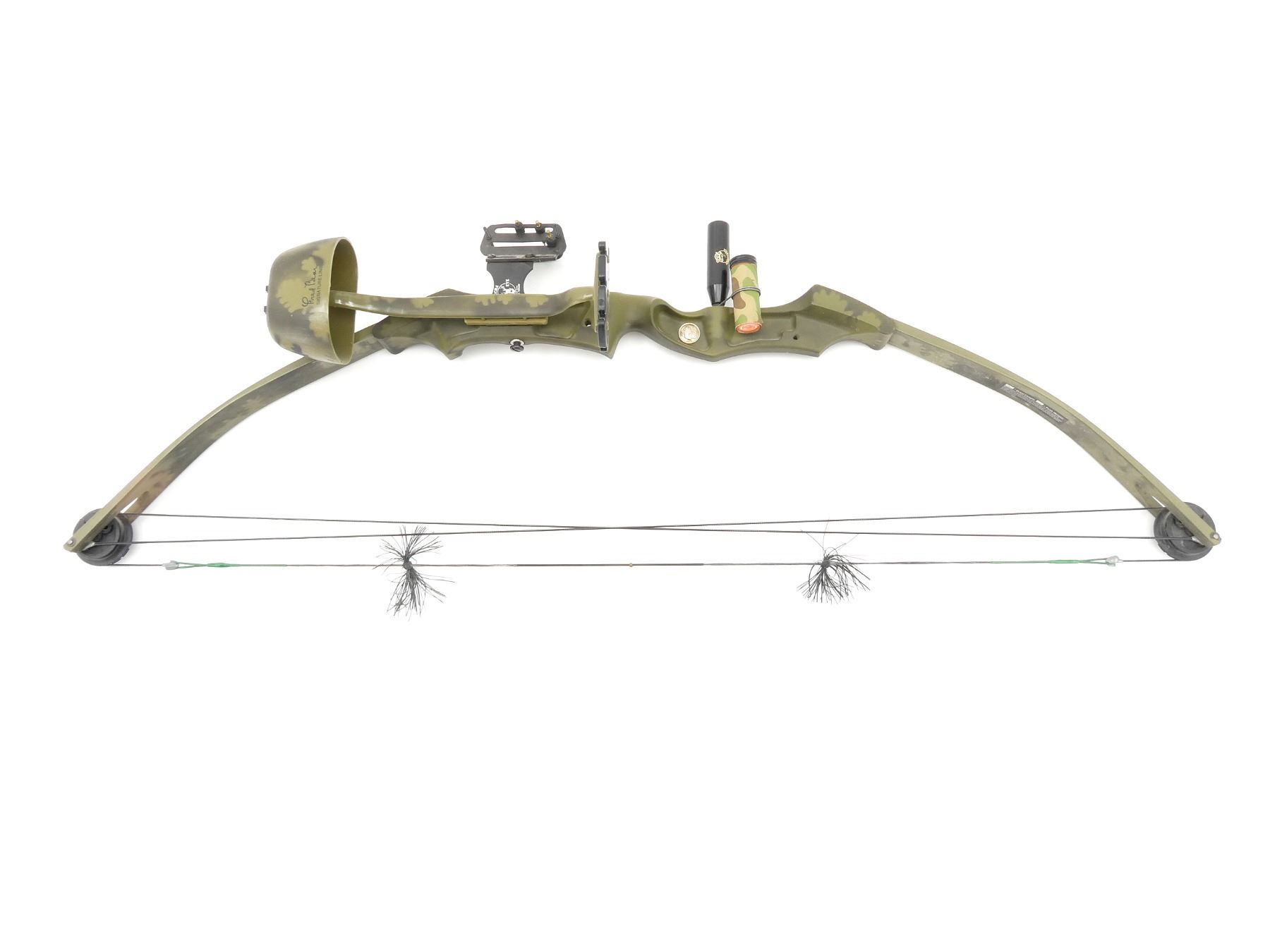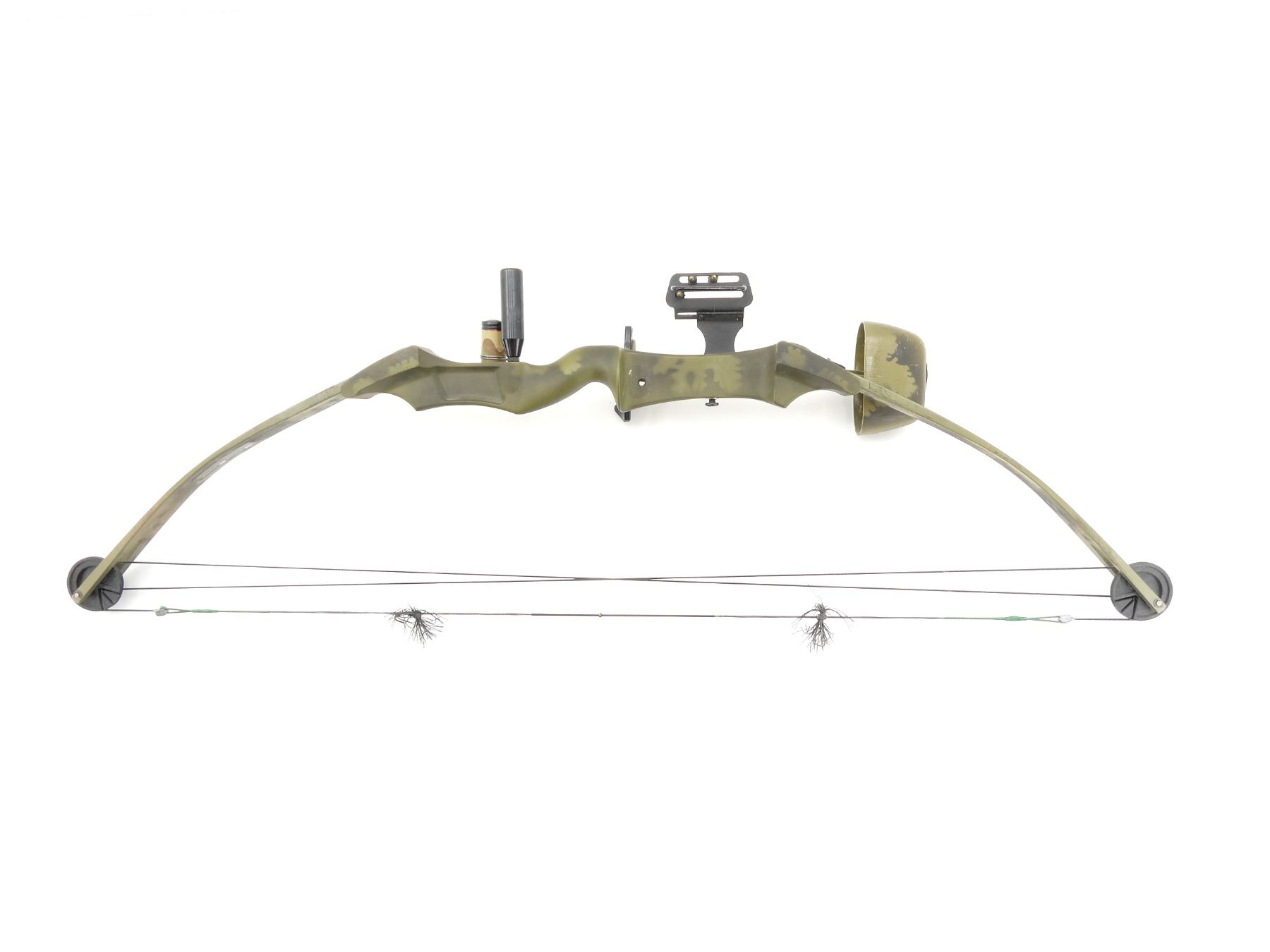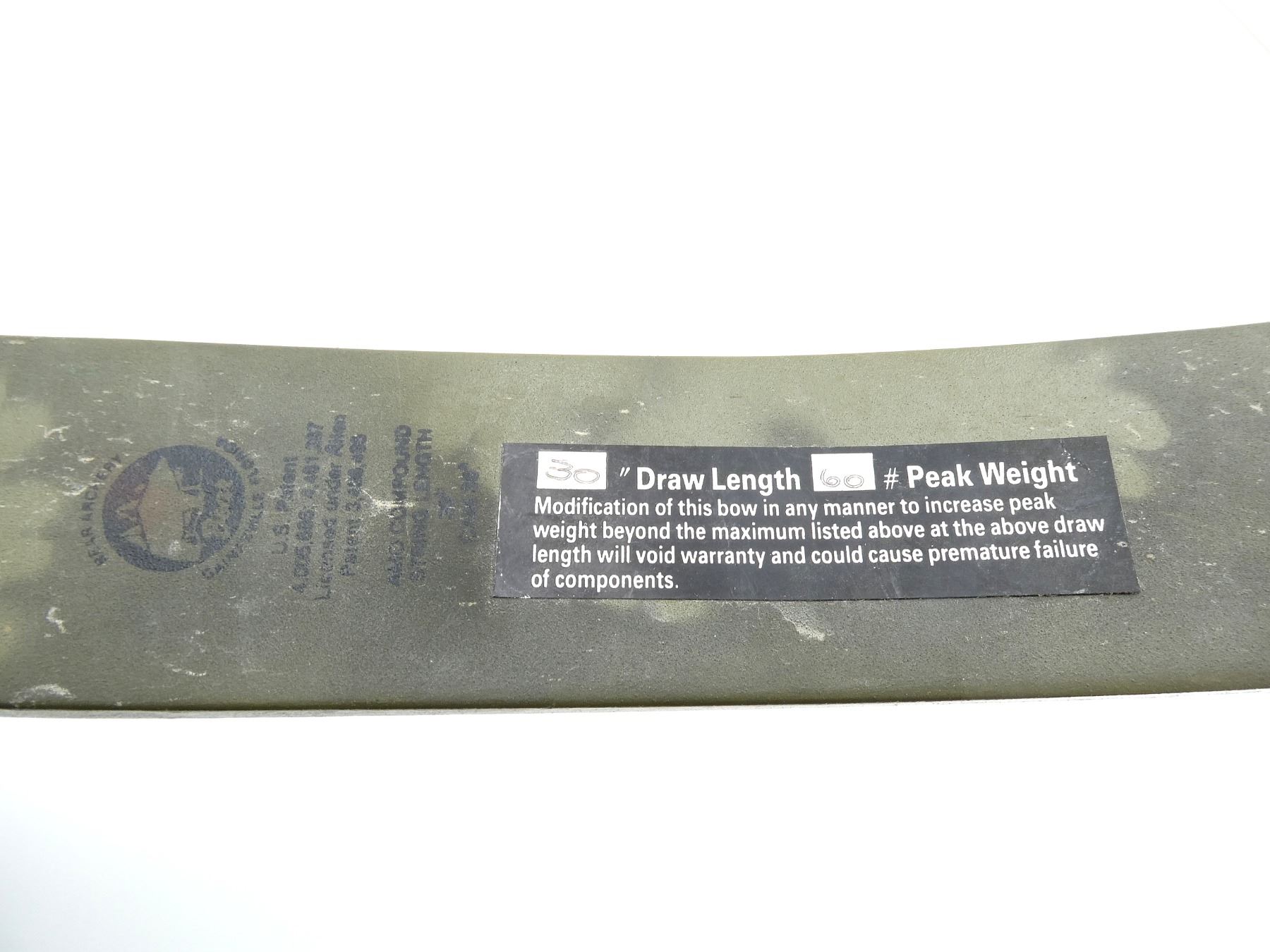 LOT INCLUDES; (1) GREEN CAMO BEAR WHITETAIL II RIGHT HAND COMPOUND BOW, PEAK WEIGHT 60#, DRAW LENGTH 30", (1) STRING, (1) (6) ARROW QUIVER, (1) ACCRA BUCK EYE (3) PIN SIGHT,(1) COBRA STABILIZER, ETC., APPROX. OVERALL LENGTH 48", SHOWS WEAR AND TEAR FROM USAGE, SEE PHOTOS.