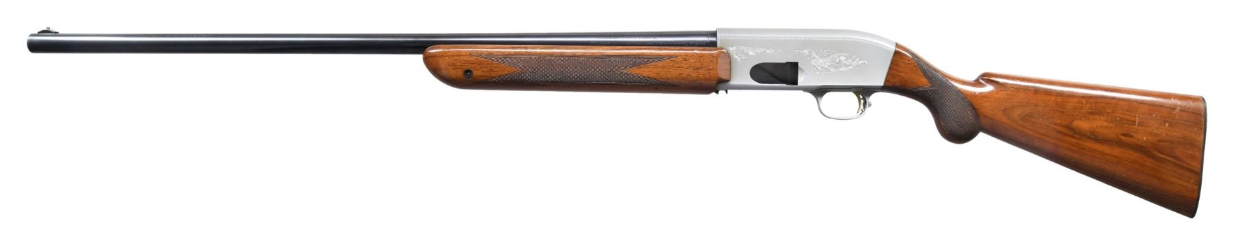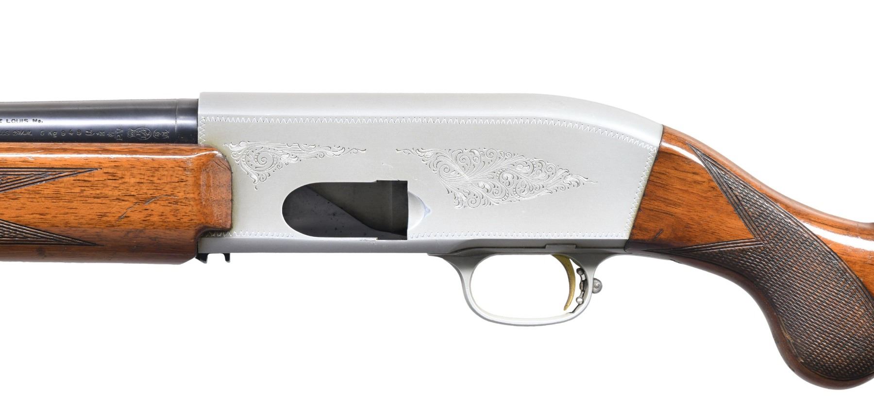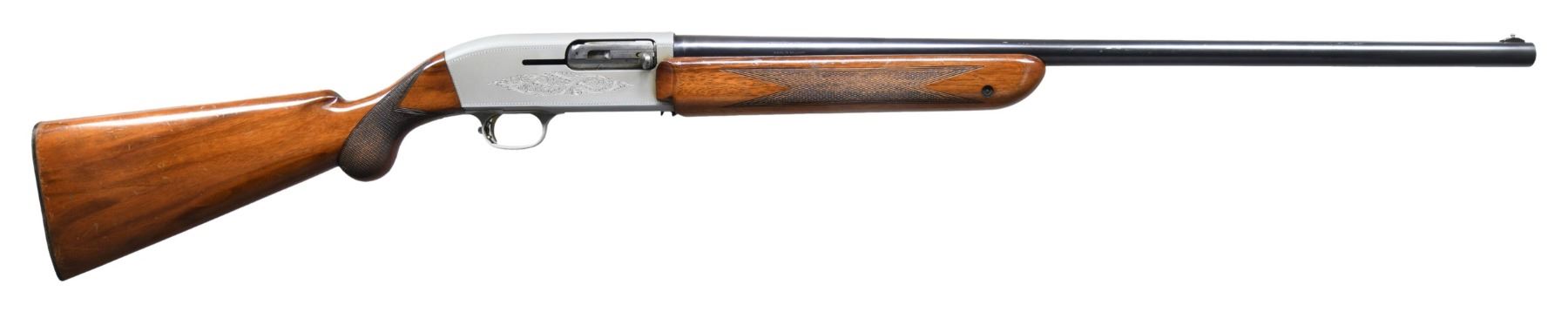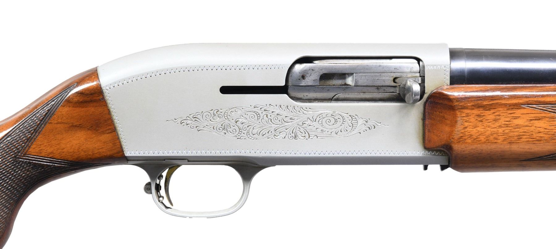 AUTO SHOTGUN. Cal. 12 Ga., 2 3/4". S# A12764. Mfg. 1952-1956. Matted 27.5" barrel with bright bead on base & matting on top. Velvet gray finished aluminum receiver with scroll & wavy border engraving. Walnut checkered stock set with round knob pistol grip & Browning buttplate. CONDITION: very good blue with series of marks. Very good receiver finish with wear & scratches. Fair wood finish having numerous dings & marks along with sm. chips & spots of worn finish. Shiny bore. (25-1456/MD). CURIO. $400-600.