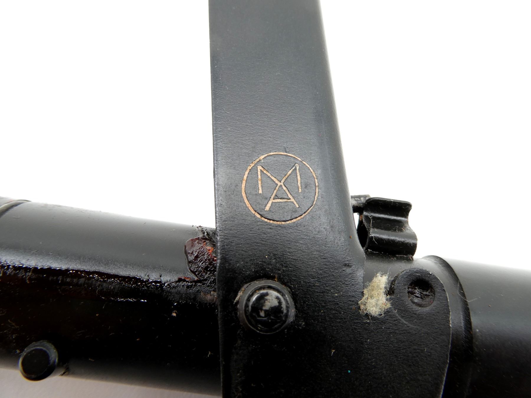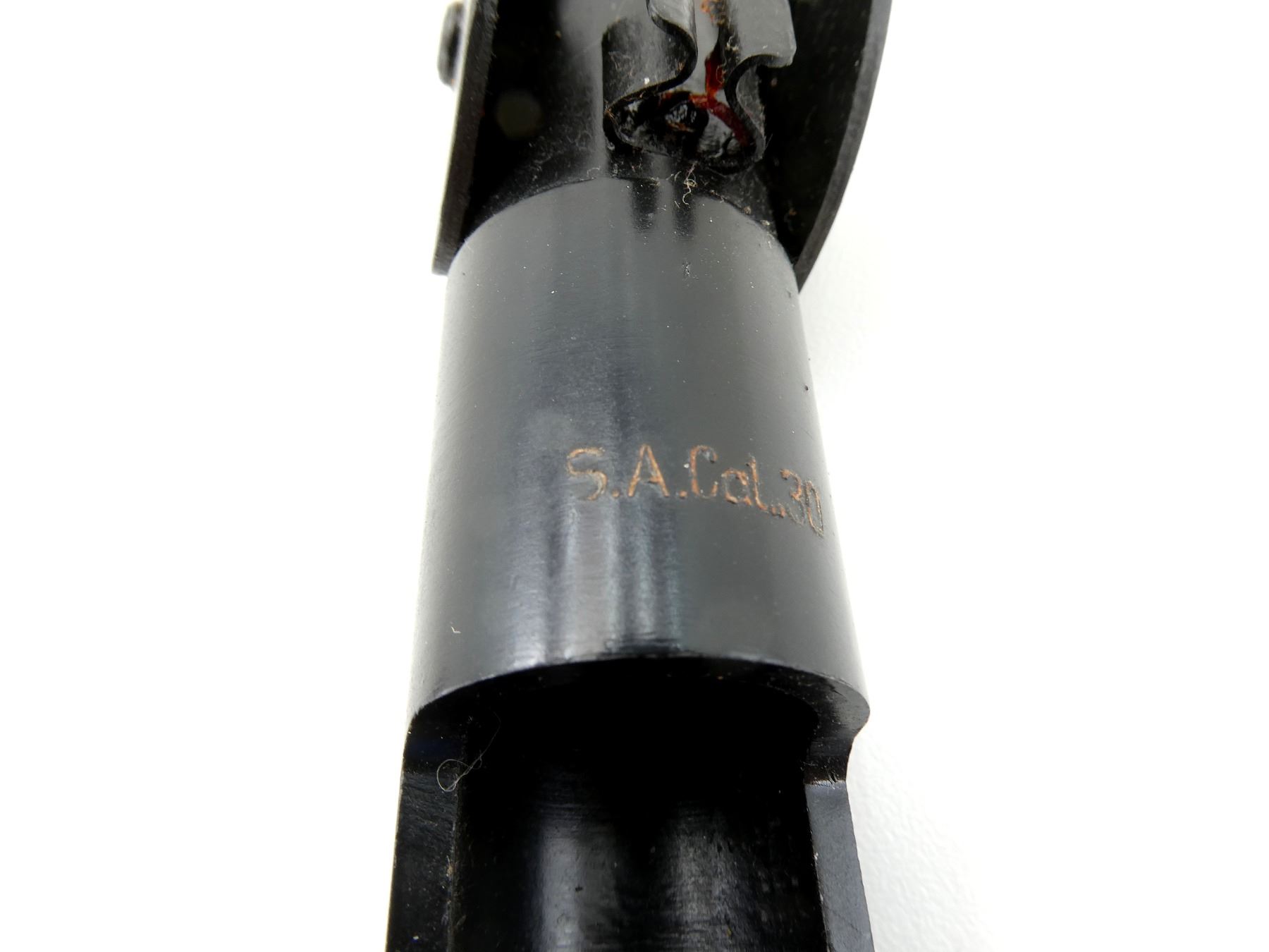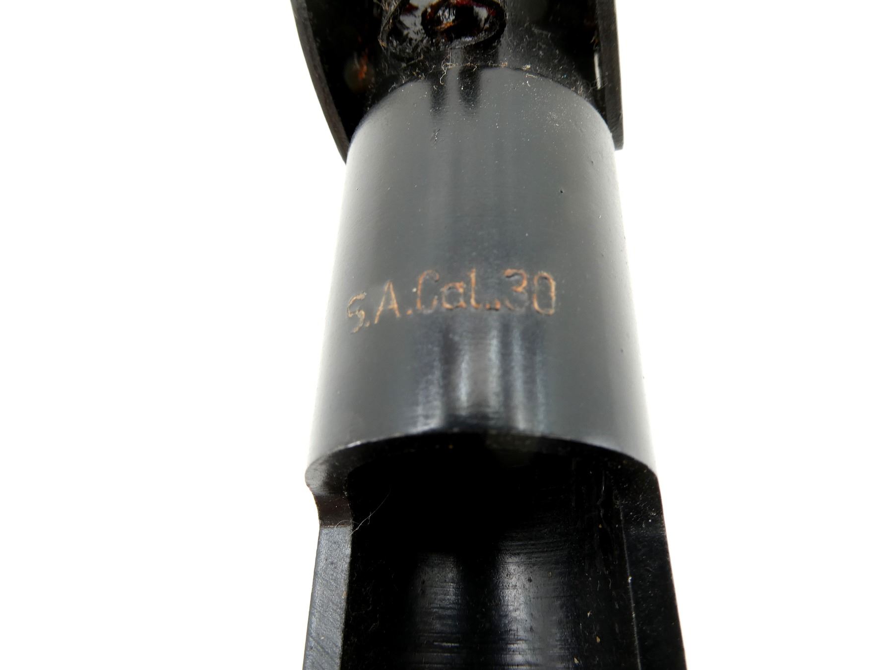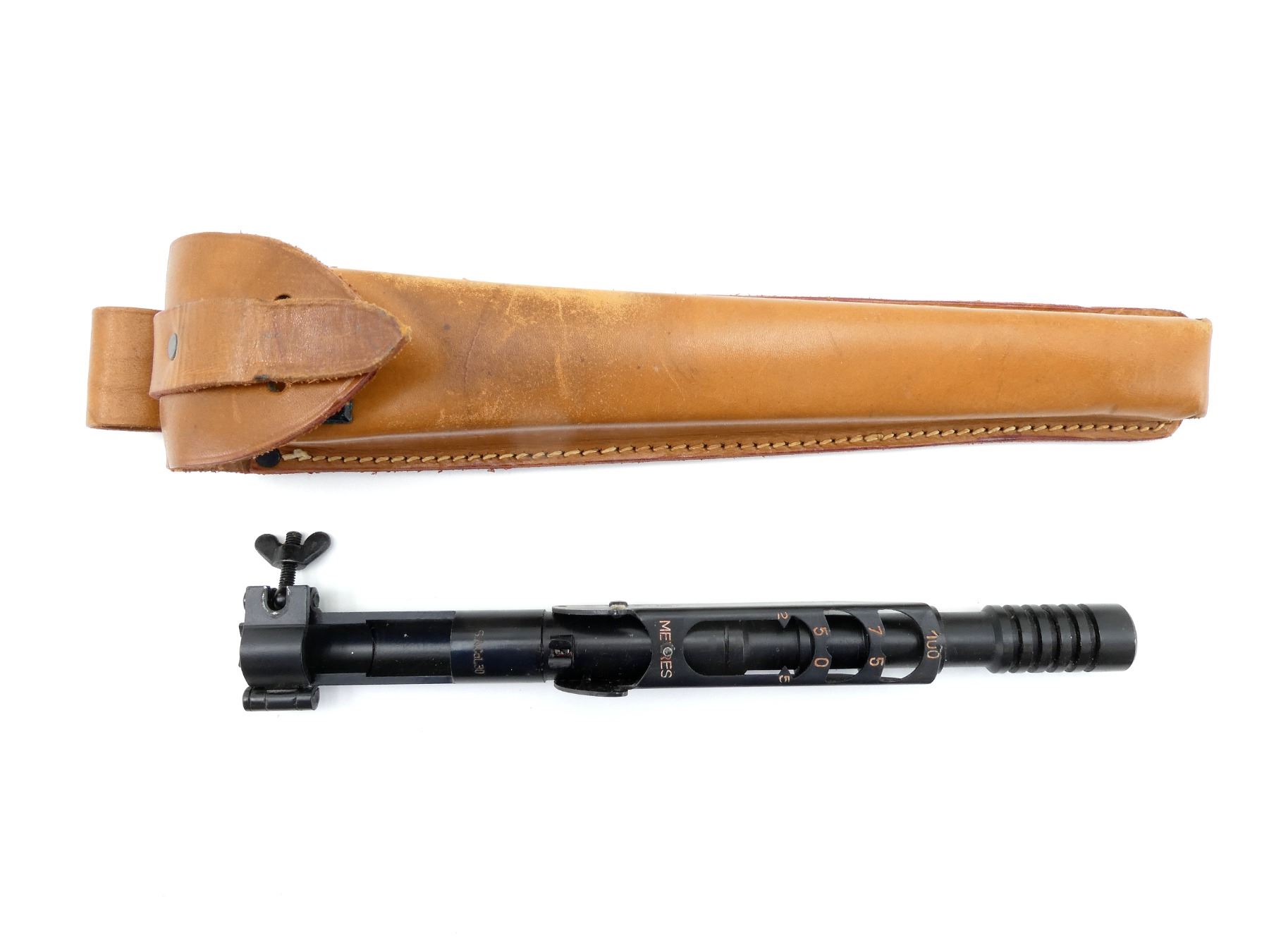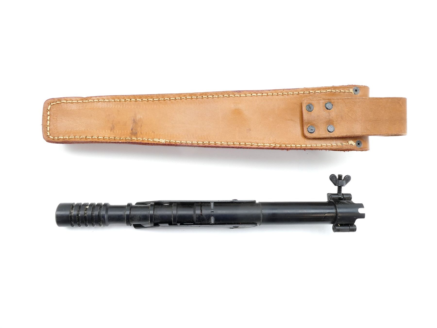 LOT INCLUDES; (1) BLACK PAINTED STEEL .30-06 CAL. FN-49 GRENADE LAUNCHER, MARKED: "S.A.CAL.30" WITH MAKER'S MARK, OVERALL LENGTH APPROX. 11.5" & (1) TAN LEATHER GRENADE LAUNCHER CASE, BELT LOOP, LEATHER TAB CLOSURE, BLACK PAINTED METAL FITTINGS, NO VISIBLE MARKINGS, OVERALL LENGTH APPROX. 12.5". SEE PHOTOS.