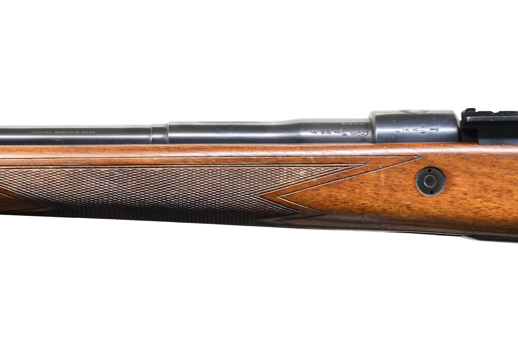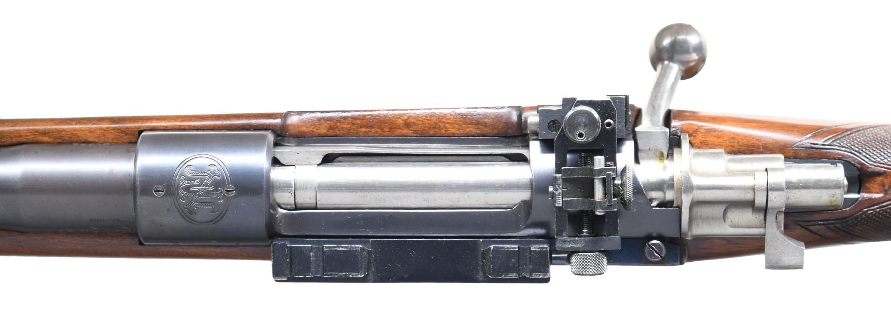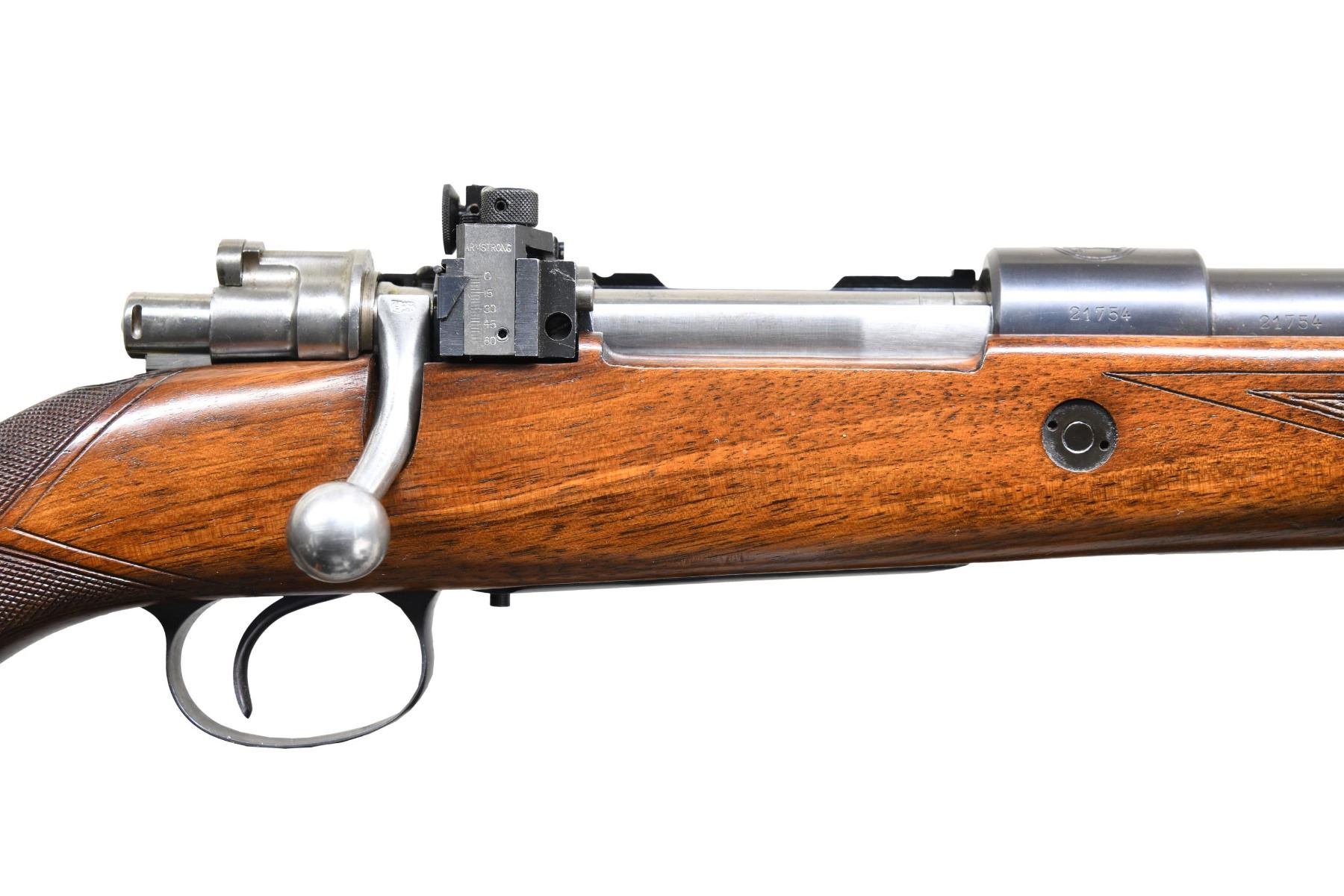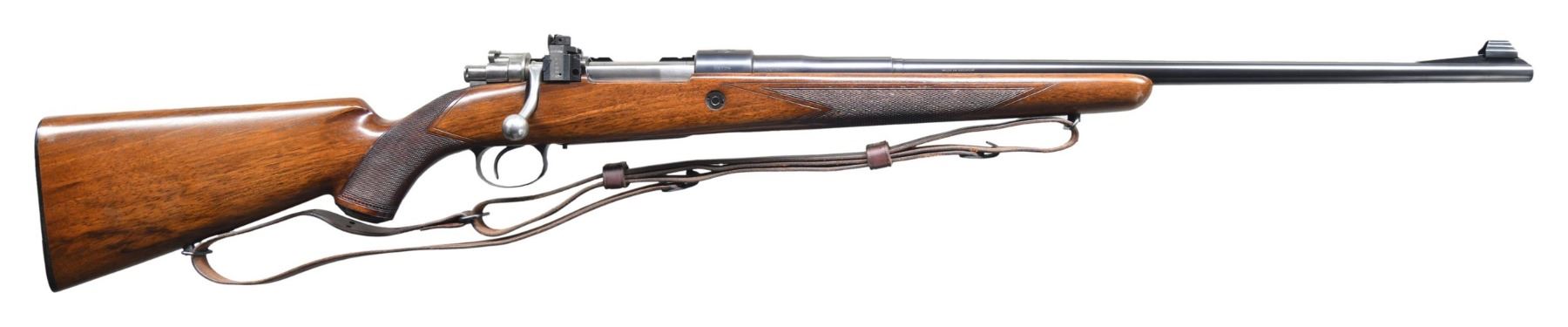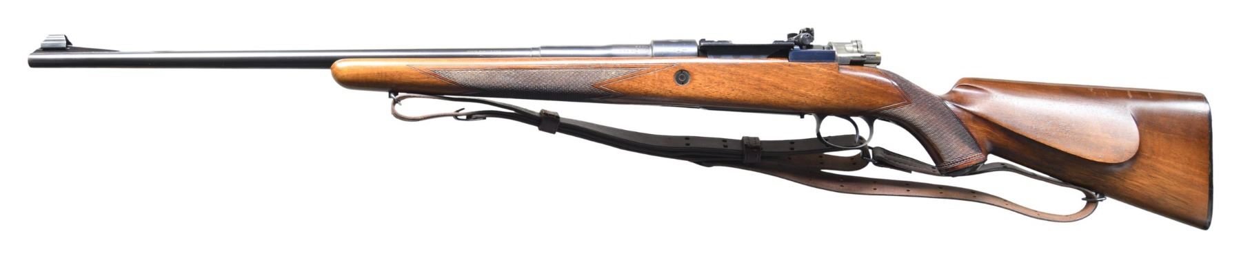 RIFLE. Cal. 270 Win. S# 21754. Mfg. 1947-1963. Chrome Vanadium 24" bbl. Hooded bead front sight & Armstrong receiver sight. Left side of barrel & action have Belgian proofs. Mauser control feed action w/ added Griffin & Howe style side mount, drilled & tapped on receiver ring through FN logo. Bolt has claw extractor, low wing safety, checkered on bolt knob & matching number on handle. Checkered European walnut stock w/ recoil lug, pearls carved at end of grip, Hard rubber grip cap, left side cheekpiece & FN buttplate. Boyt Brown leather sling on swivels. CONDITION: very good blue w/ pinprick oxidation. Very good wood finish with marks. Very good bore. (25-2820/MD). CURIO. $300-500.