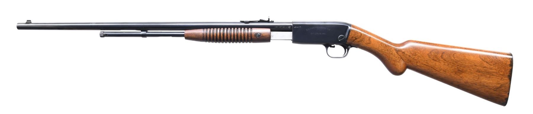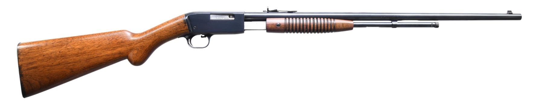 Cal. 22 LR. S# 48636. Barrel 22". Replacement bead front sight & replacement elevator rear sight. Left side of barrel has Belgian Nitro proofs & top of barrel has FN address. Left side of receiver engraved BROWNING ARMS CO. / ST. LOUIS, MO" along with Belgian proofs. Takedown action. Walnut forearm & rnd. knob pistol grip stock with steel buttplate. CONDITION: barrel & receiver has very good reblued finish. Wood has sanded & refinished appearance showing 1 large crack at bottom of forearm along with light handling marks. Good bore. (25-207/MD). CURIO. $400-600.