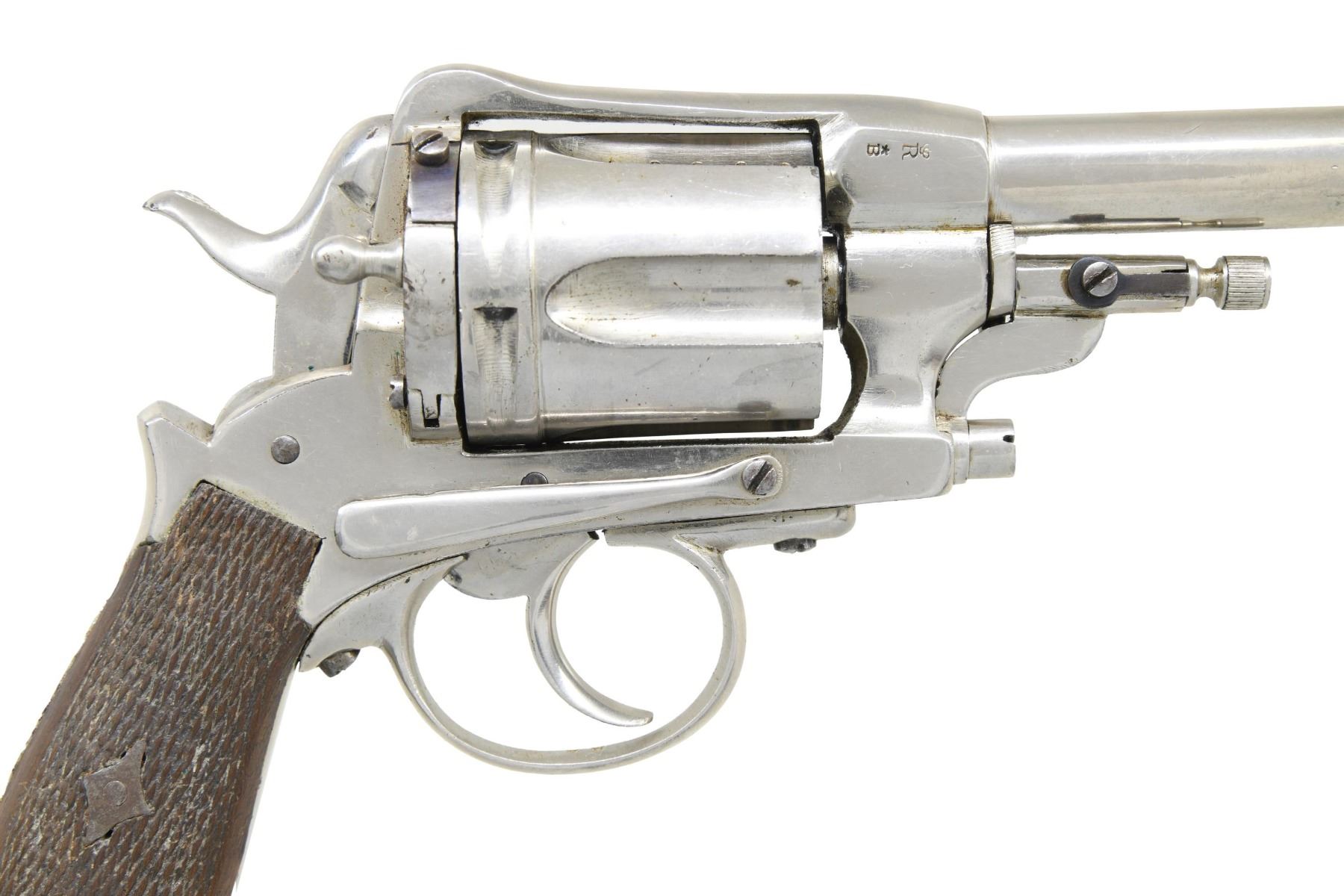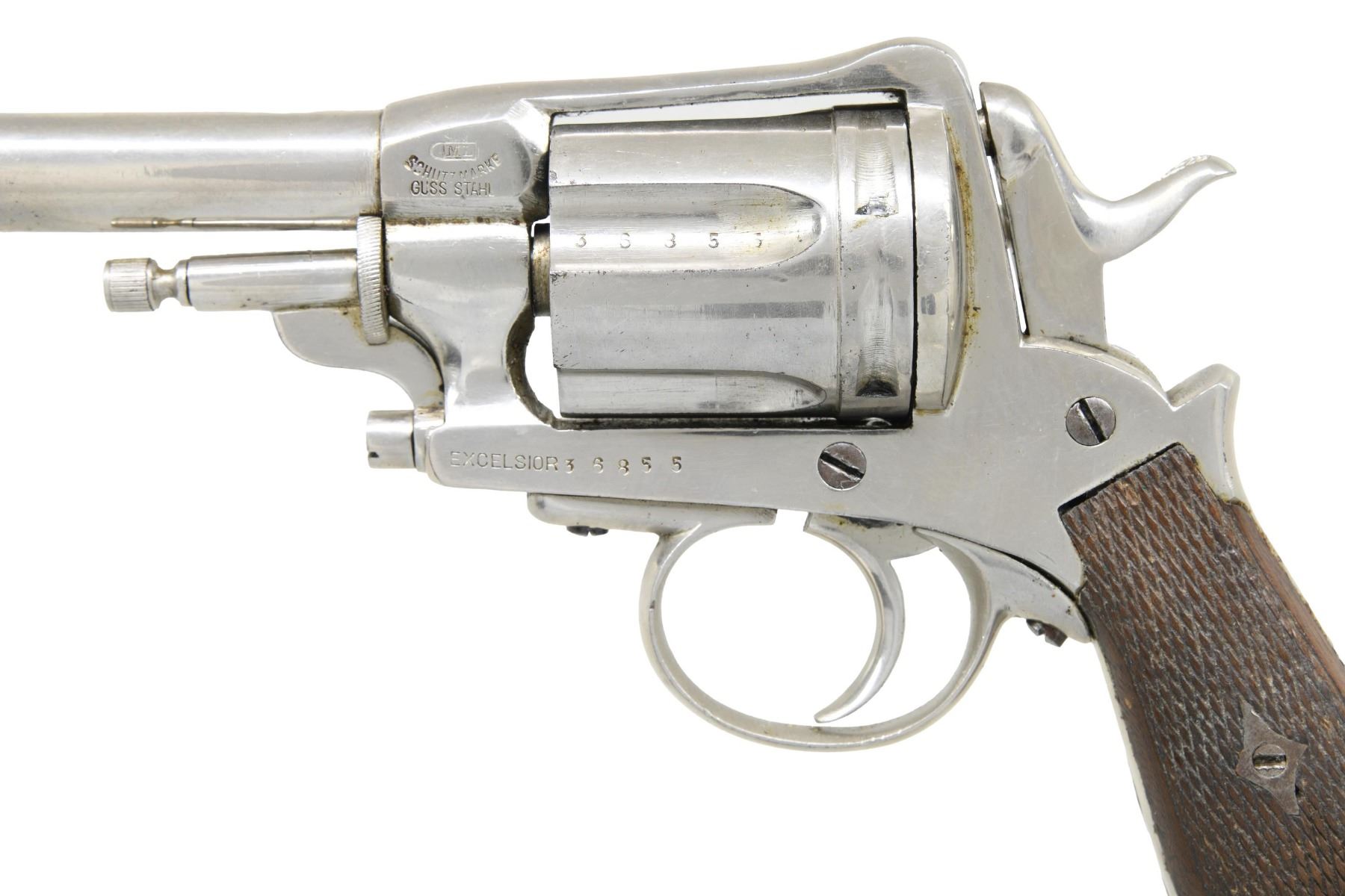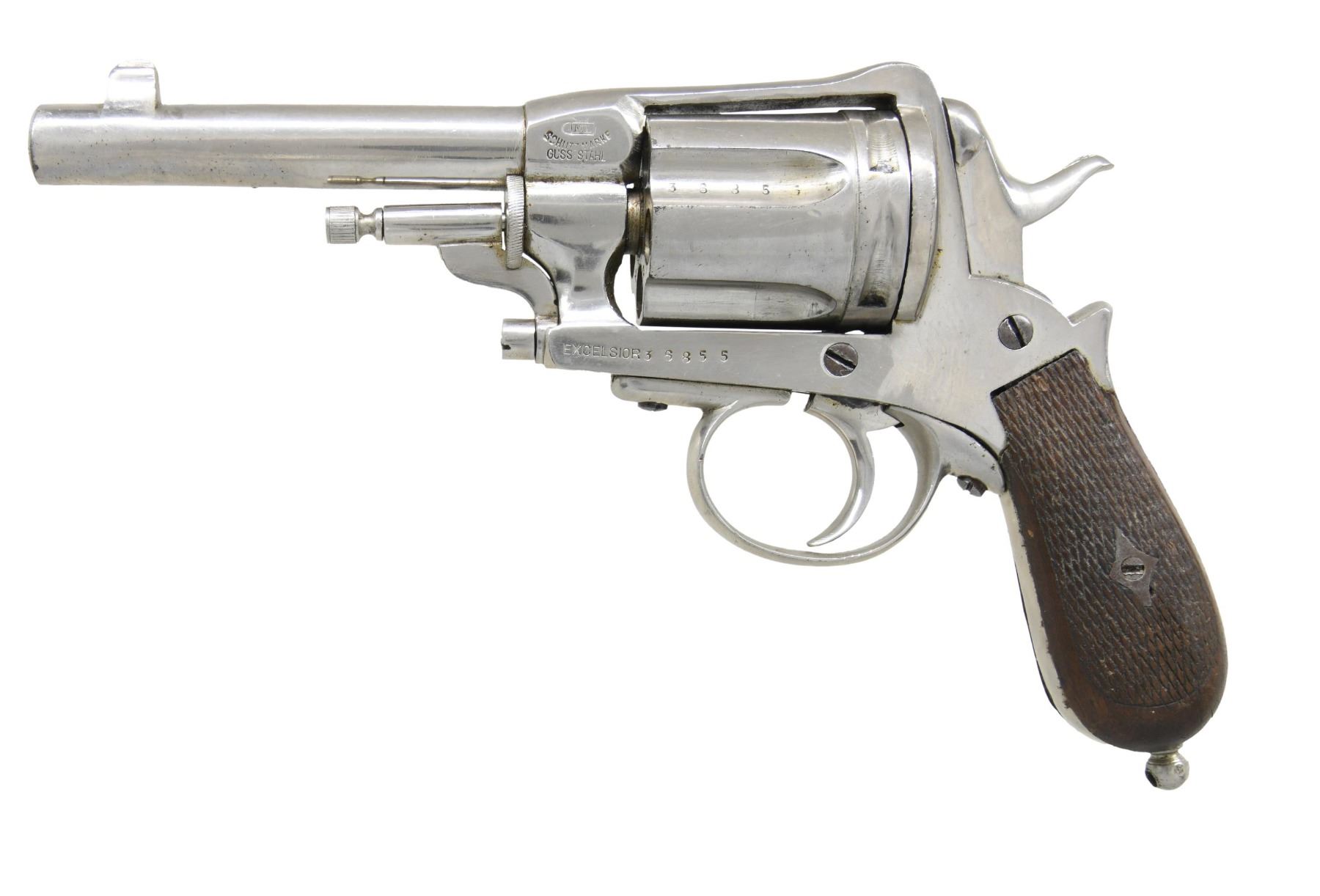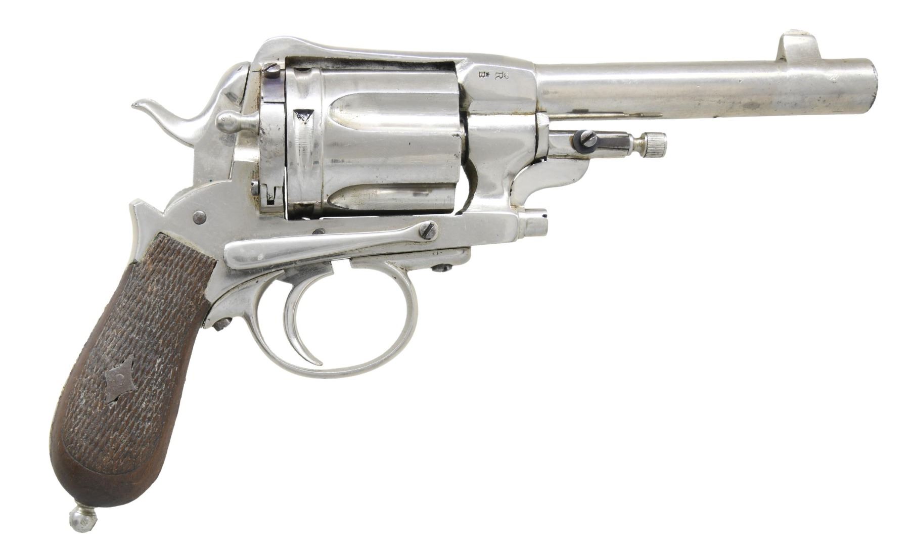 REVOLVER. Cal. 11.3x36mmR. S# 36855. A Belgian commercial version of the Austro-Hungarian Cavalry Gasser M1870 revolver. Bbl. 5" w/ blade front sight sight. Belgian commercial marks on left side of frame & post 1893 Belgian proofs on cyl. 5 Shot fluted cyl. Nickel finish. Lanyard stud on butt. Two piece checkered wood grips. CONDITION: fair nickel finish with patina, marks & scratches. Good grips with gouges & scratches. Bore shows strong rifling & pitting. Mainspring missing. (25-2664/MD). CURIO. $200-300.