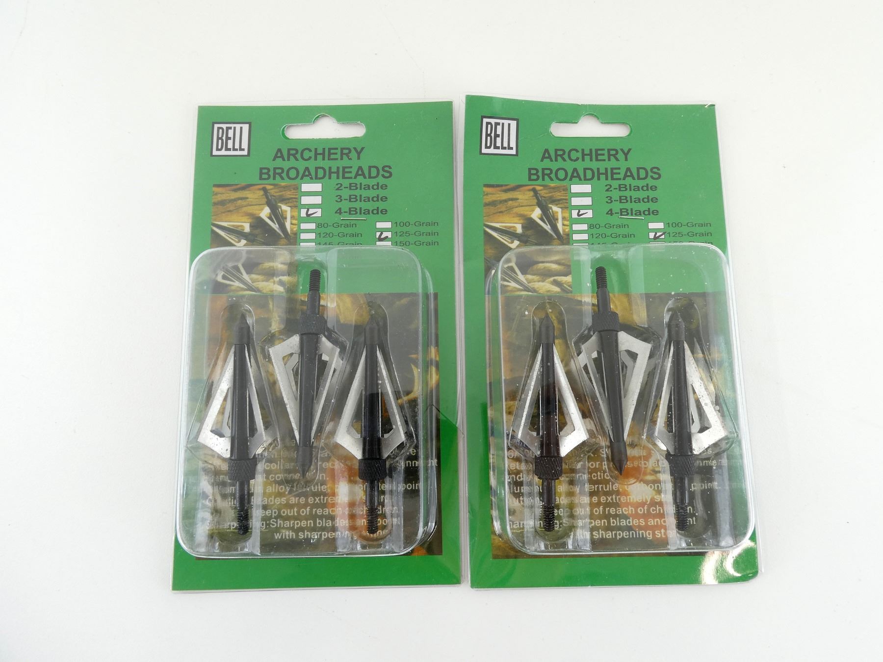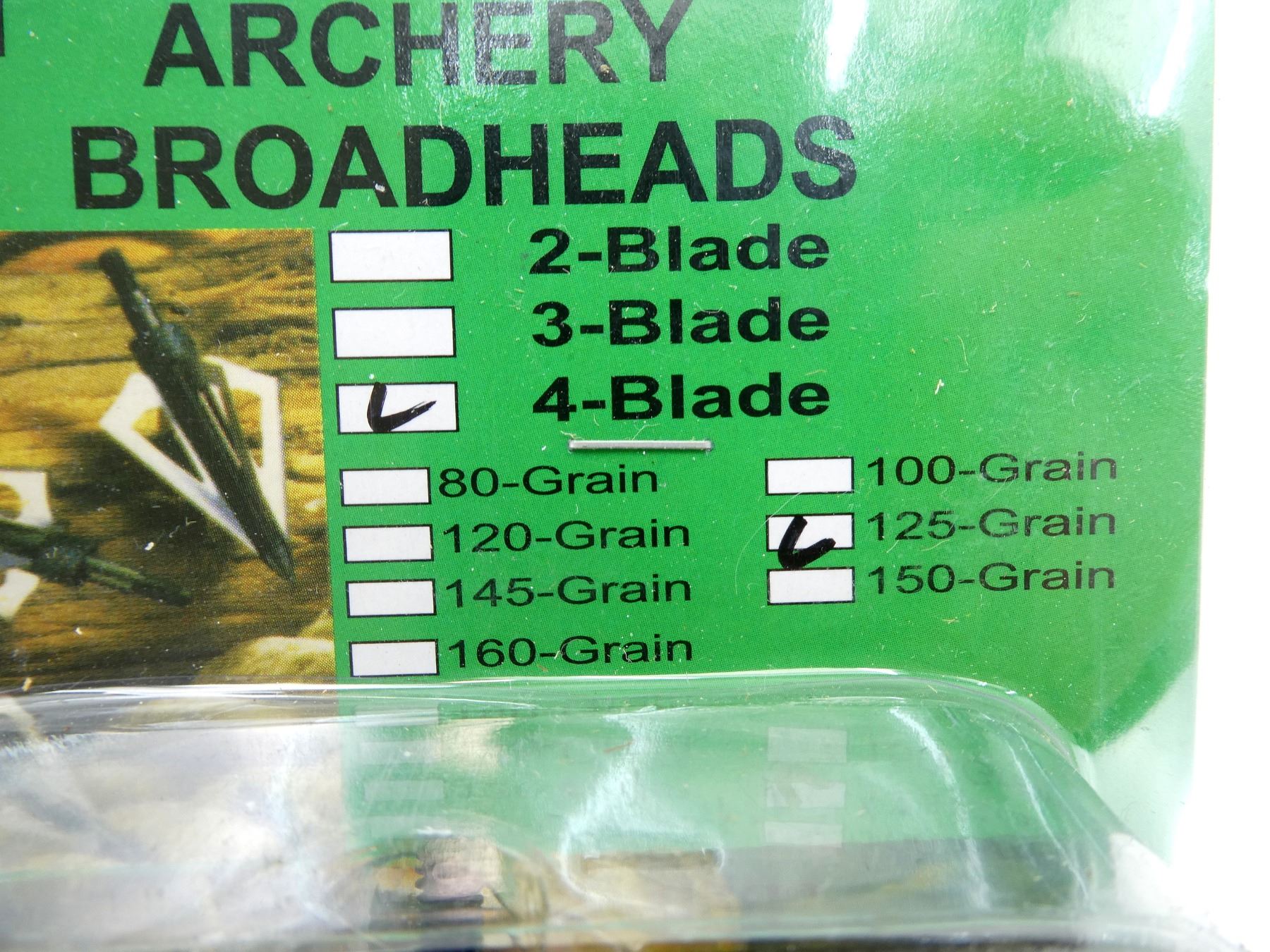 LOT INCLUDES; (6) FIXED BLADE BROADHEADS, (4) BLADE, 125 GRNS (STATED ON PKGS NOT CONFIRMED), 1 3/16' CUTTING DIA, UNOPENED.