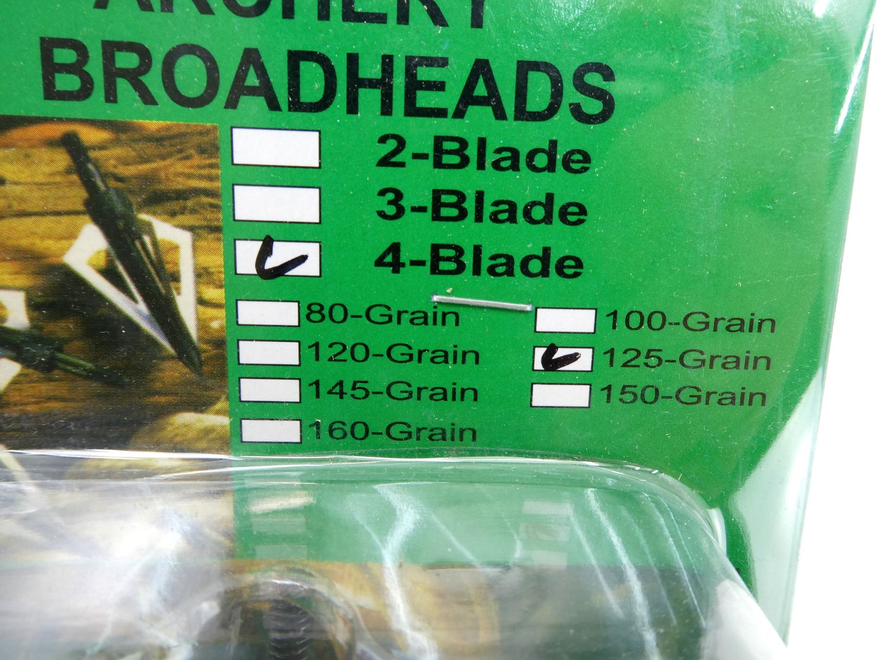 LOT INCLUDES; (6) FIXED BLADE BROADHEADS, (4) BLADE, 125 GRNS (STATED ON PKGS NOT CONFIRMED), 1 3/16' CUTTING DIA, UNOPENED.