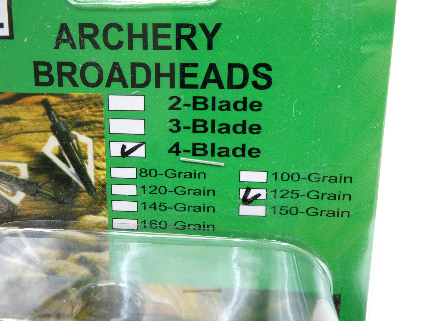 LOT INCLUDES; (9) FIXED BLADE BROADHEADS, (4) BLADE, 125 GRNS (STATED ON PKGS NOT CONFIRMED), 1 3/16' CUTTING DIA, UNOPENED.