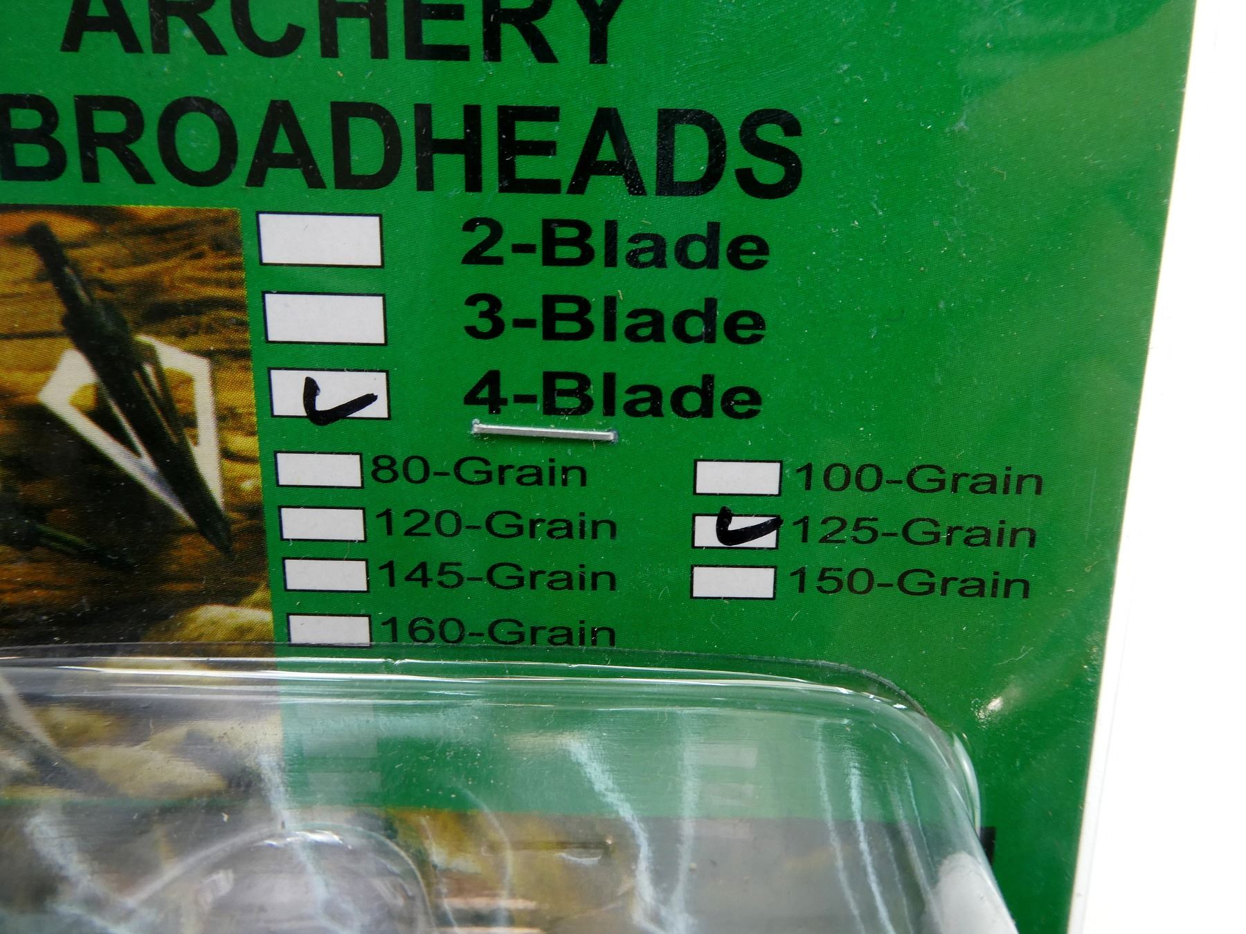LOT INCLUDES; (6) FIXED BLADE BROADHEADS, (4) BLADE, 125 GRNS (STATED ON PKGS NOT CONFIRMED), 1 3/16' CUTTING DIA, NEW OLD STOCK, UNOPENED.