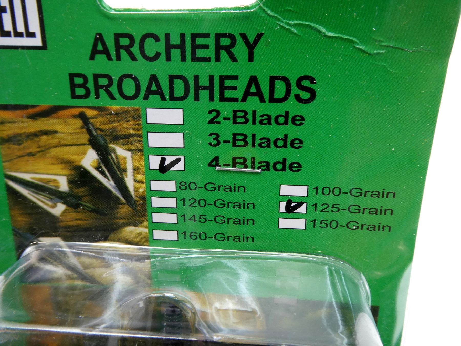 LOT INCLUDES; (6) FIXED BLADE BROADHEADS, (4) BLADE, 125 GRNS (STATED ON PKGS NOT CONFIRMED), 1 3/16' CUTTING DIA, NEW OLD STOCK, UNOPENED.