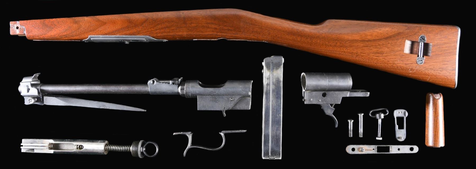 Following parts are present: both sights, part of the receiver with bbl., folding bayonet, stock, trigger, recoil spring, trigger guard, bolt, handguard, 1-20 rd. mag, a couple small screws, a sling swivel & buttplate. Right rear of tube has JLD Enterprises import marking. CONDITION: stock appears refinished with light handling wear & marks. Most of metal parts have a dull reblue with scattered blued over pitting, blued over dings & some edge wear. Very good bright bore with strong rifling. (02-24539/MJC). $300-500.