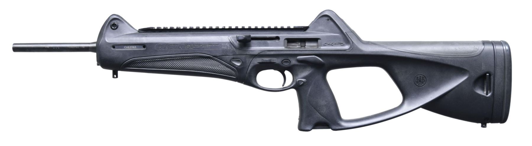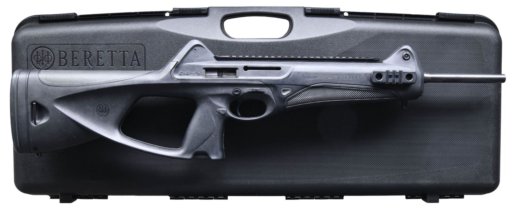 CASE & MATCHING FACTORY BOX. Cal. 9x19mm. S# CX63763. Bbl. 16 3/4". CX4 Storm semi-automatic rifle mfg. in Italy by Beretta and imported by Beretta USA Corp. Standard markings overall, denoting the model and cal. designations, Beretta's mfg. and patent information, as well as the S#. Bbl. exhibits a blue finish overall. Black polymer receiver and buttstock. Post front sight, with flip-up peep rear sight. MAGS: 1 15-rd. UNATTACHED ACCESSORIES: matching factory box, containing a black plastic hard case. CONDITION: metal components retain the majority of their original factory finish, exhibiting some light to mild wear and some scattered superficial handling marks, with firing residue present on the bolt assembly. Mirror bore, retaining strong rifling throughout. Black polymer furniture is good, showing some wear, as well as some scattered superficial handling marks overall. Box shows some exterior wear from handling and storage, but otherwise remains sturdy and serviceable. (24-7056/MLW). MODERN. $300-500.