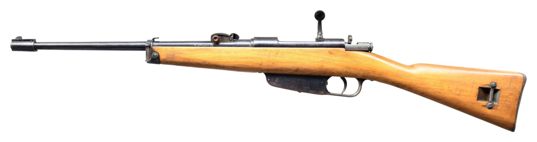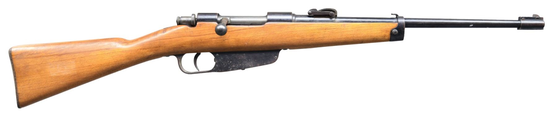 Cal. 6.5 Carcano. S# E6828. Bbl. 17 1/2". Blade front sight. Ladder rear sight graduated to 1500m. Bolt has mismatched number & no visible stock number. Bolt appears to be a straight rifle bolt that was crudely turned down. No folding bayonet assembly or handguard present. Bbl. shank has Beretta markings with 1938 date in both standard & Roman numerals. Arsenal rework blue finish. Hardwood stock with left side sling provisions. CONDITION: refinished stock shows scattered scratches & handling marks. Metal retains 70% arsenal rework blue with overall scattered moderate oxidation, a couple spots of sticker remnants, some edge & handling wear. Action functions properly when hand cycled. Bore shows scattered frosting & some light pitting but strong rifling. (25-2706/MJC). CURIO. $100-200.