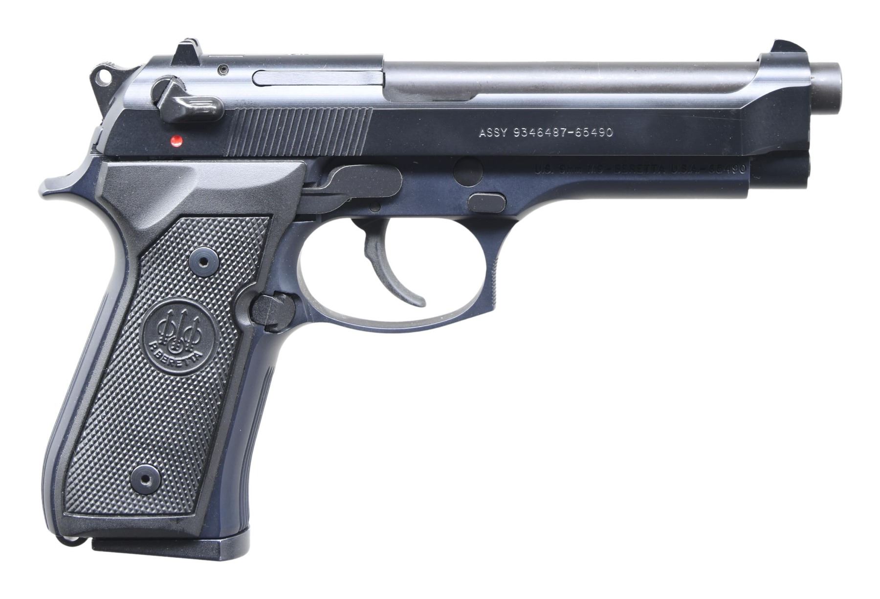 Cal. 9mm Luger. S# M9-170244. Bbl. 4 7/8". White dot front sight. Square notch rear sight with white dot. Commercial Beretta M9 made in the USA. Ambi safety that also acts as a decocker. Bruniton finish. Checkered black grips with Beretta monograms. MAGS: 2-15 rd. UNATTACHED ACCESSORIES: factory hardcase that has been numbered to match pistol in white marker. CONDITION: grips show light handling wear. Metal retains 97% original finish with some minor oxidation specks on takedown lever, light edge wear & scattered handling marks. Action functions properly when hand cycled. Bright near excellent bore. (25-3220/MJC). MODERN. $350-550.