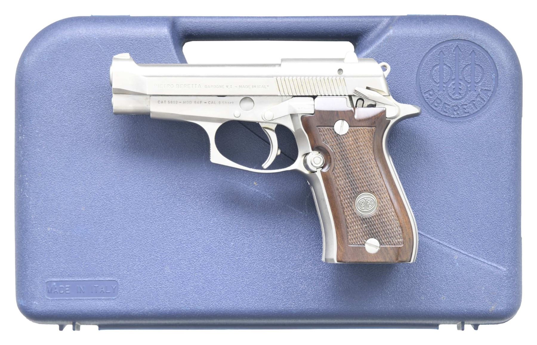 Cal. 380 ACP. S# D75246Y. Bbl. 3.82". Mfg. 1990 having optional nickel finish, checkered hardwood grips with Beretta medallions, ambidextrous safety / decocker. magazine safety, hooked triggerguard and fixed sights; resembles reduced sized Model 92. Uses 13 rd. magazine. MAGS: NONE. UNATTACHED ACCESSORIES: factory blue plastic case. CONDITION: all aspects near excellent including bore and grips. (25-3662/NW). MODERN. $300-450.