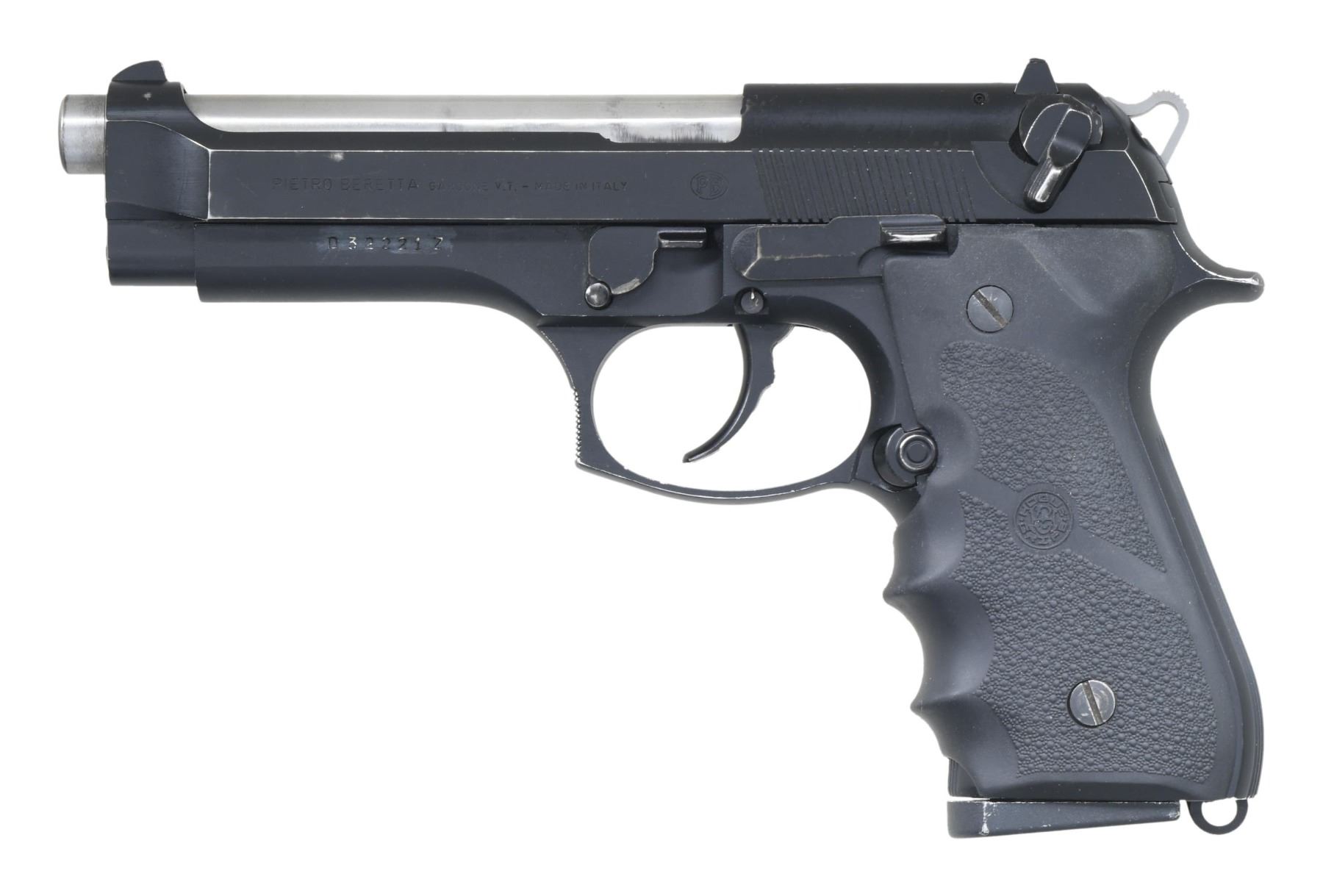 Cal. 9mm Para. S# D32221Z. Mfg. 1988. Bbl. 4.9". Black finished slide w/ replacement skeletonized hammer, fixed sights & safety. Matte black frame w/ Hogue rubber grip. MAGS: 2 - 15 rd. CONDITION: very good black finish with handling wear. Barrel has large portions of finish taken off. Very good bore w/ frosting in the grooves. (25-3225/MD). MODERN. $400-600.