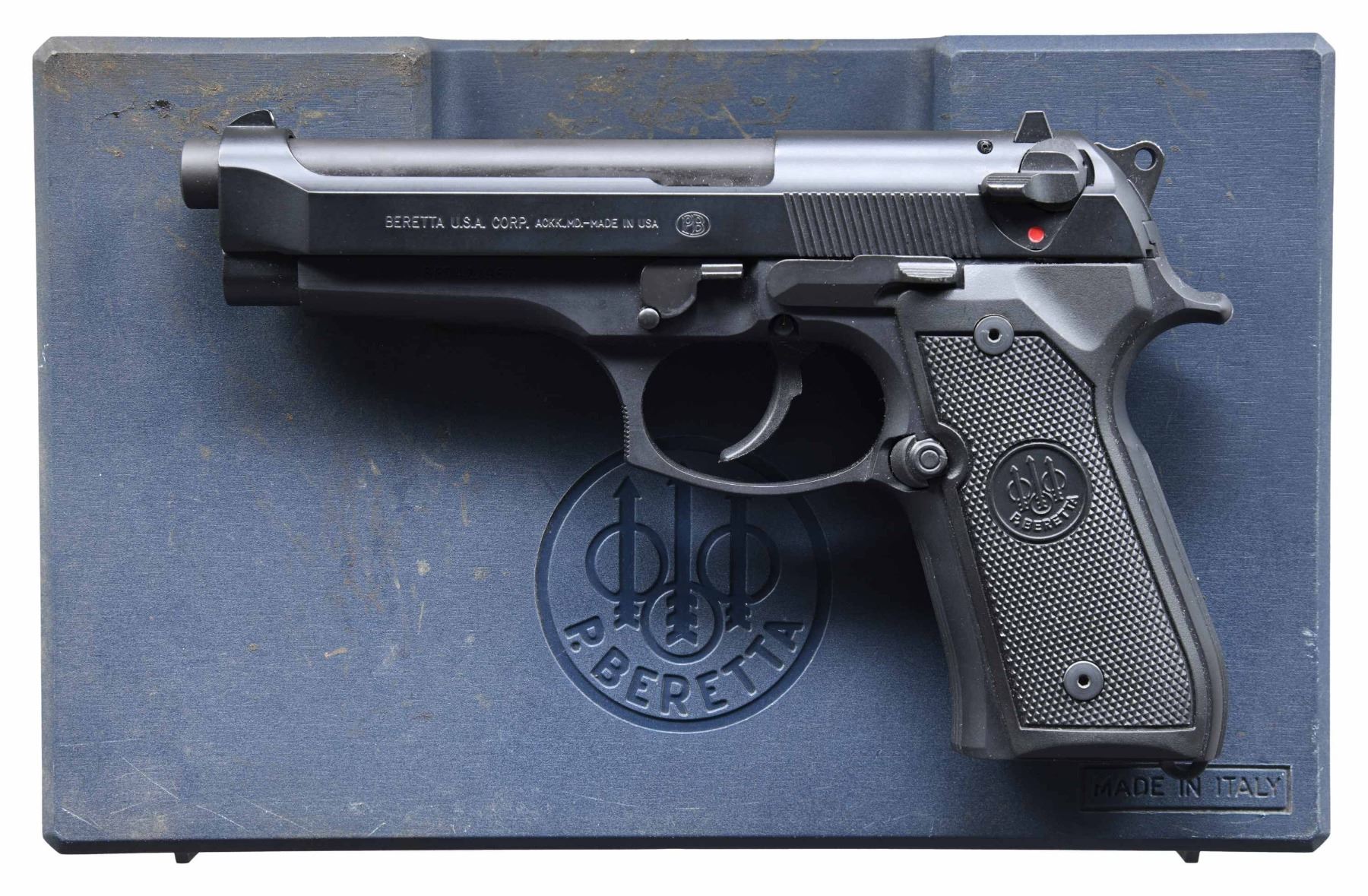 Cal. 9mm Para. S# BER422957. Standard configuration with 4.9" bbl. & 3 white dot sights. MAGS: NONE. UNATTACHED ACCESSORIES: Beretta case. CONDITION: all aspects near excellent including bore. (25-3650/MD). MODERN. $400-600.