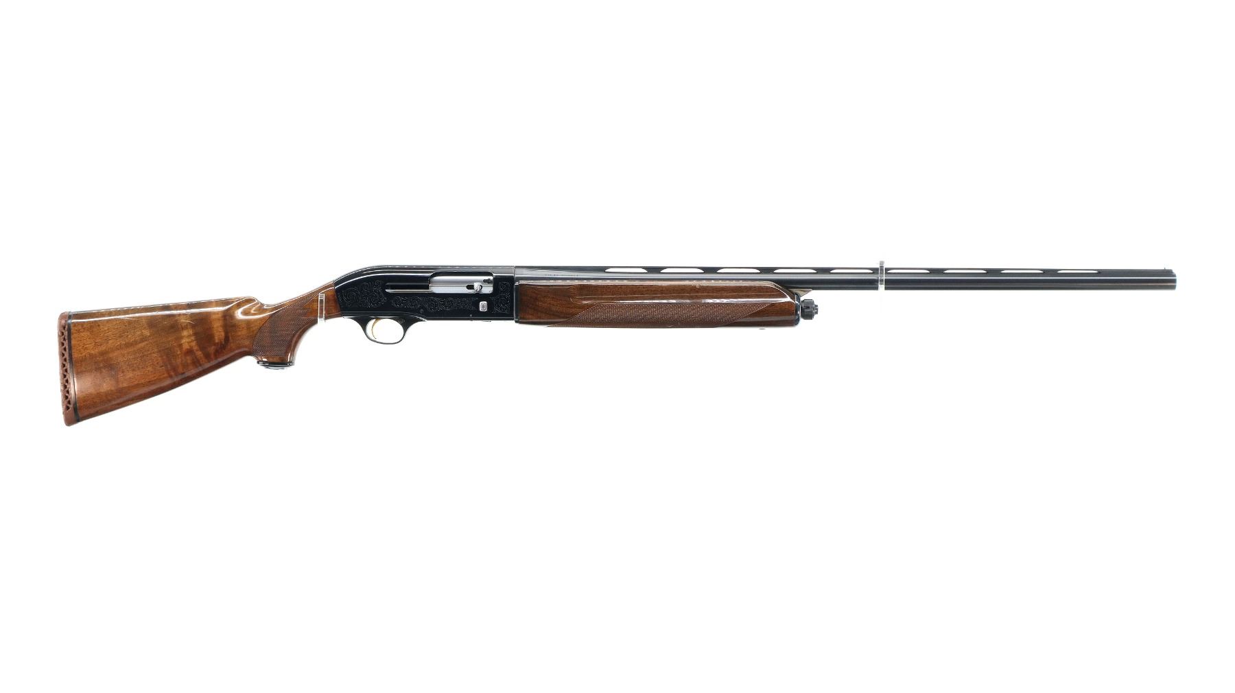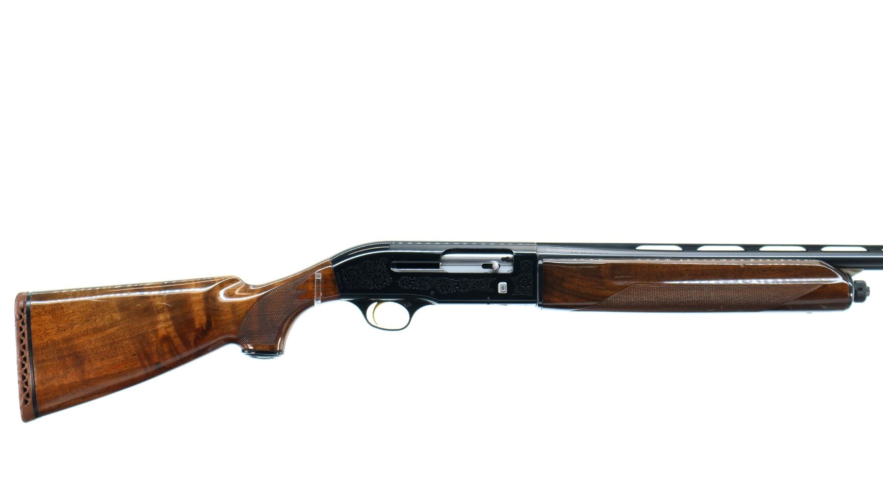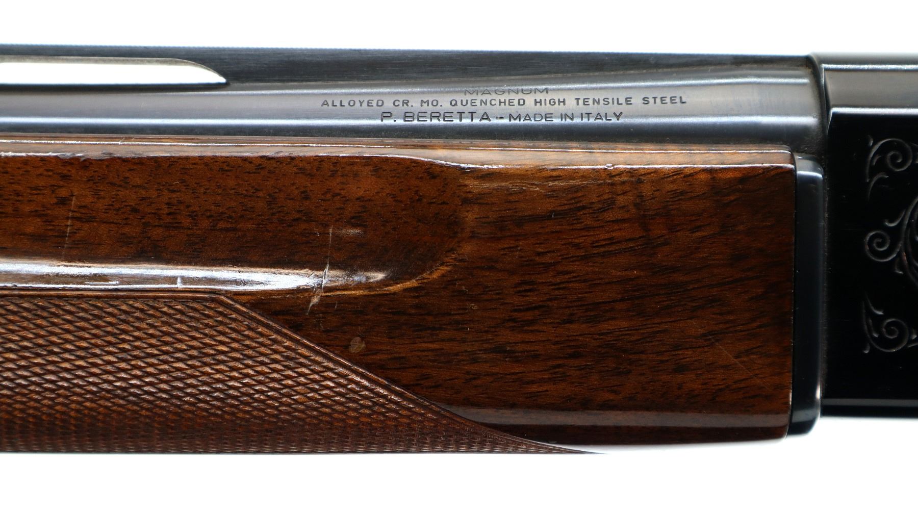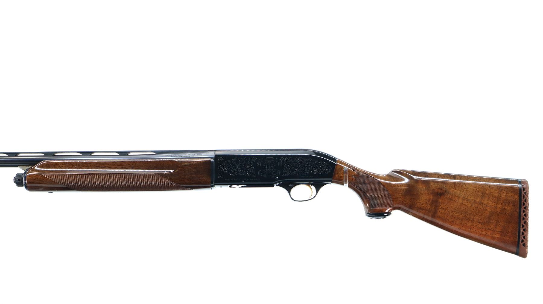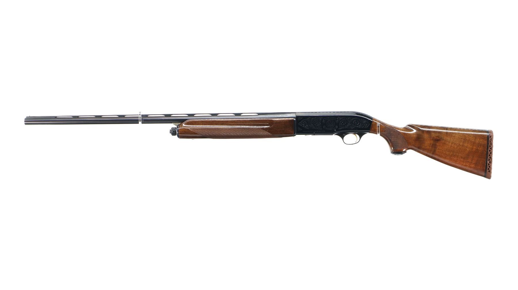 Main Description: Silver bead, blued vent rib barrel, engraved black alloy receiver. Two piece wood stocks, checkered forearm and pistol grip, brown vented rubber recoil pad which is damaged, grip cap, gold trigger.