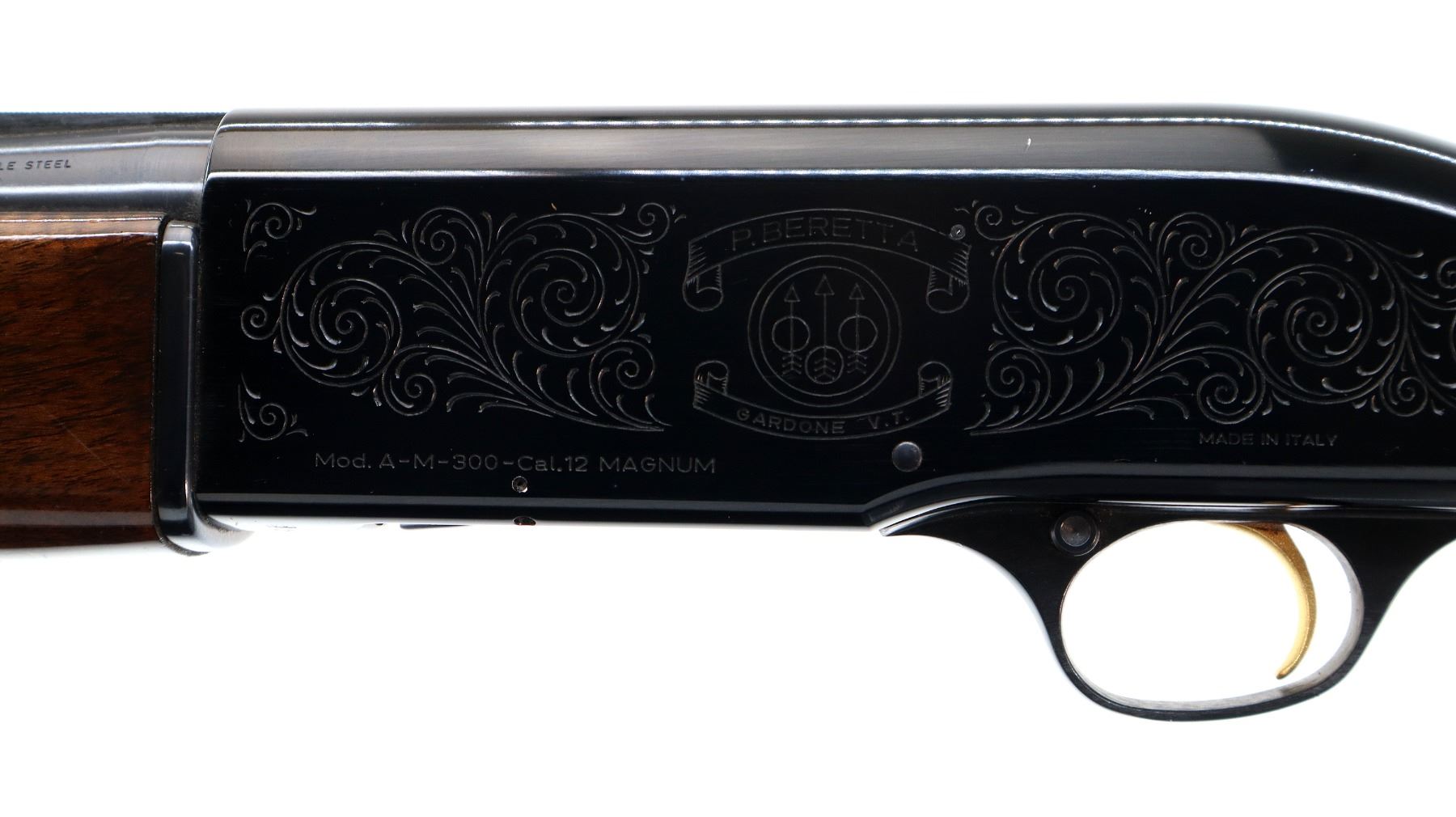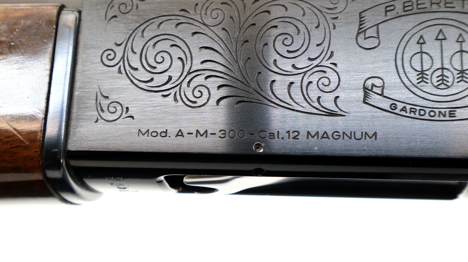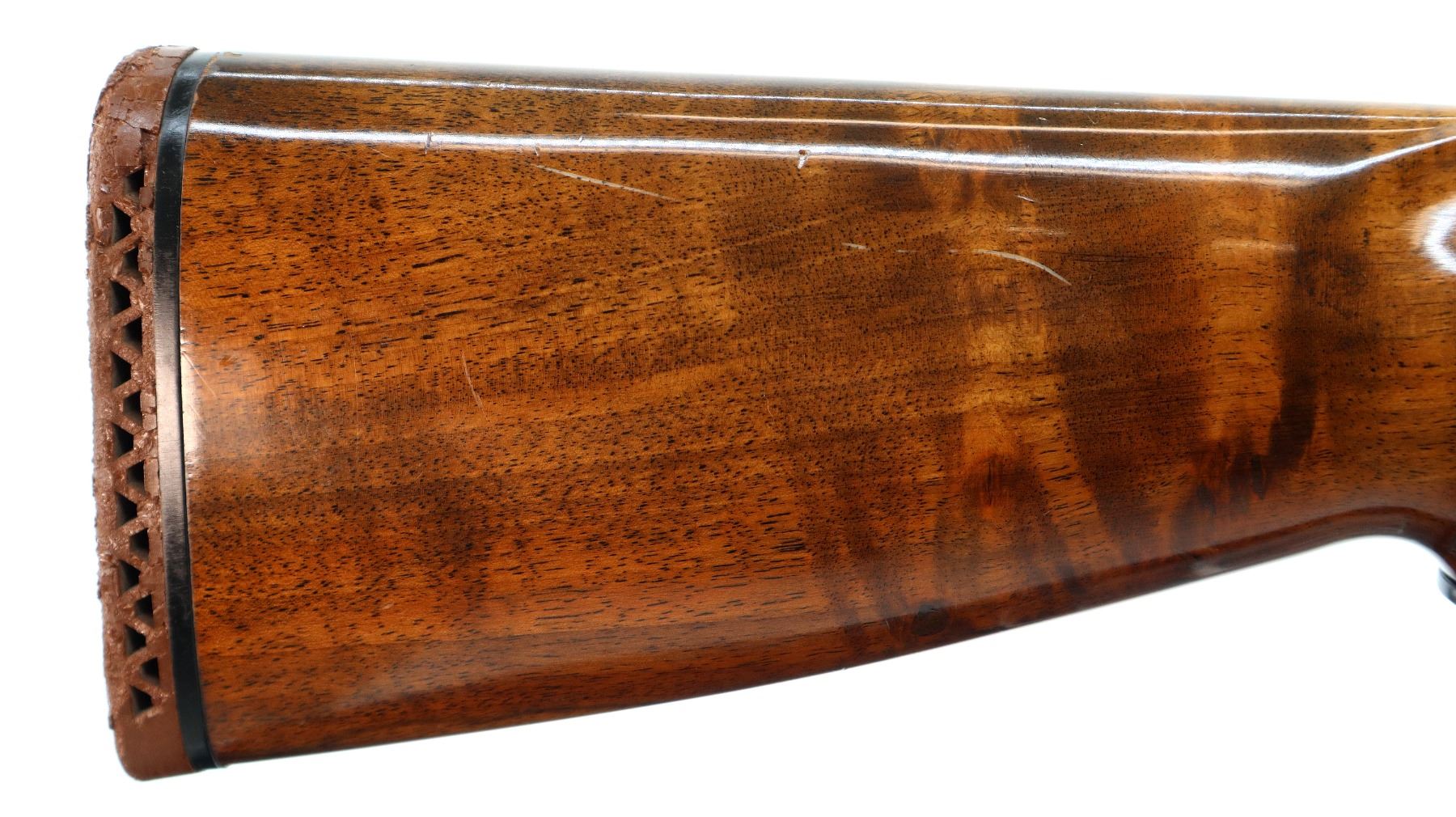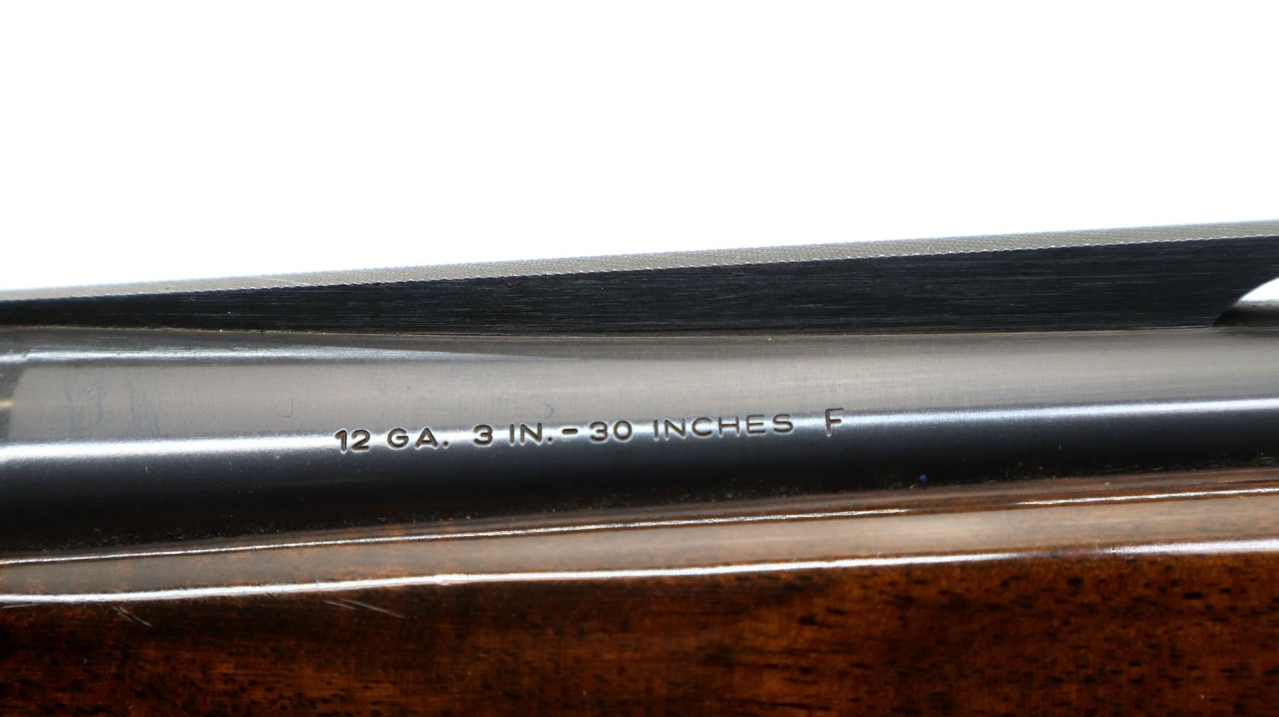Main Description: Silver bead, blued vent rib barrel, engraved black alloy receiver. Two piece wood stocks, checkered forearm and pistol grip, brown vented rubber recoil pad which is damaged, grip cap, gold trigger.