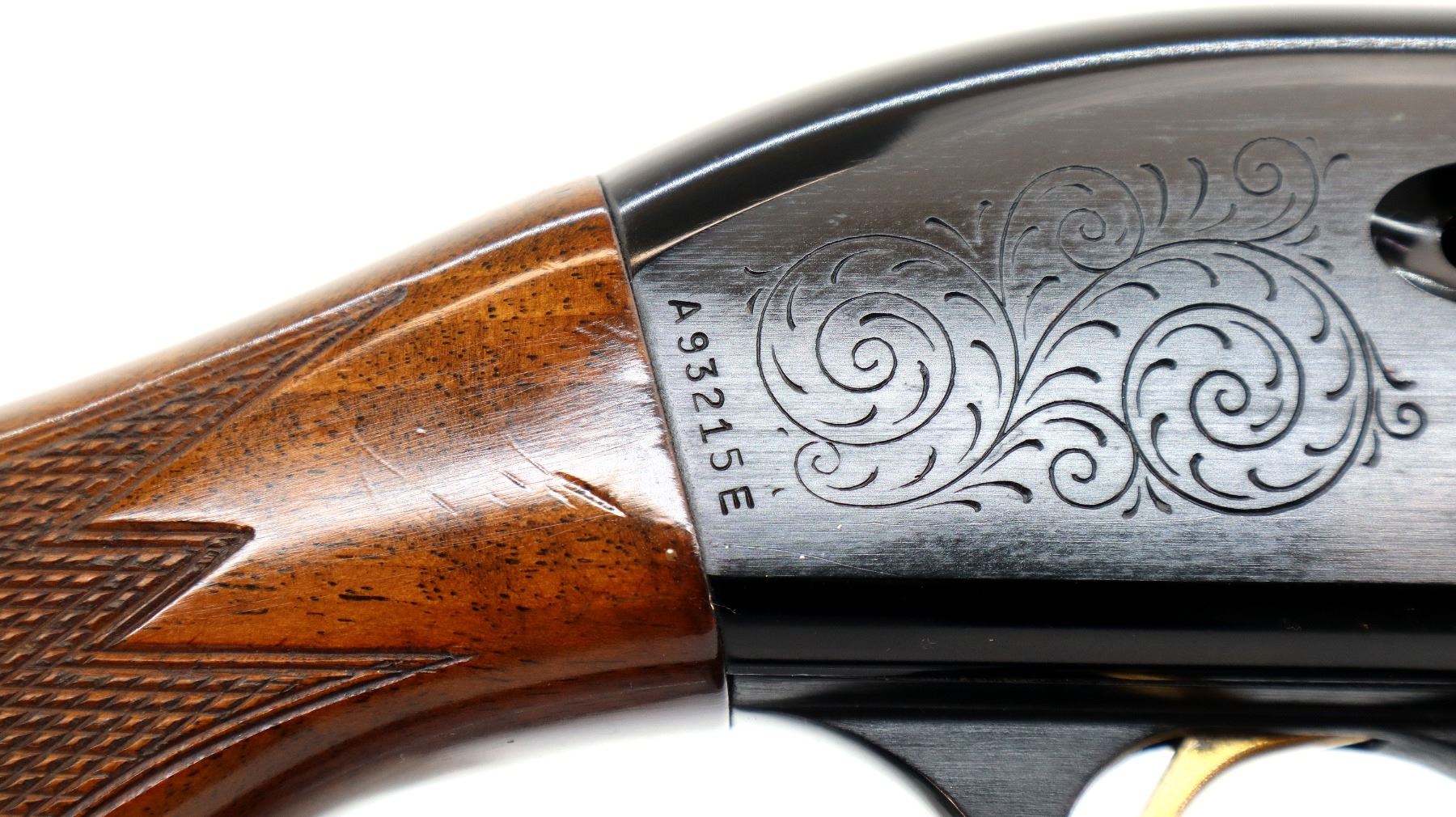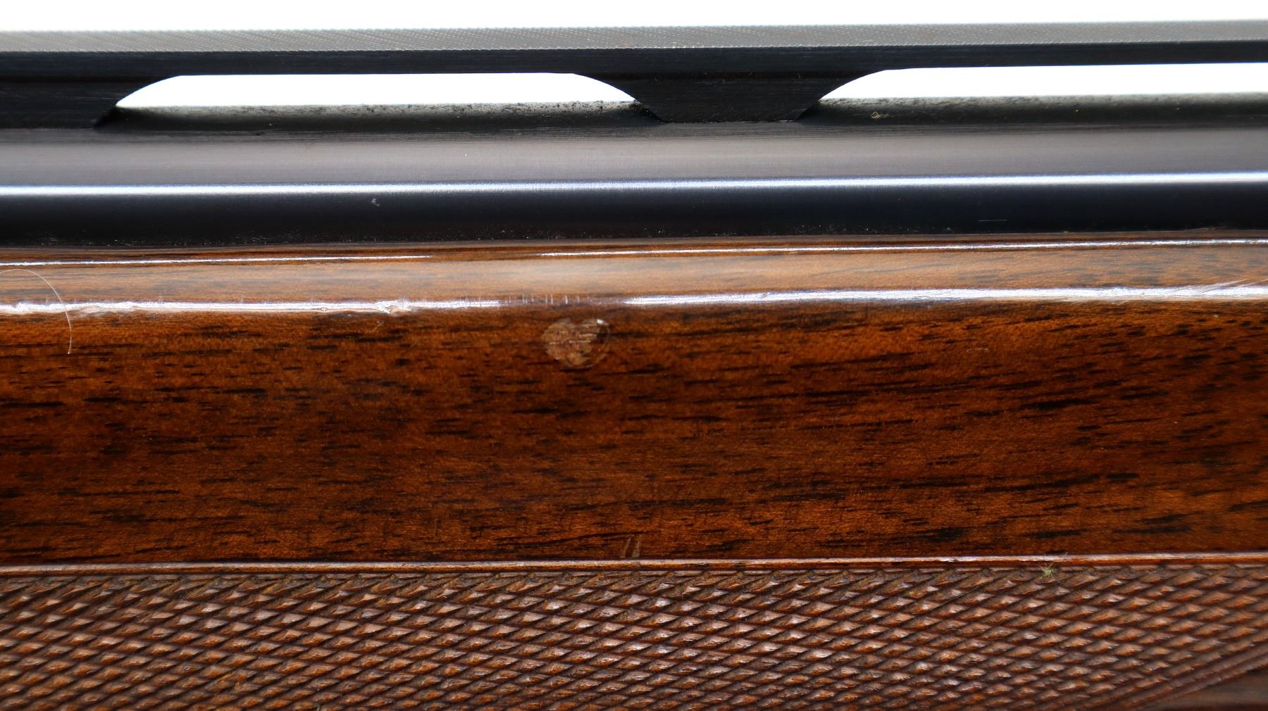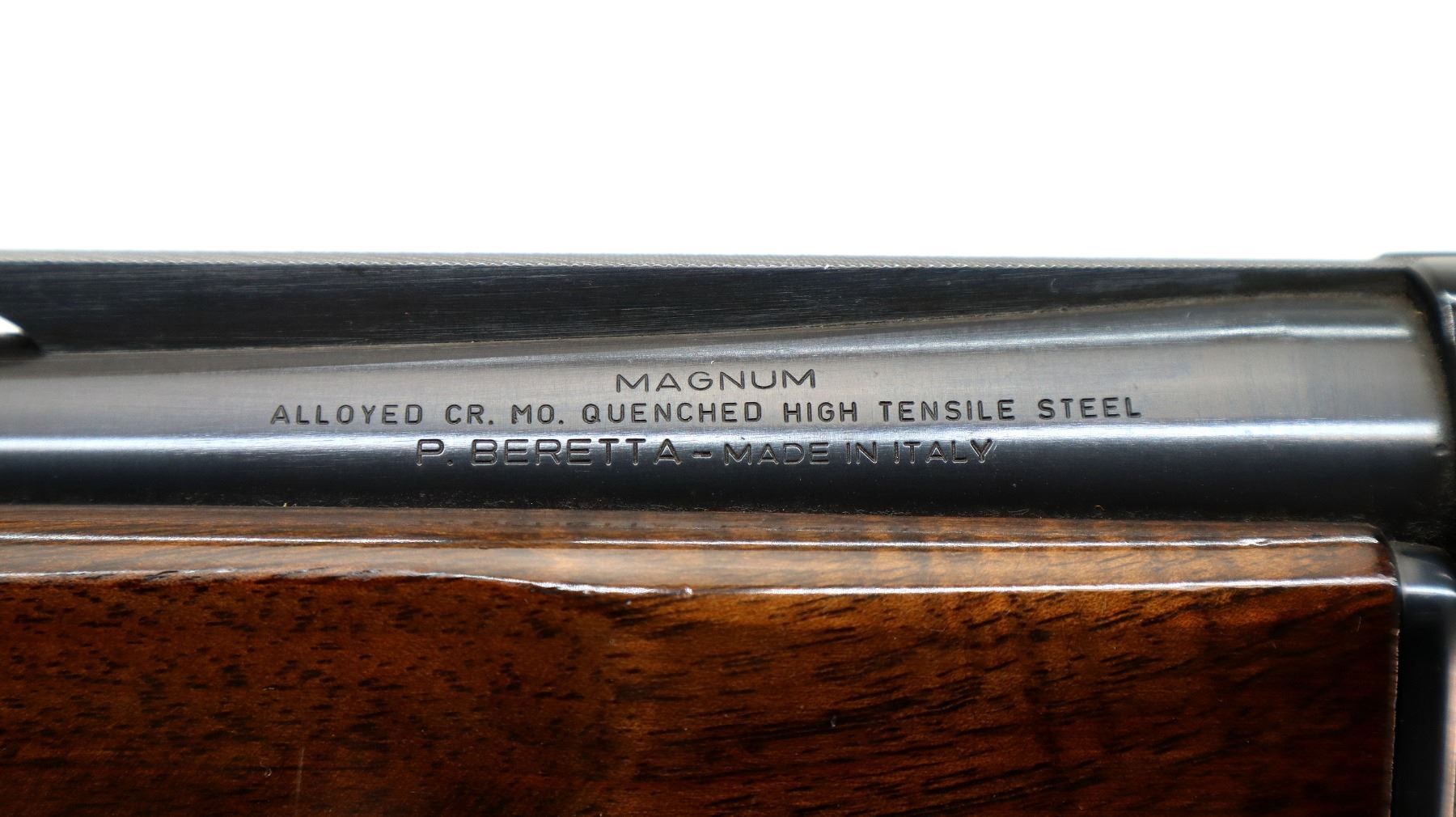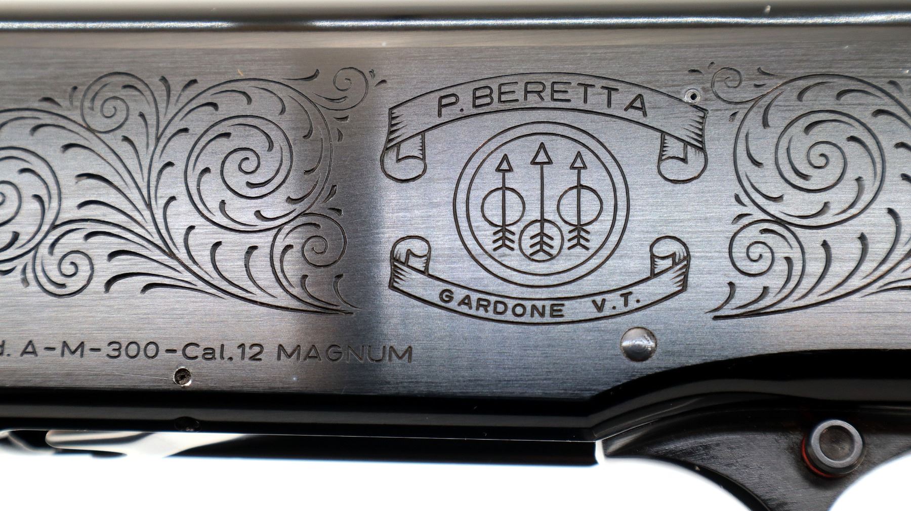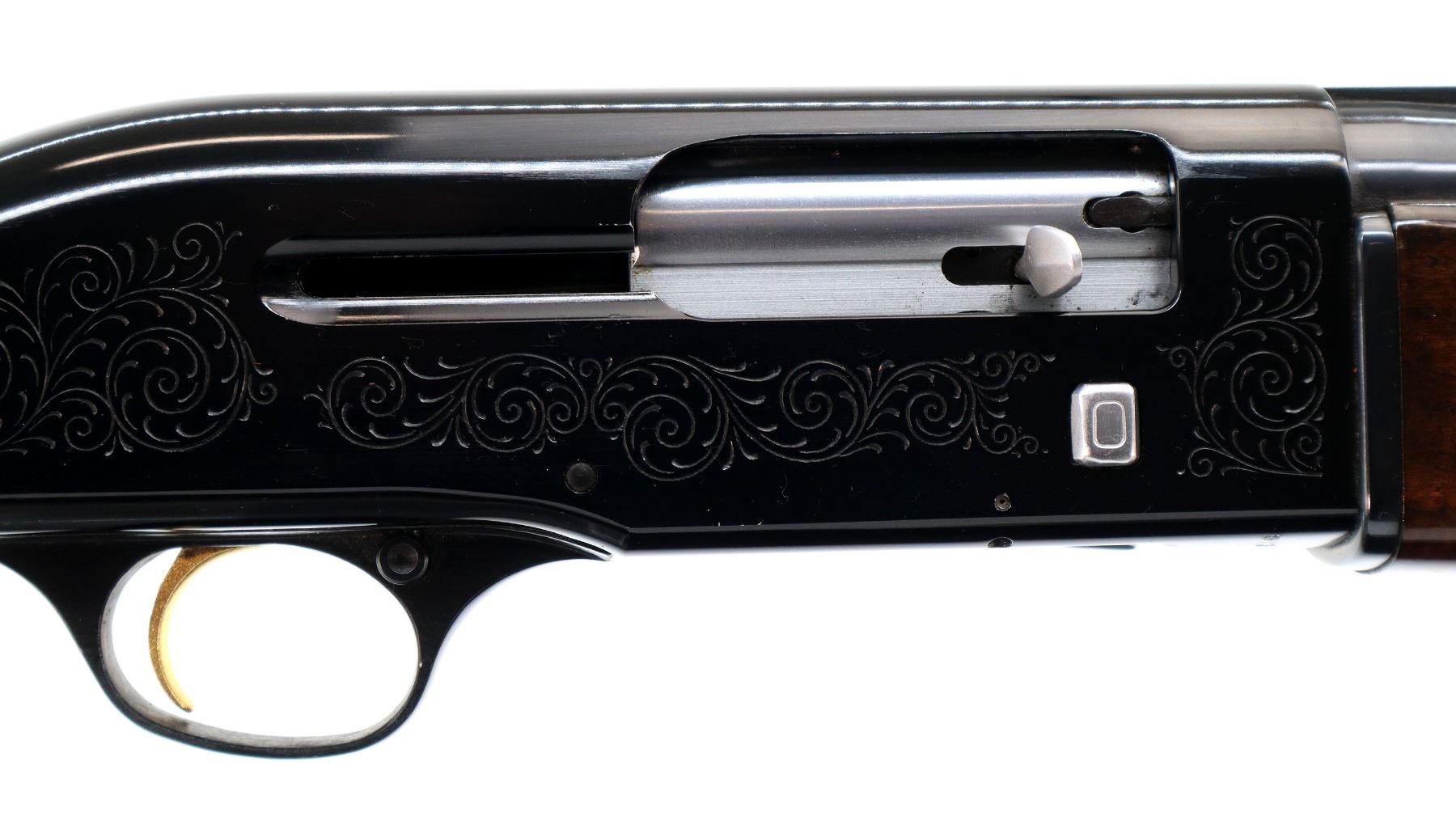 Main Description: Silver bead, blued vent rib barrel, engraved black alloy receiver. Two piece wood stocks, checkered forearm and pistol grip, brown vented rubber recoil pad which is damaged, grip cap, gold trigger.