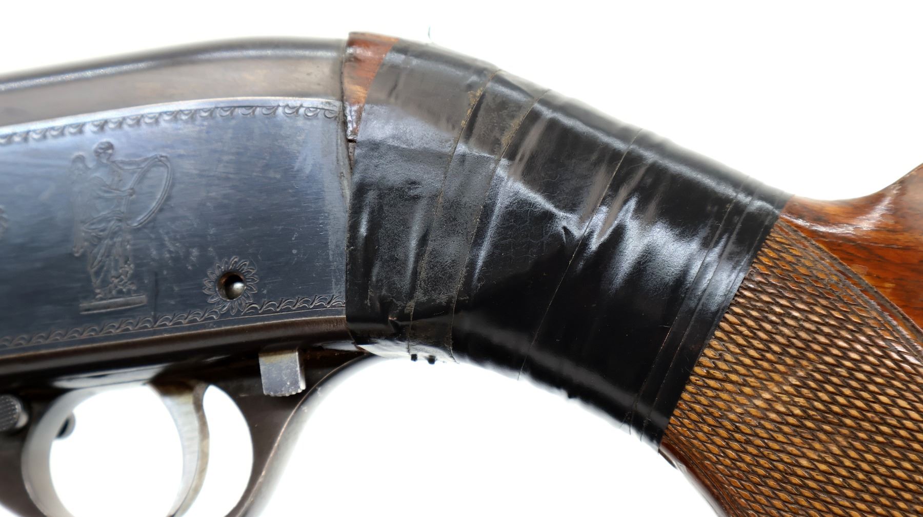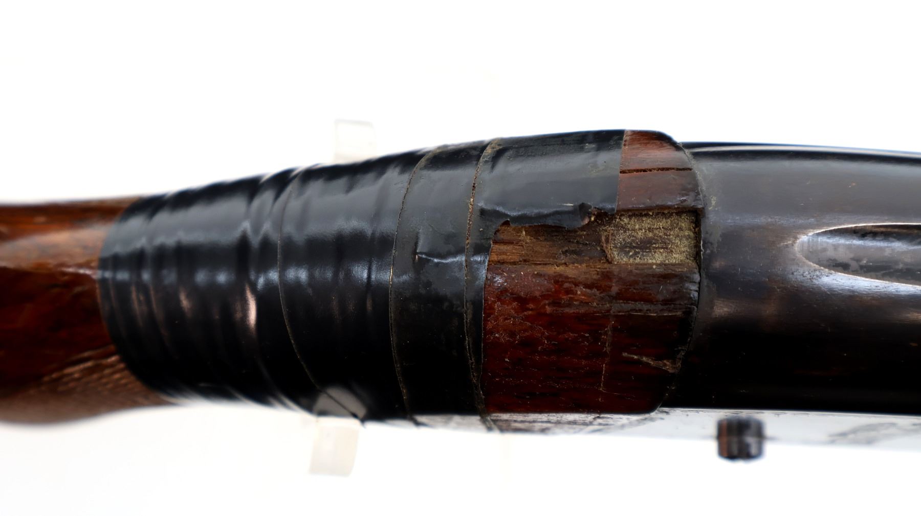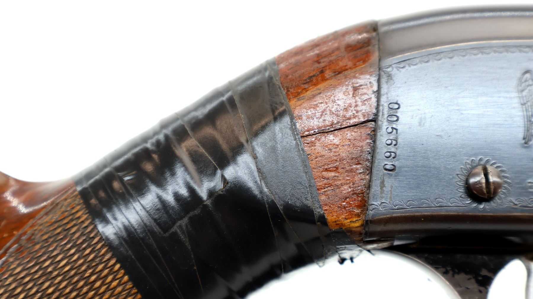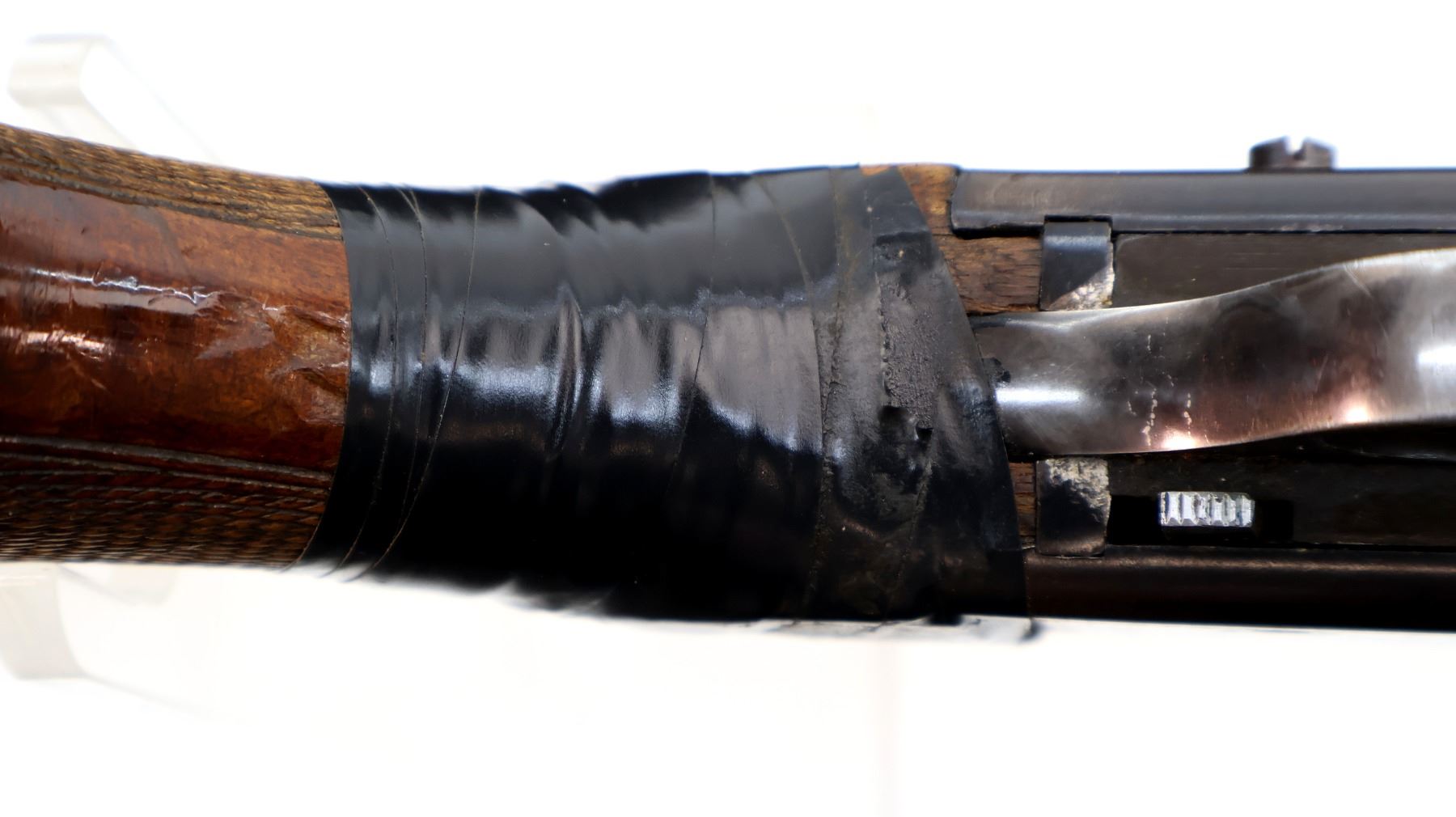 Main Description: Silver bead, blued finish, round barrel, jewelled bolt, missing ejector assembly. One trigger guard screw is replaced. Two piece wood stocks, checkered forearm, pistol grip and black polymer butt plate, stock is chipped, cracked and broken around receiver wrapped with tape.