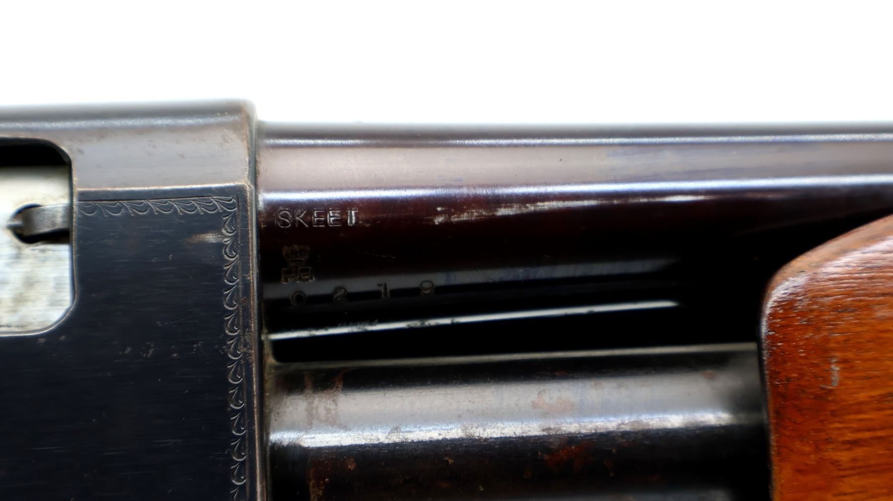 Wear: Metal finish shows some light rust speckles, scratches, handling marks and wear. Stocks show some marks, scratches and wear.