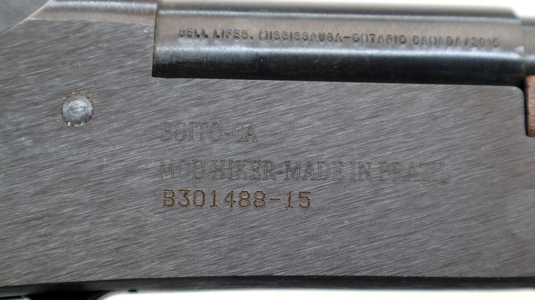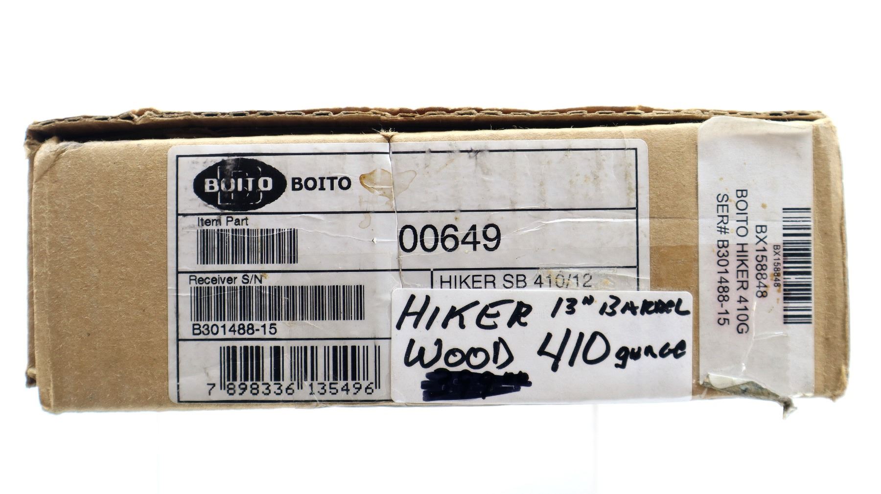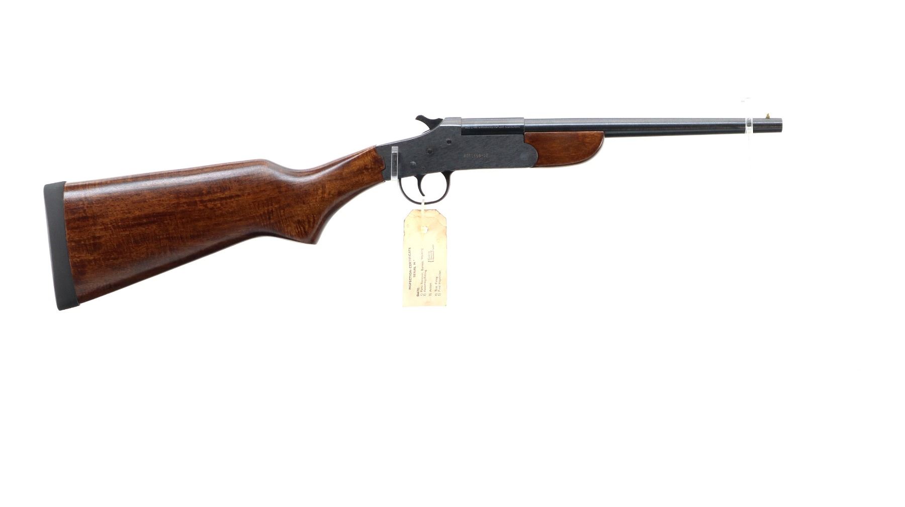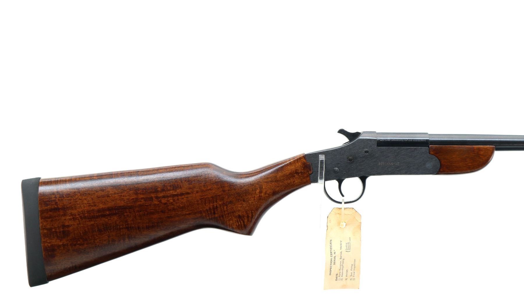 Main Description: Brass bead, blued finish, round barrel, grooved spur hammer, extractor. Two piece wood stocks, pistol grip, black rubber recoil pad, retains factory hang tag