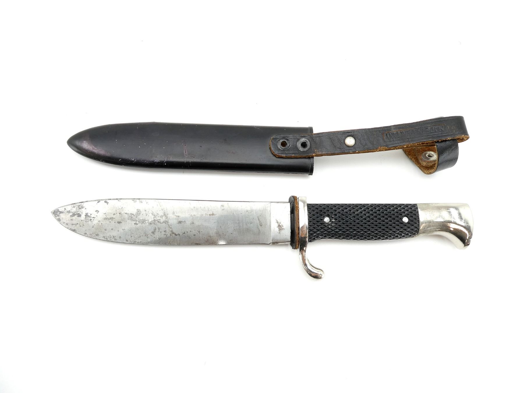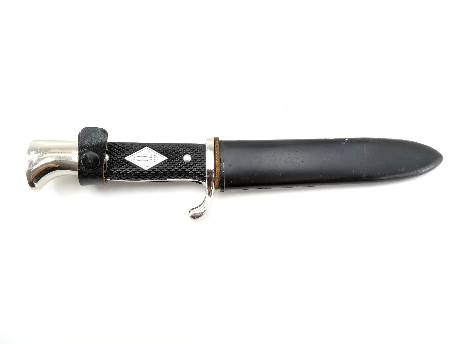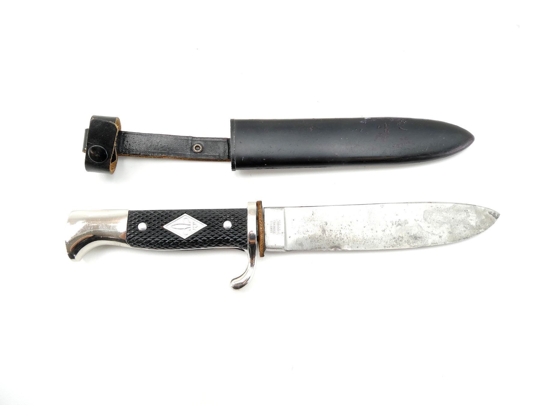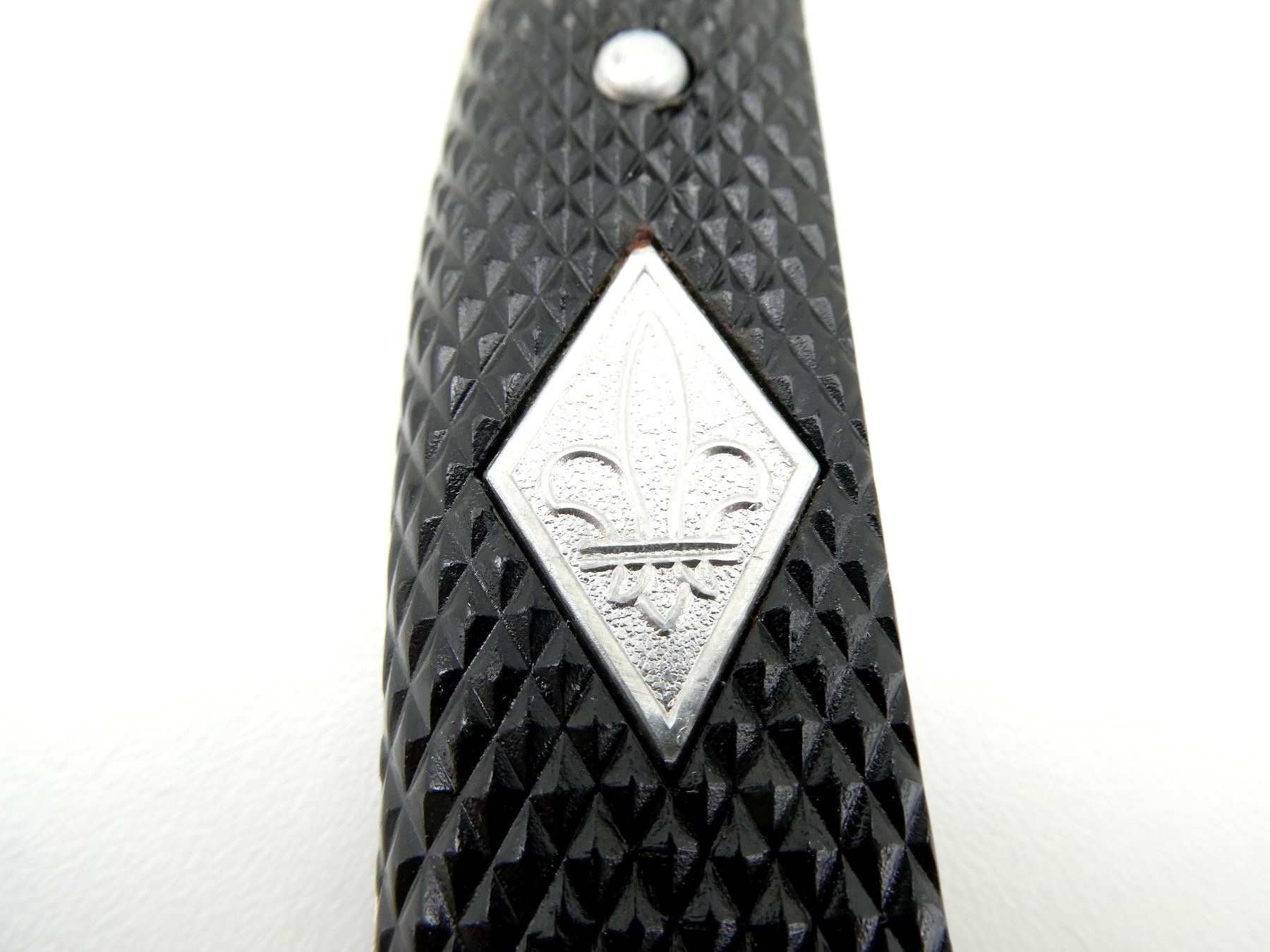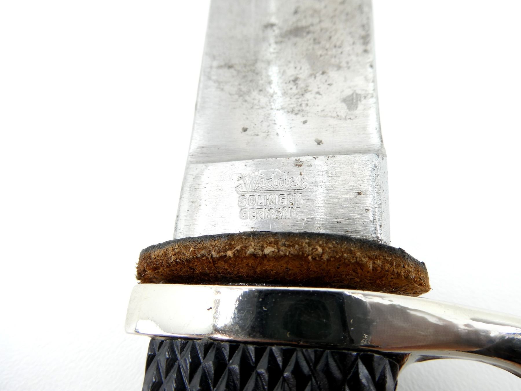 (1) RICASSO MARKED: "WIDDER, SOLINGEN, GERMANY", BLADE IS LOOSE / MOVES, BLACK LEATHER WASHER, 2-PIECE BLACK CHECKERED GRIPS WITH BOY SCOUT FLEUR DE LIS EMBLEM, GRIPS ARE LOOSE, METAL POMMEL, BLACK PAINTED METAL SCABBARD WITH LEATHER FROG ATTACHED, FROG MARKED: "MADE IN GERMANY", BLADE APPROX. 5.5" & OVERALL LENGTH APPROX. 9.75". SEE PHOTOS.