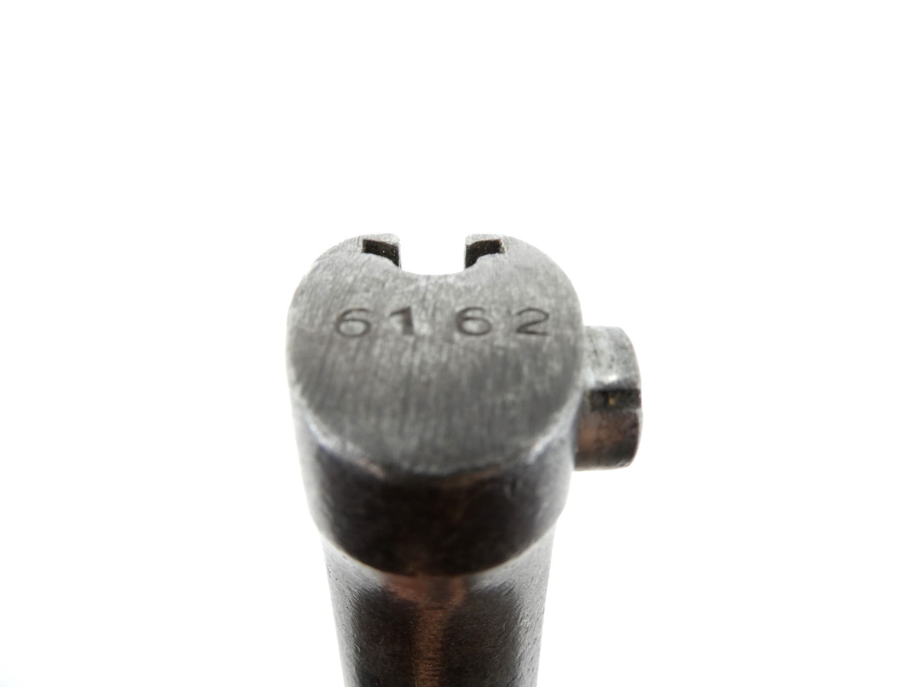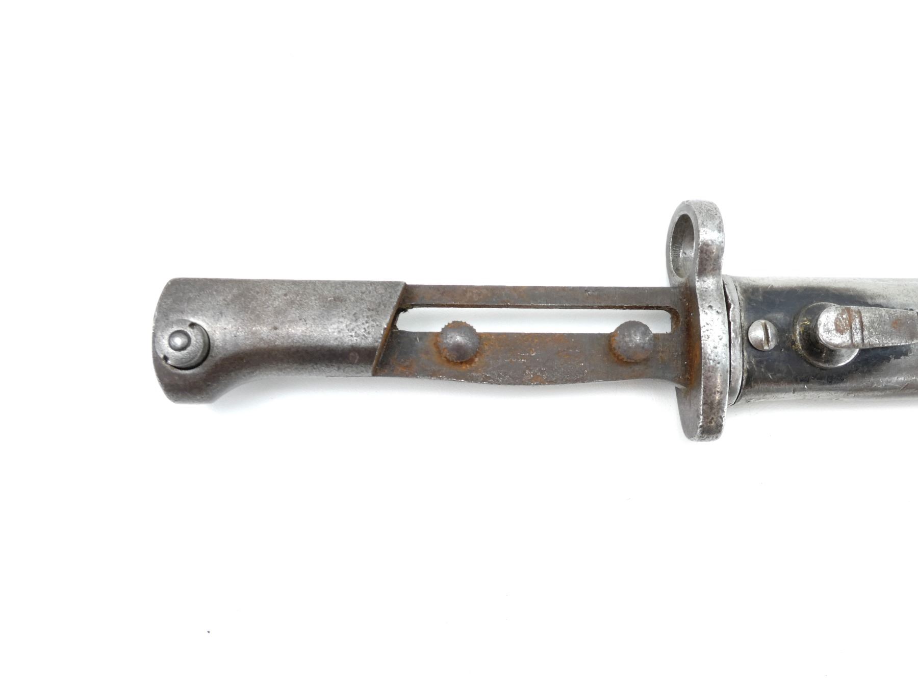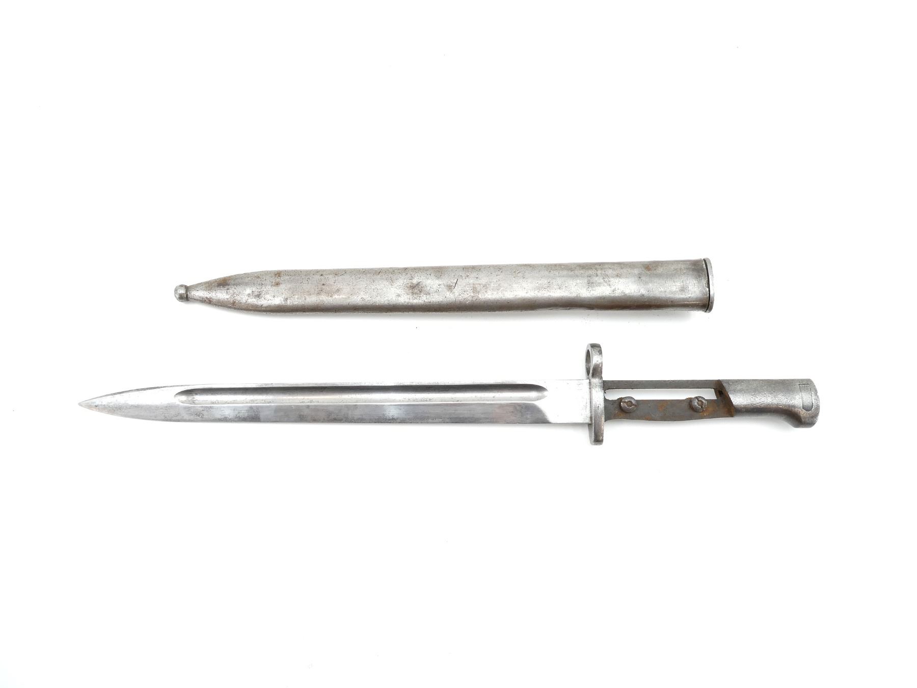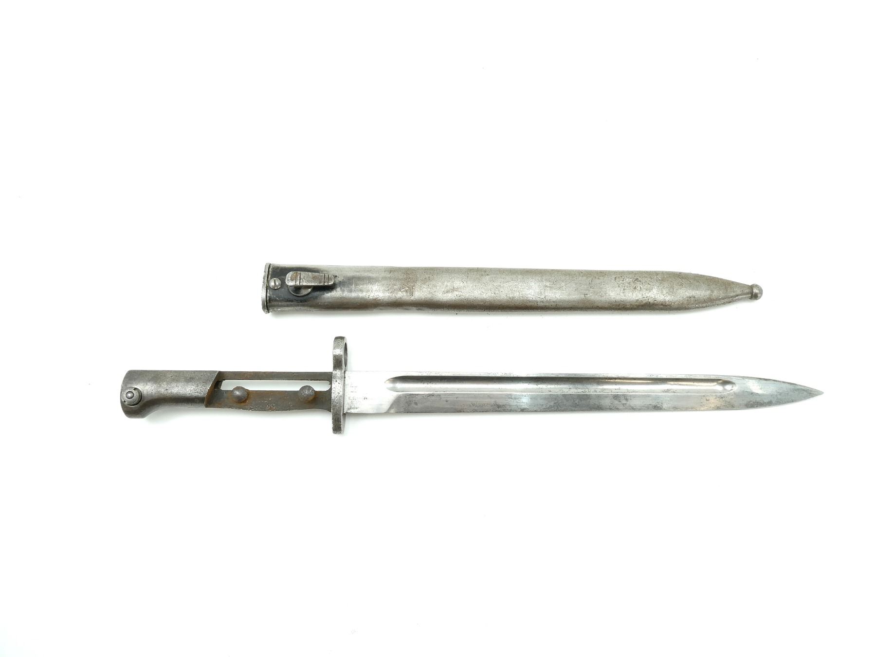 (1) FITS 7MM M1935 RIFLES, NO VISIBLE MARKINGS ON BLADE / RICASSO / CROSS-PIECE, MISSING GRIPS, METAL POMMEL MARKED: "6162", METAL SCABBARD, NO VISIBLE MARKINGS, MUZZLE RING APPROX. 0.620" DIA., BLADE APPROX. 11.75" & OVERALL LENGTH APPROX. 16 7/8". SEE PHOTOS.
