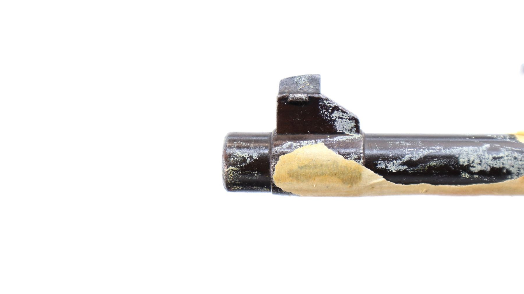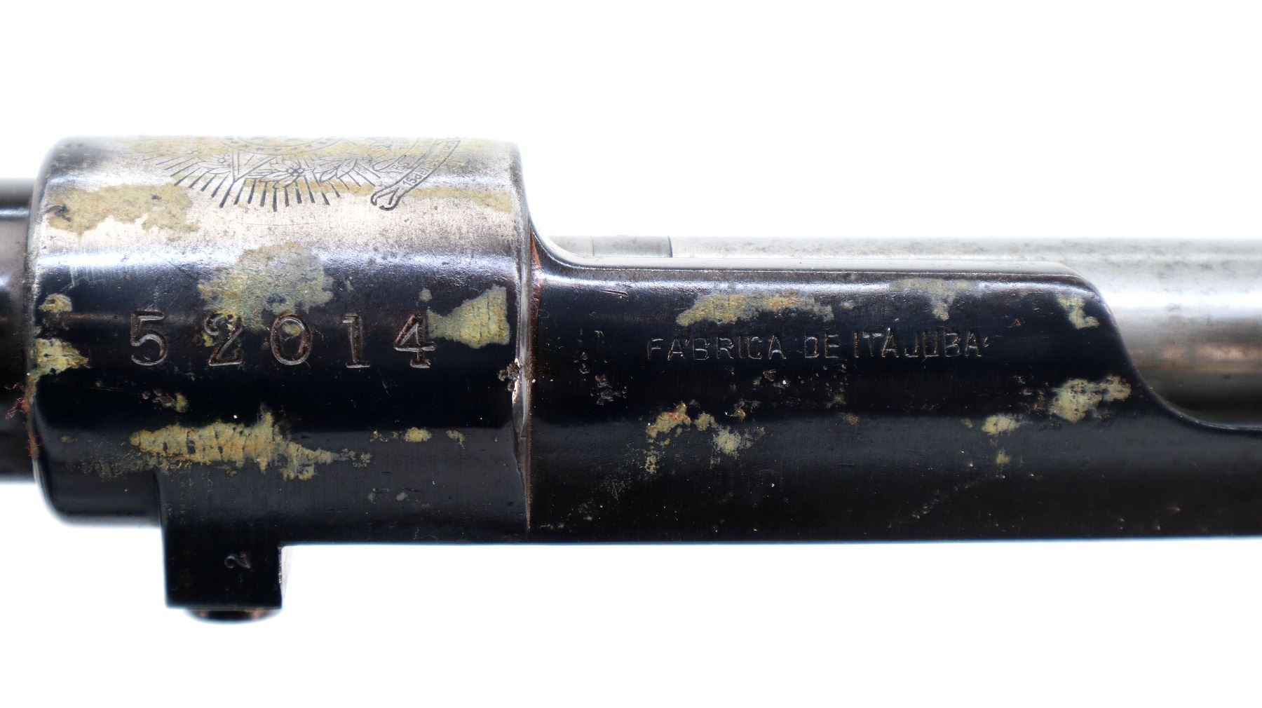 Main Description: Manufactured by Itajuba. Barley corn front sight with ramp, adjustable u notched rear sight, blued finish with some masking tape remaining, Brazilian crest on receiver ring. Includes complete bolt with turn down handle and trigger assembly. No other parts or stocks included.