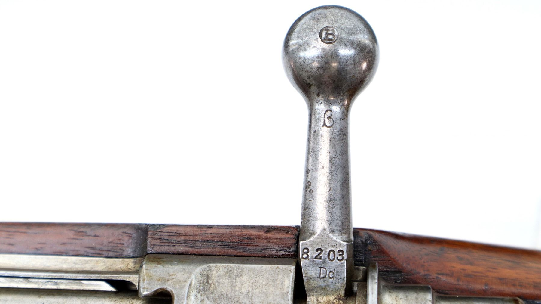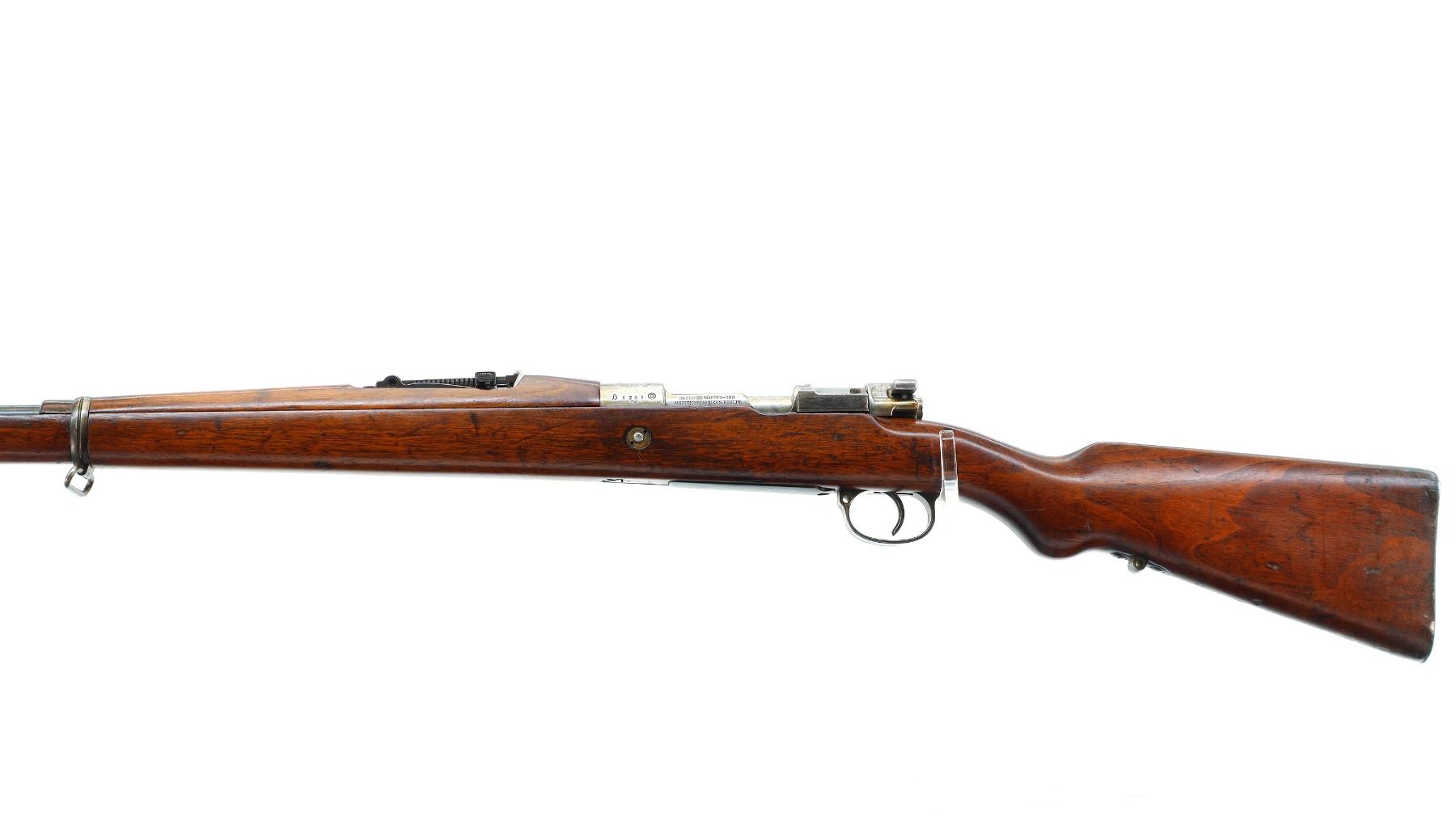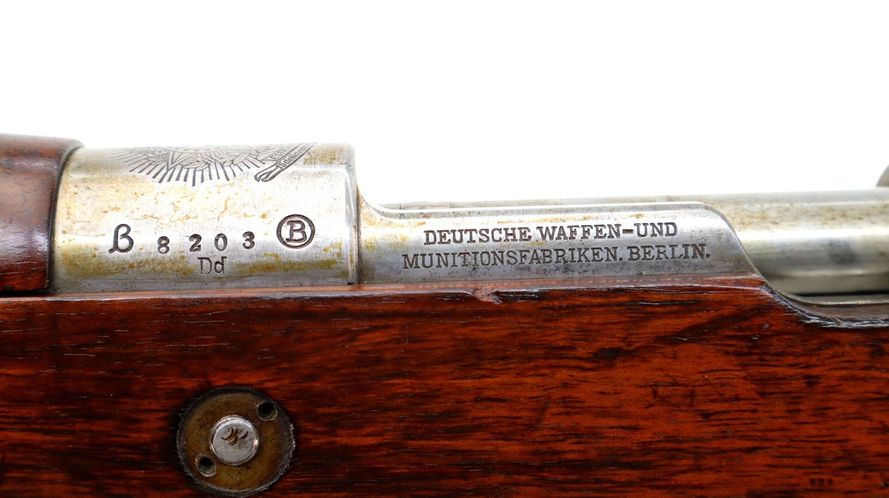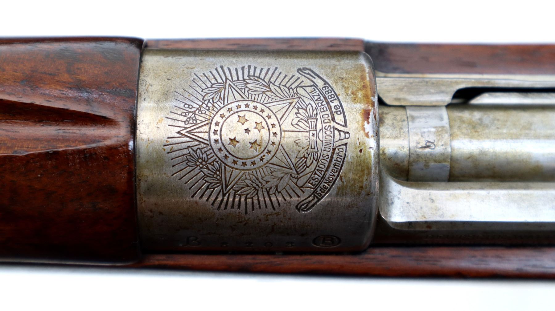 Main Description: Manufactured by DWM Berlin, visible serial numbers match. Barley corn front sight with ramp, adjustable u notched rear sight, blued finish, Brazilian crest on receiver ring, silver bolt with straight handle. Two piece full military wood stocks, pistol grip, smooth steel butt plate, steel stock disk on right side, rear stud front sling swivel, cleaning rod, bayonet lug.