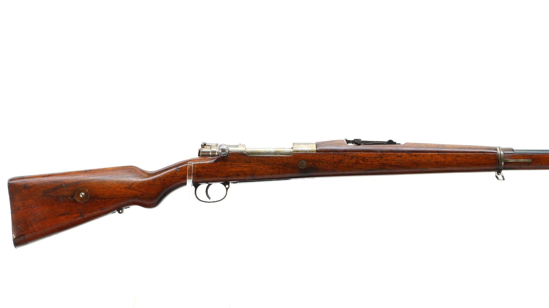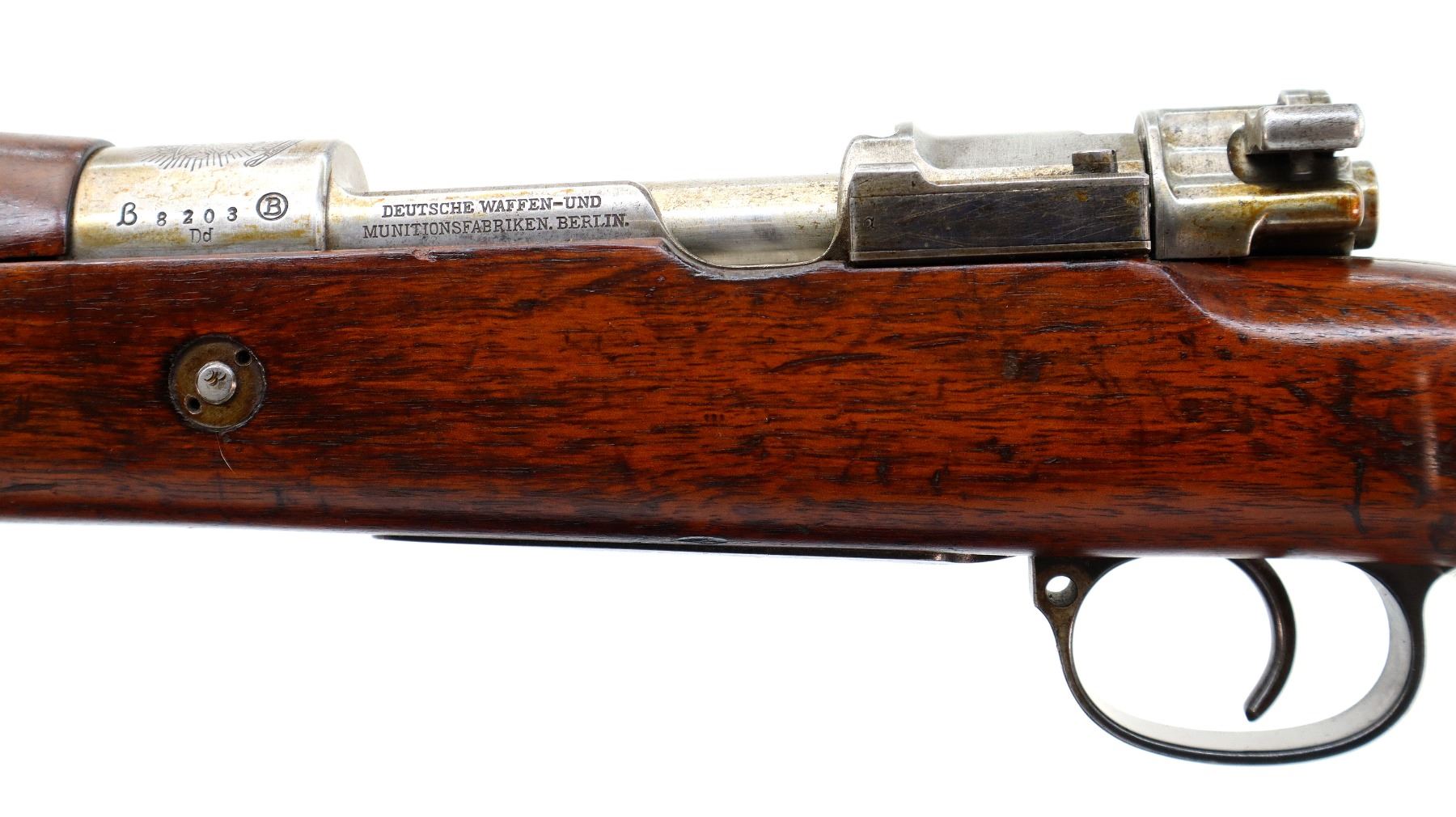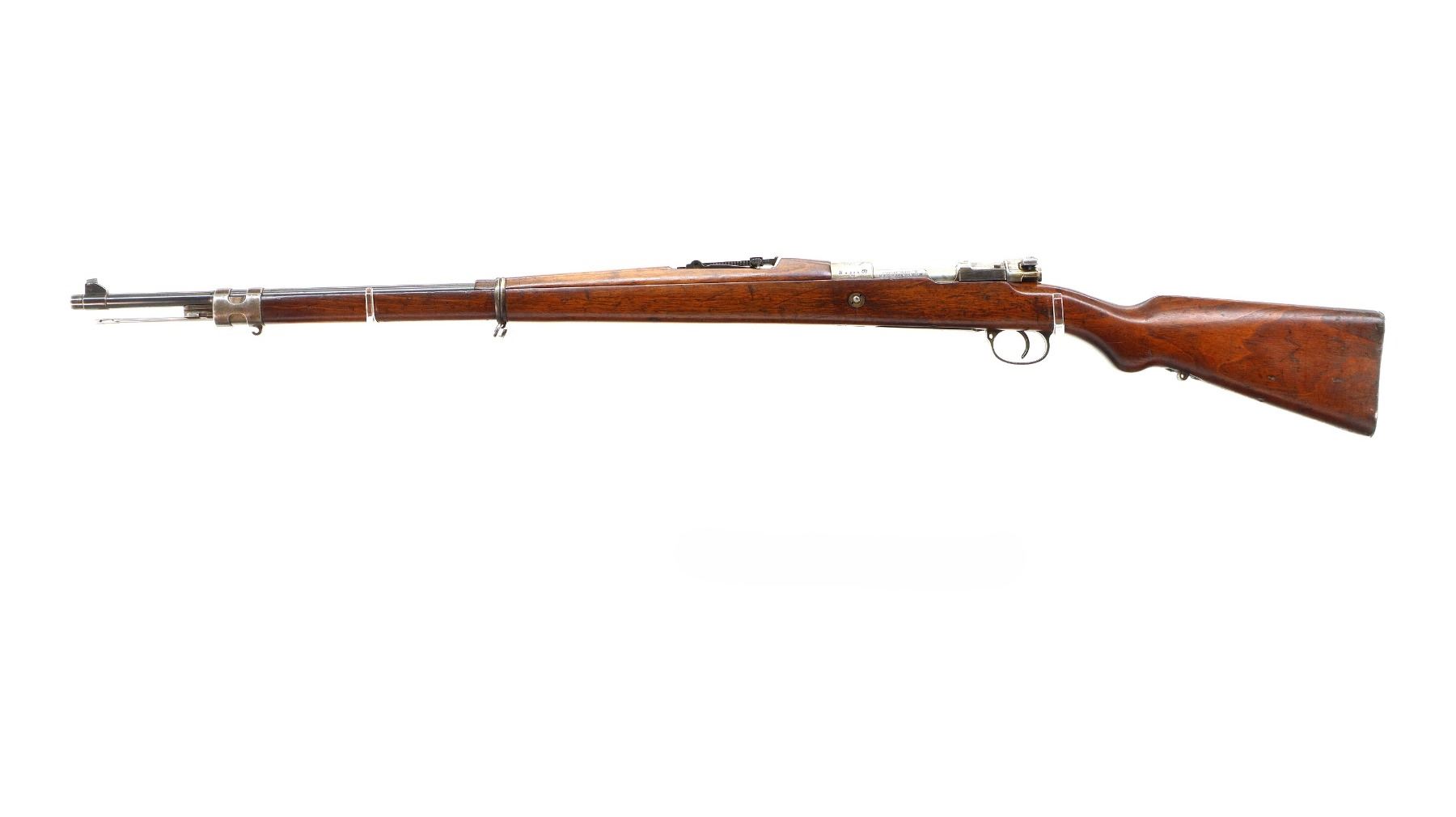 Main Description: Manufactured by DWM Berlin, visible serial numbers match. Barley corn front sight with ramp, adjustable u notched rear sight, blued finish, Brazilian crest on receiver ring, silver bolt with straight handle. Two piece full military wood stocks, pistol grip, smooth steel butt plate, steel stock disk on right side, rear stud front sling swivel, cleaning rod, bayonet lug.