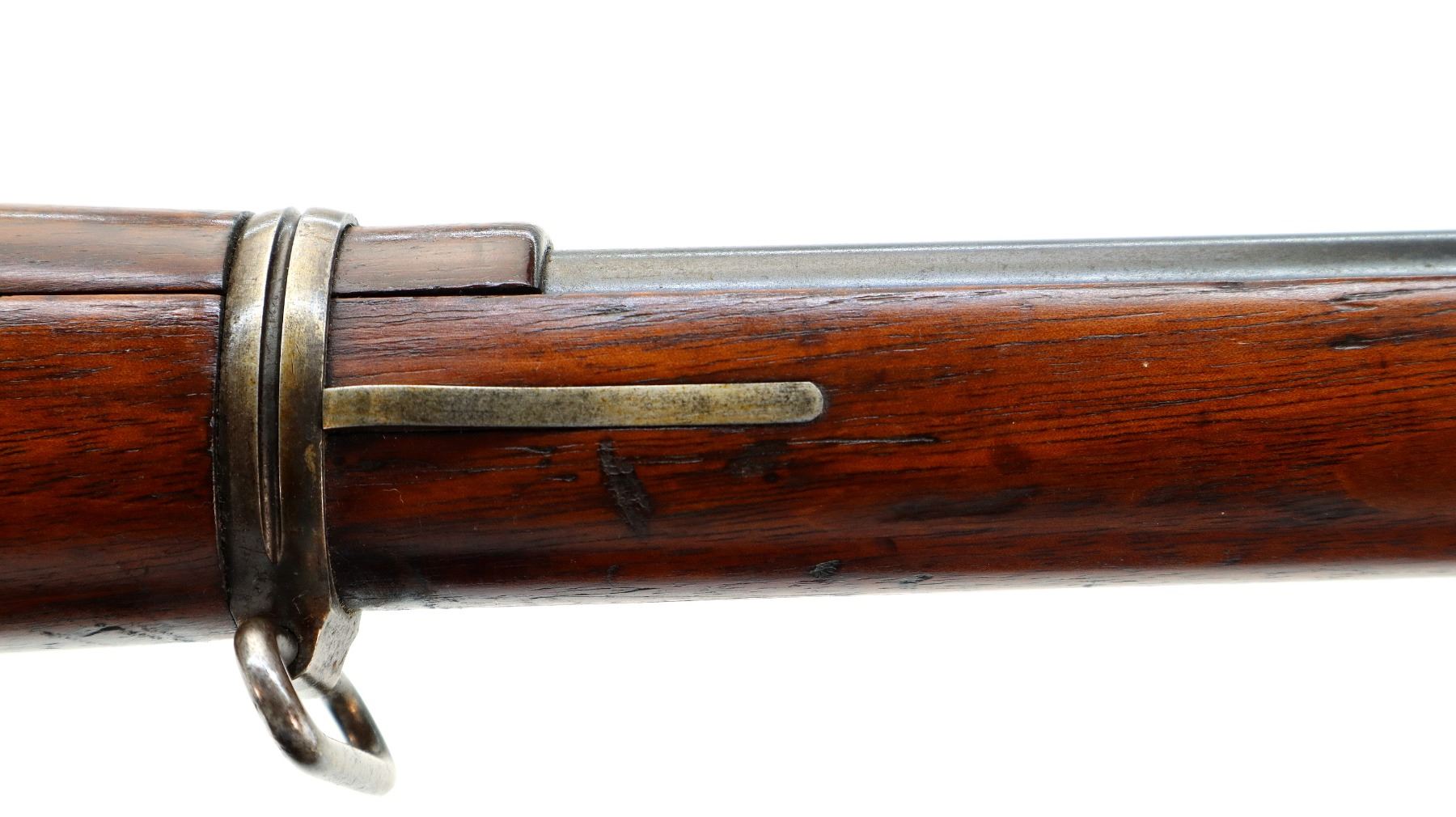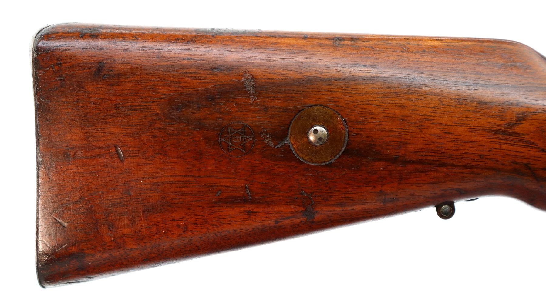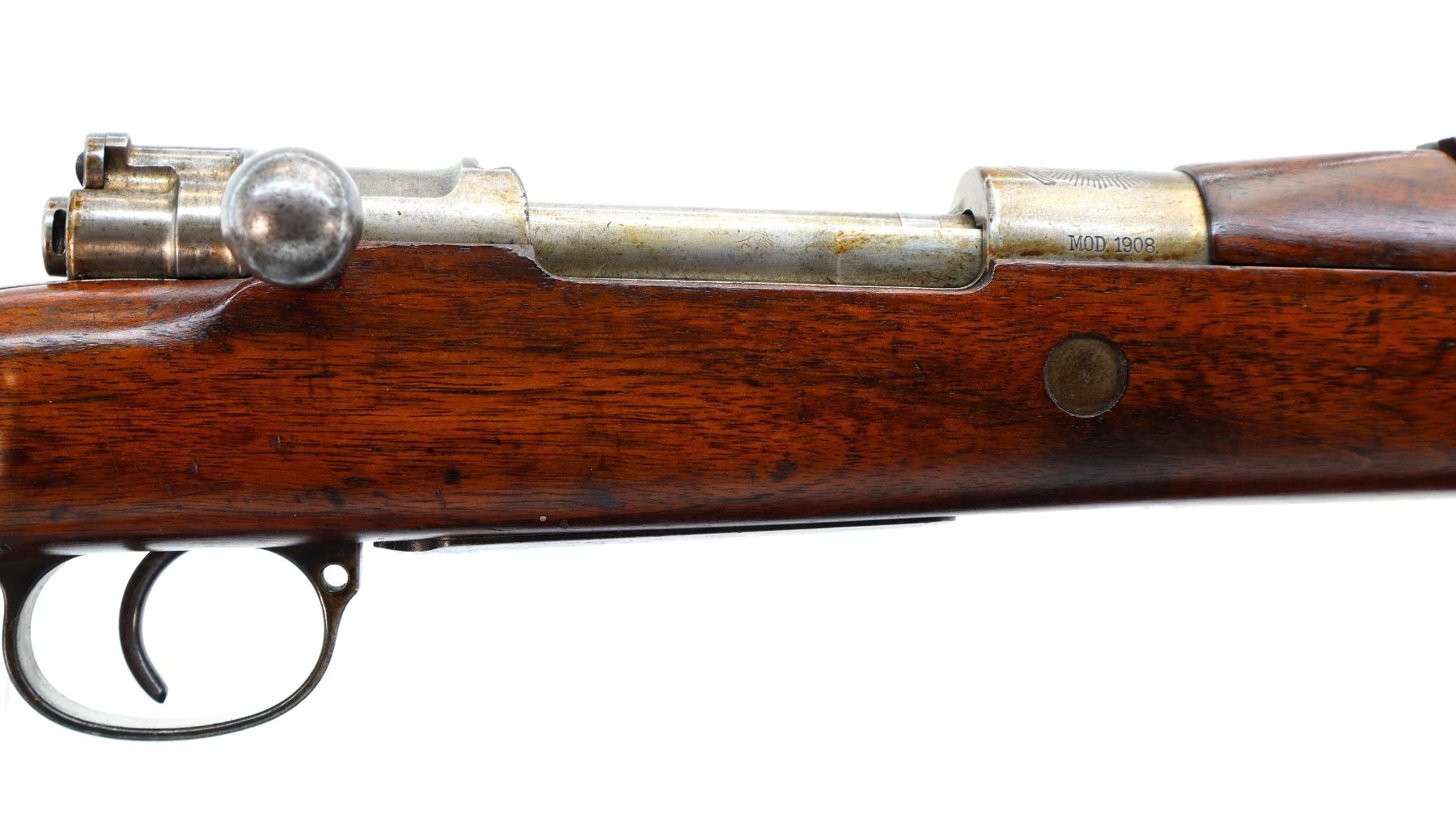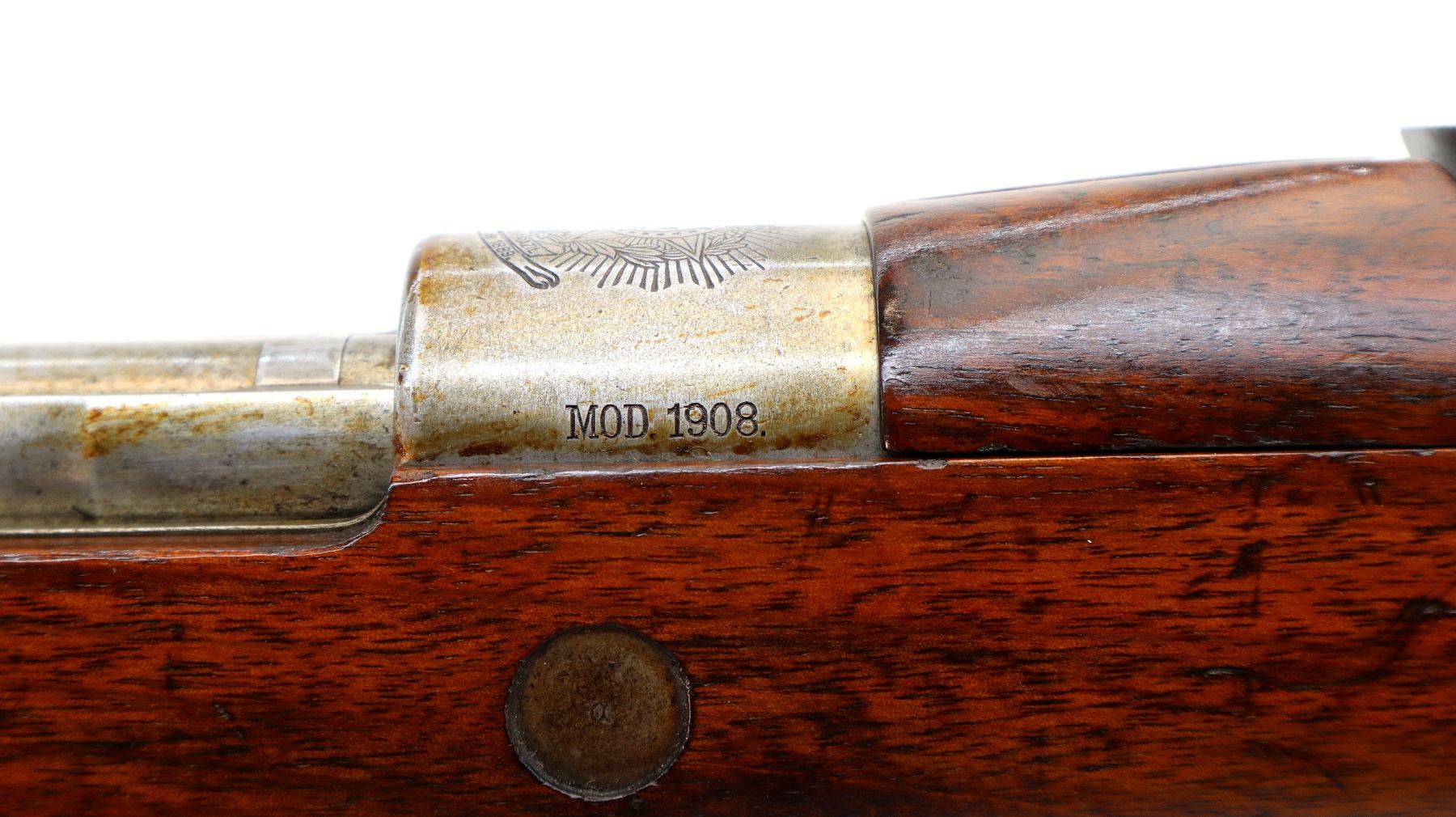 Main Description: Manufactured by DWM Berlin, visible serial numbers match. Barley corn front sight with ramp, adjustable u notched rear sight, blued finish, Brazilian crest on receiver ring, silver bolt with straight handle. Two piece full military wood stocks, pistol grip, smooth steel butt plate, steel stock disk on right side, rear stud front sling swivel, cleaning rod, bayonet lug.