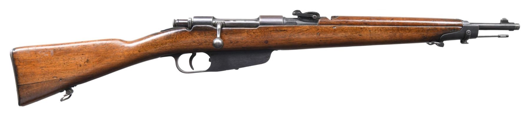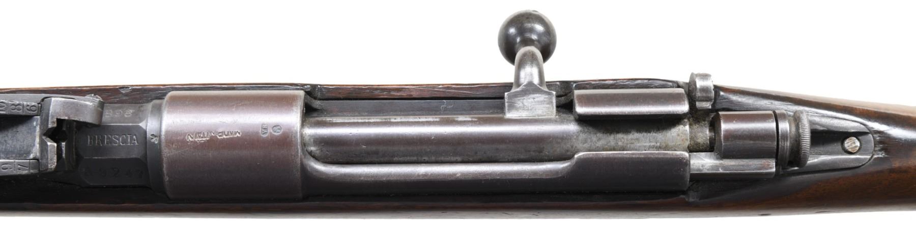 Cal. 6.5 Carcano. S# A9247. Bbl. 17 3/4". Blade front sight. Elevator rear sight graduated to 1500m. Stock number appears to match bbl. shank but no other visible numbered parts. Early 1891 Truppe Speciali Carcano carbine with transverse bayonet lug. Bbl. has "BRESCIA" arsenal stamp & 1898 date. Receiver has "MADE IN ITALY" import stamp. Blued finish. Hardwood stock set with bottom mounted & left side sling swivels & 1947 "FAT" Terni arsenal overhaul marking. Handguard is loose. CONDITION: stock set has added varnish with large arsenal splice repair at toe, a couple small cracks behind upper tang, a small handguard crack at rear, scattered dings & handling marks. Metal retains 75% arsenal rework blue with muzzle wear, scattered fading to gray & light oxidation. Action functions properly when hand cycled. Bore shows scattered frosting & light pitting but strong rifling. (01-27369/MJC). ANTIQUE. $200-300.