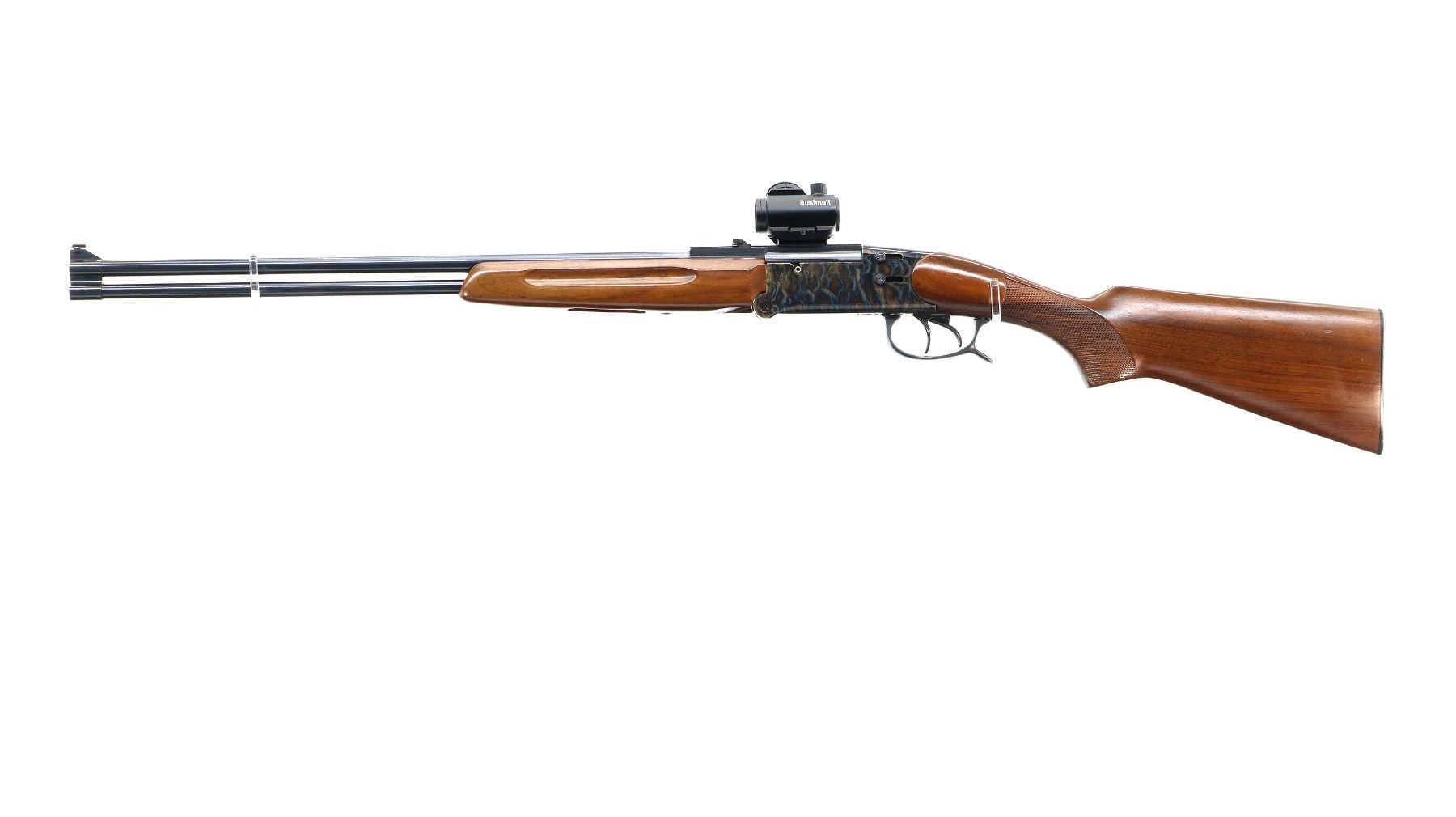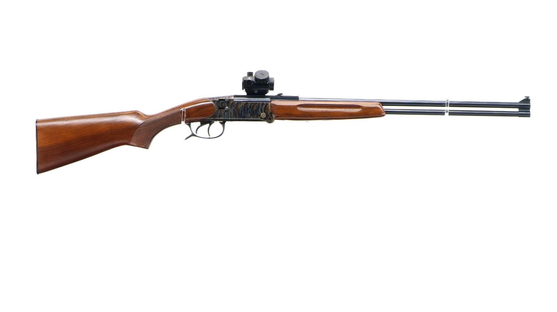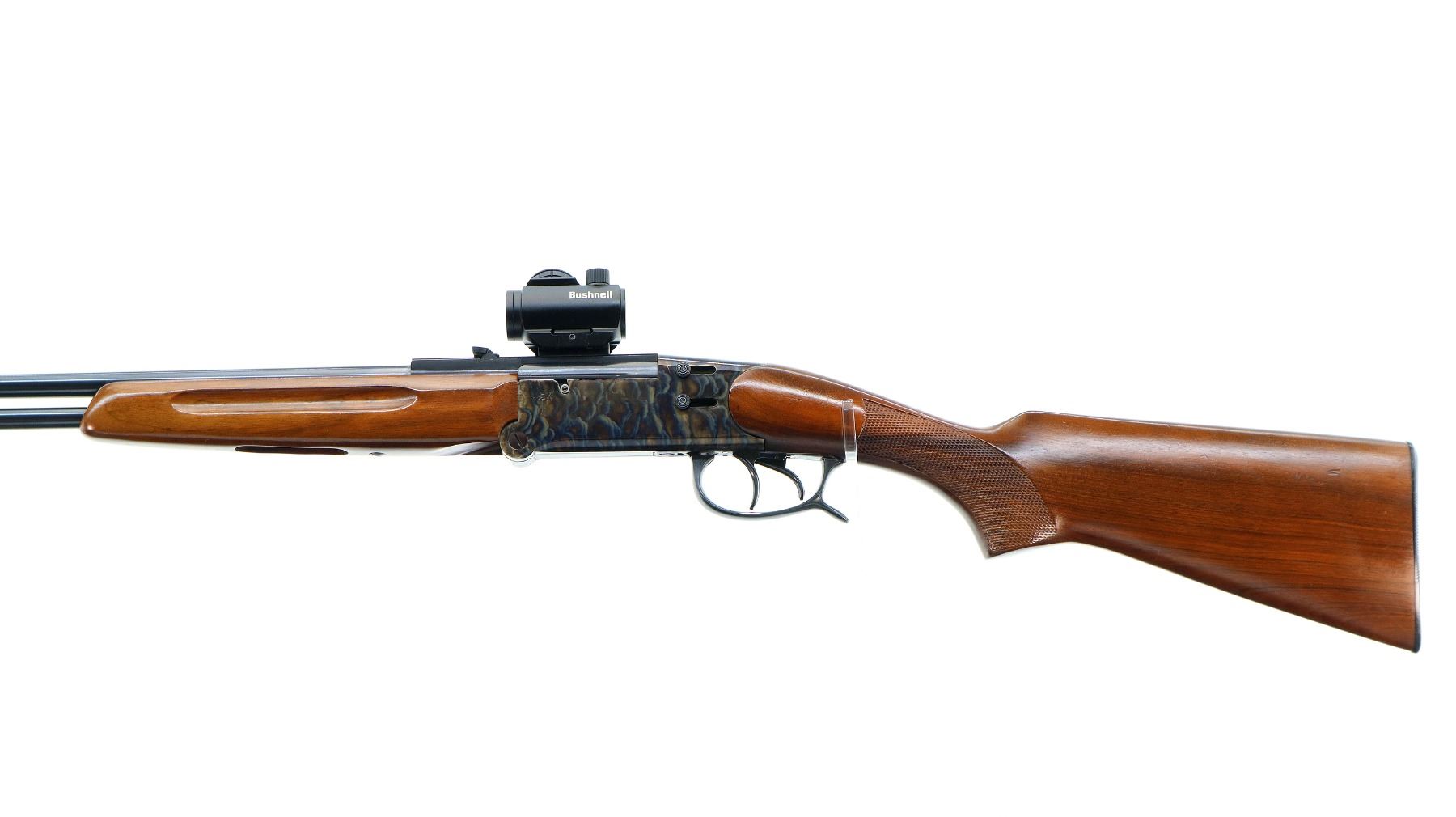 Main Description: Blade front sight with ramp, adjustable folding u notched rear sight, blued round barrels with integral scope rail and Bushnell Red dot installed that functions, clear optics. Colour case hardened receiver, ambi cocking studs, consignor states 410 barrel may have light strikes. Extractor, double triggers, trigger guard opens action. Two piece wood stocks, finger grooved forearm, checkered pistol grip, grooved black polymer butt plate.