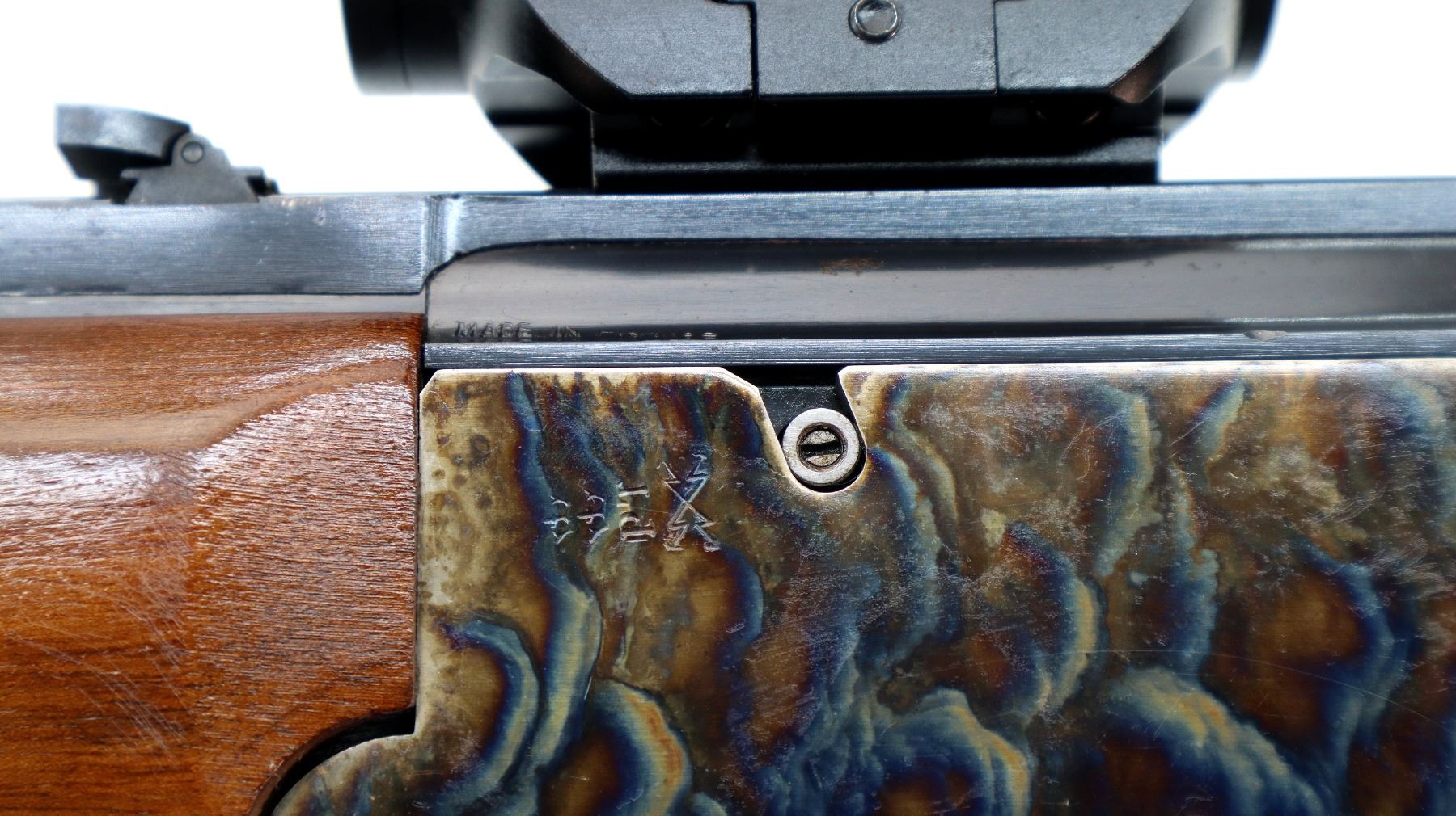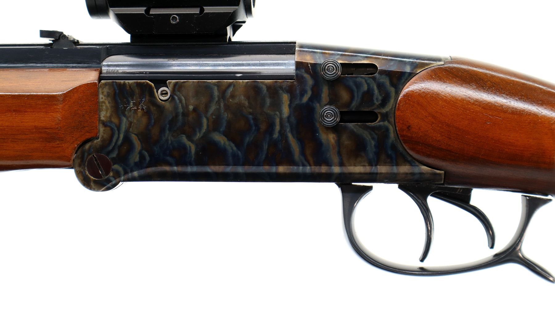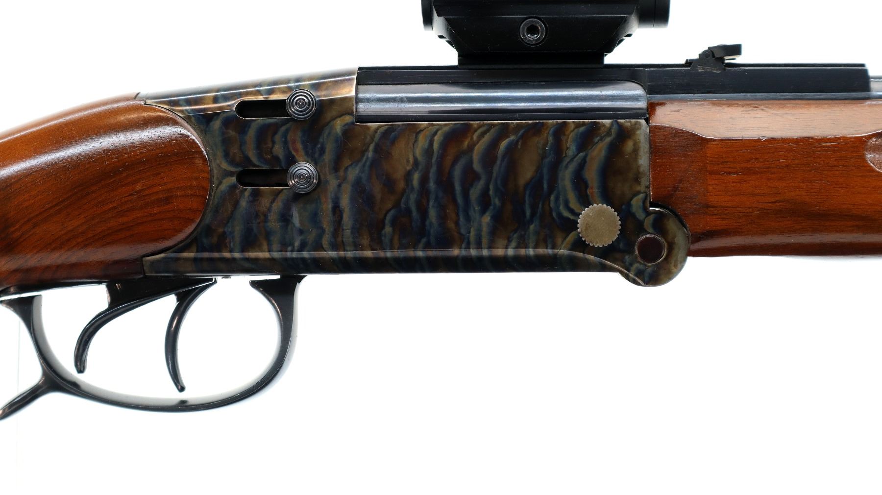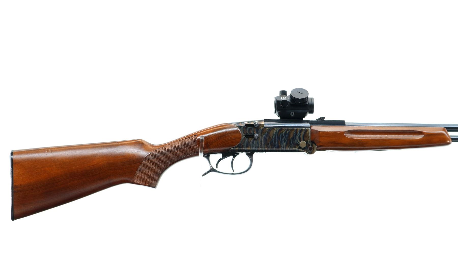 Main Description: Blade front sight with ramp, adjustable folding u notched rear sight, blued round barrels with integral scope rail and Bushnell Red dot installed that functions, clear optics. Colour case hardened receiver, ambi cocking studs, consignor states 410 barrel may have light strikes. Extractor, double triggers, trigger guard opens action. Two piece wood stocks, finger grooved forearm, checkered pistol grip, grooved black polymer butt plate.
