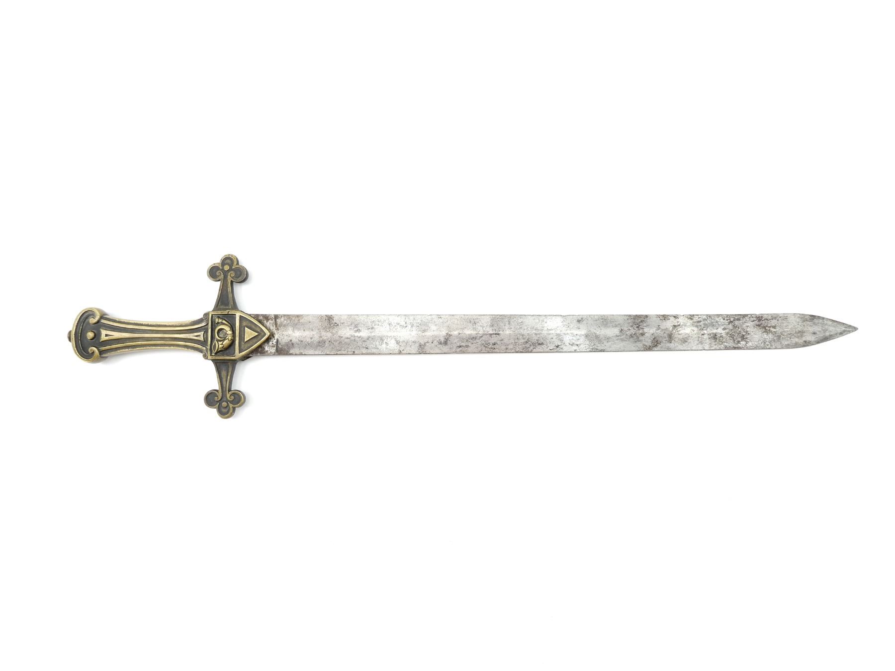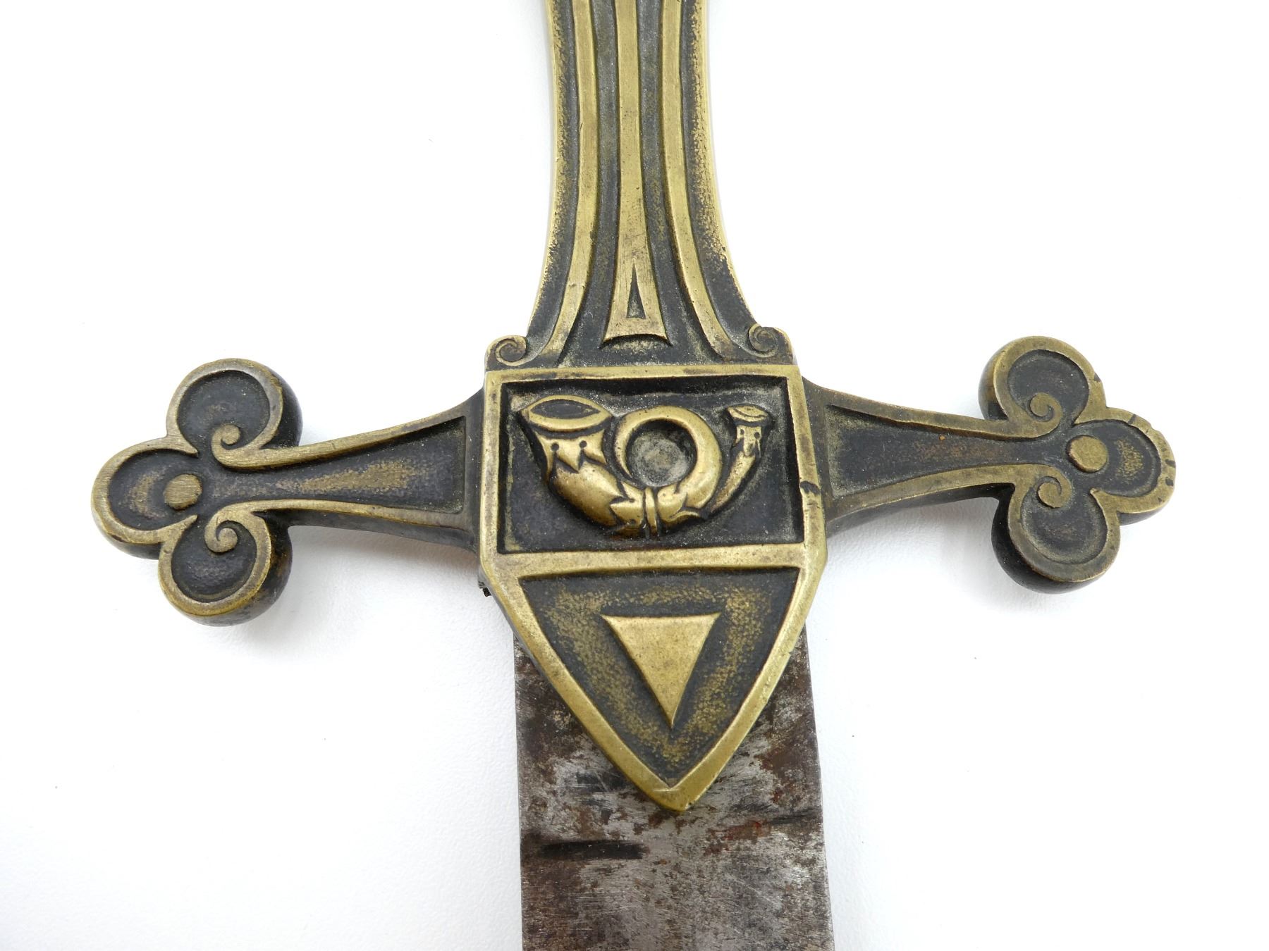(1) STRAIGHT DOUBLE-EDGED BLADE, NO VISIBLE MARKINGS ON RICASSO DUE TO GUARD WING'S / LANGUETS / RUST, NO VISIBLE MARKINGS ON BLADE, MISSING LEATHER BUFFER PAD / WASHER, BRASS DECORATIVE CROSS SHAPED CROSSGUARD, CROSSGUARD WITH BUGLE ON EITHER SIDE, BRASS 1-PIECE GROOVED GRIP, BRASS POMMEL, NO VISIBLE MARKINGS, NO SCABBARD, BLADE APPROX. 19.25" & OVERALL LENGTH APPROX. 24 7/8". SEE PHOTOS.