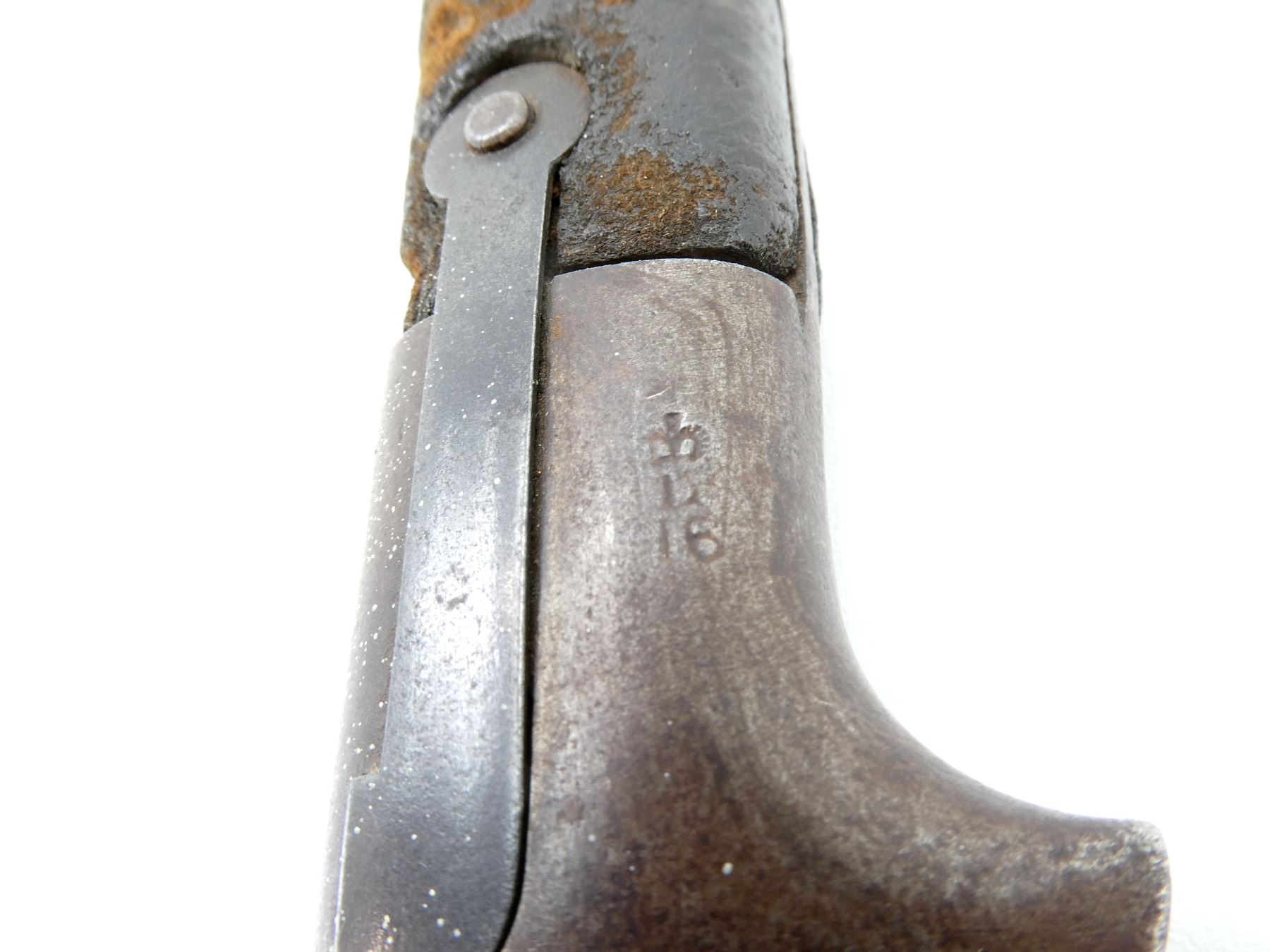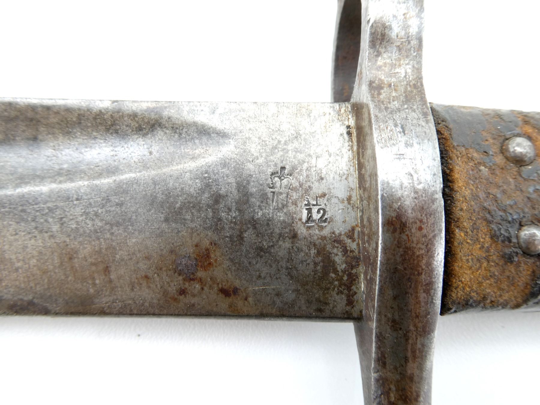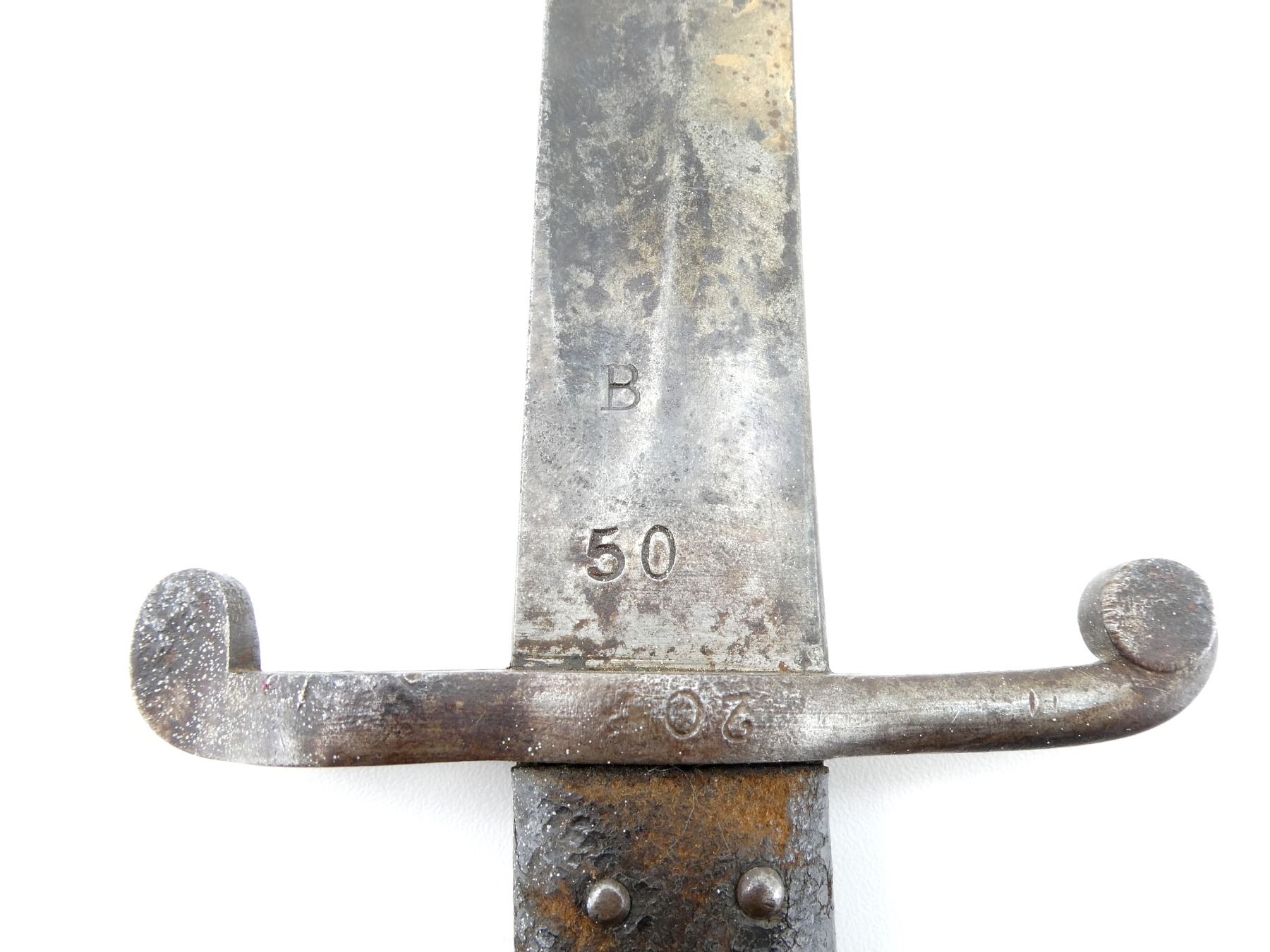 (1) FITS .577 CAL. M1853 ENFIELD SHORT MUSKETS, T-BACK BLADE, RICASSO MARKED: "B" OVER "50", OTHER-SIDE MARKED: CROWN OVER "??" OVER PARTIAL CROWN OVER "12", CROSS-PIECE MARKED: "20", 2-PIECE BLACK LEATHER GRIP, METAL POMMEL MARKED: CROWN OVER "?" OVER "16", "1220", "L" IN A CIRCLE, NO SCABBARD, BLADE APPROX. 22 7/8" & OVERALL LENGTH APPROX. 28 1/8". SEE PHOTOS.