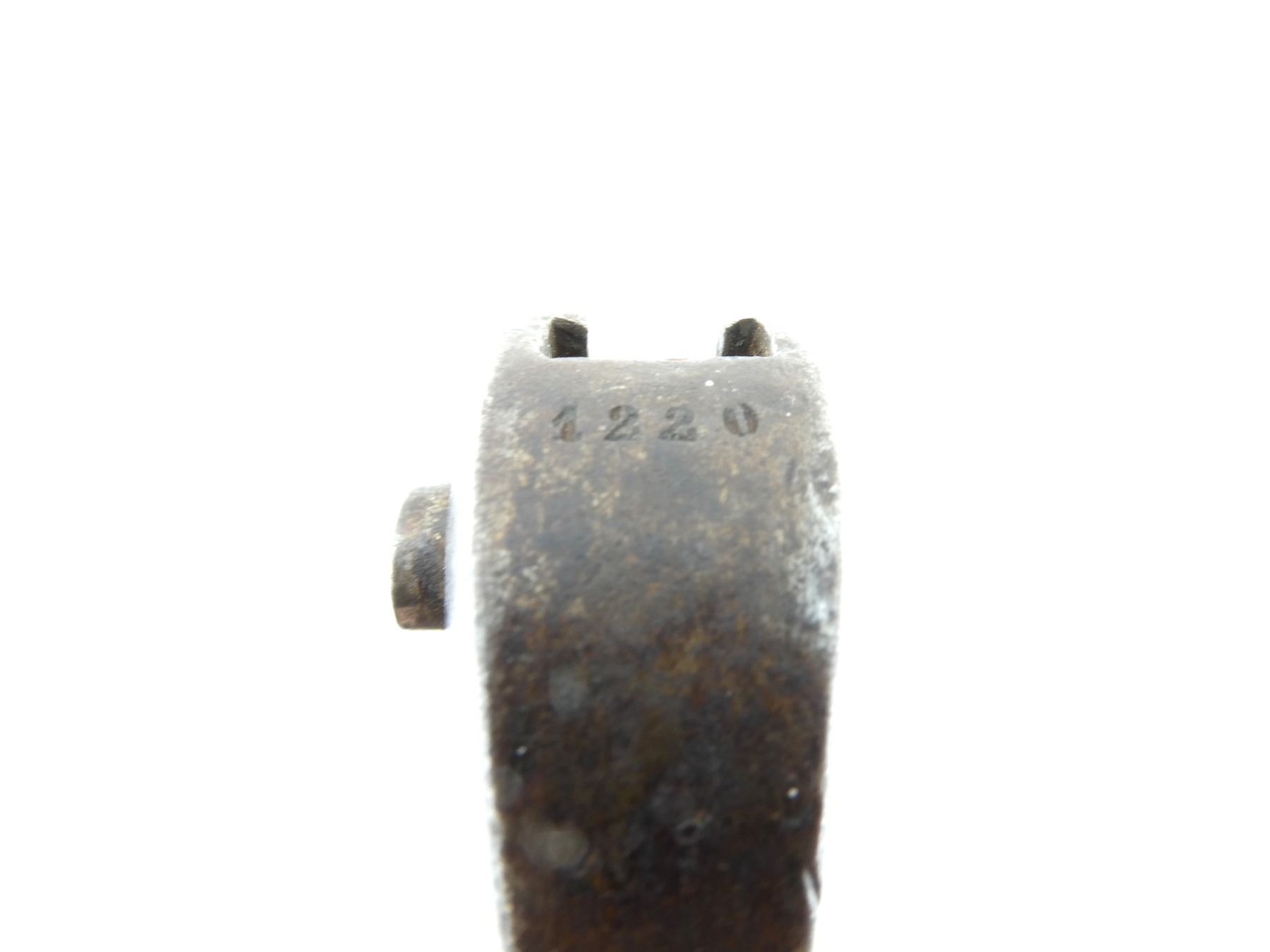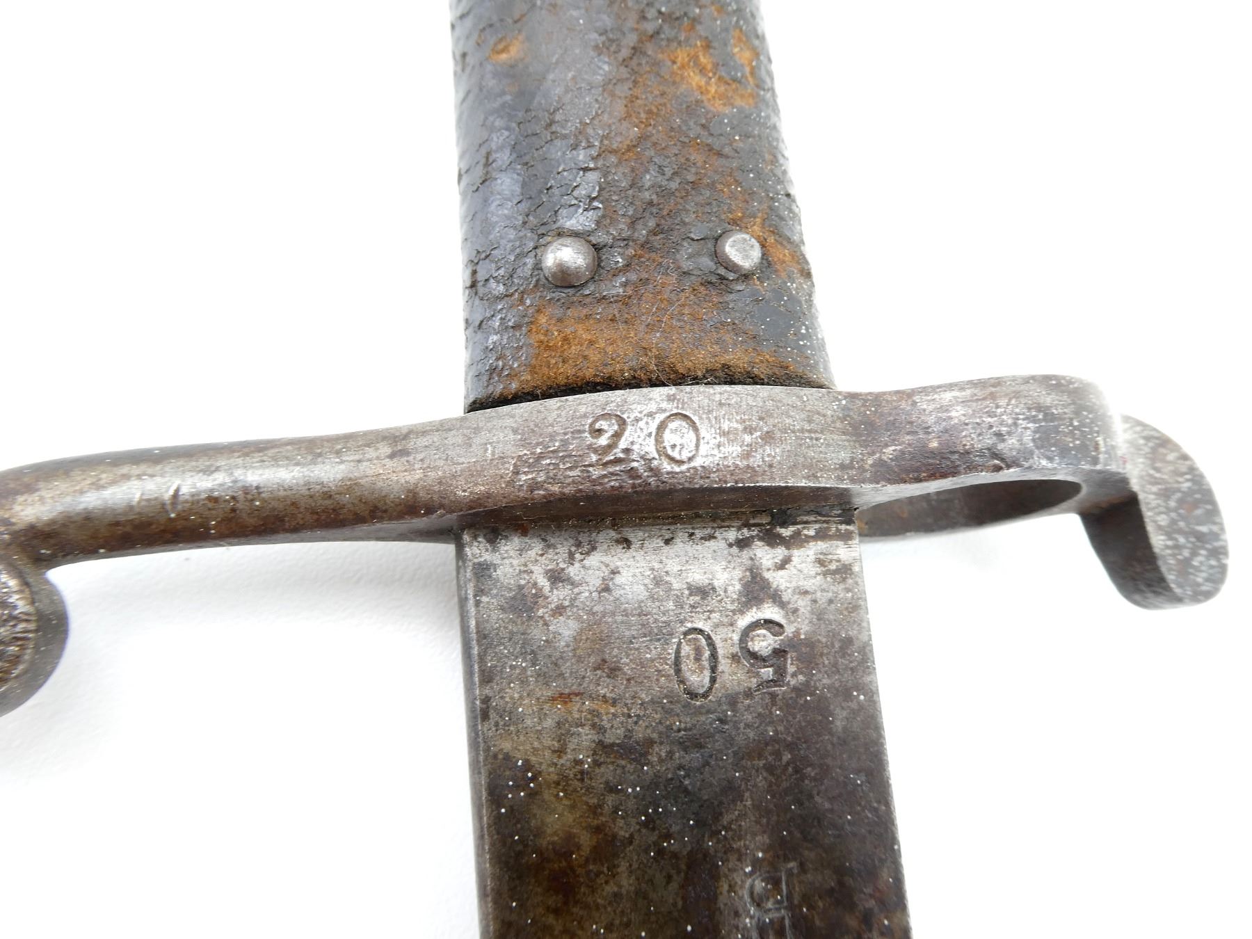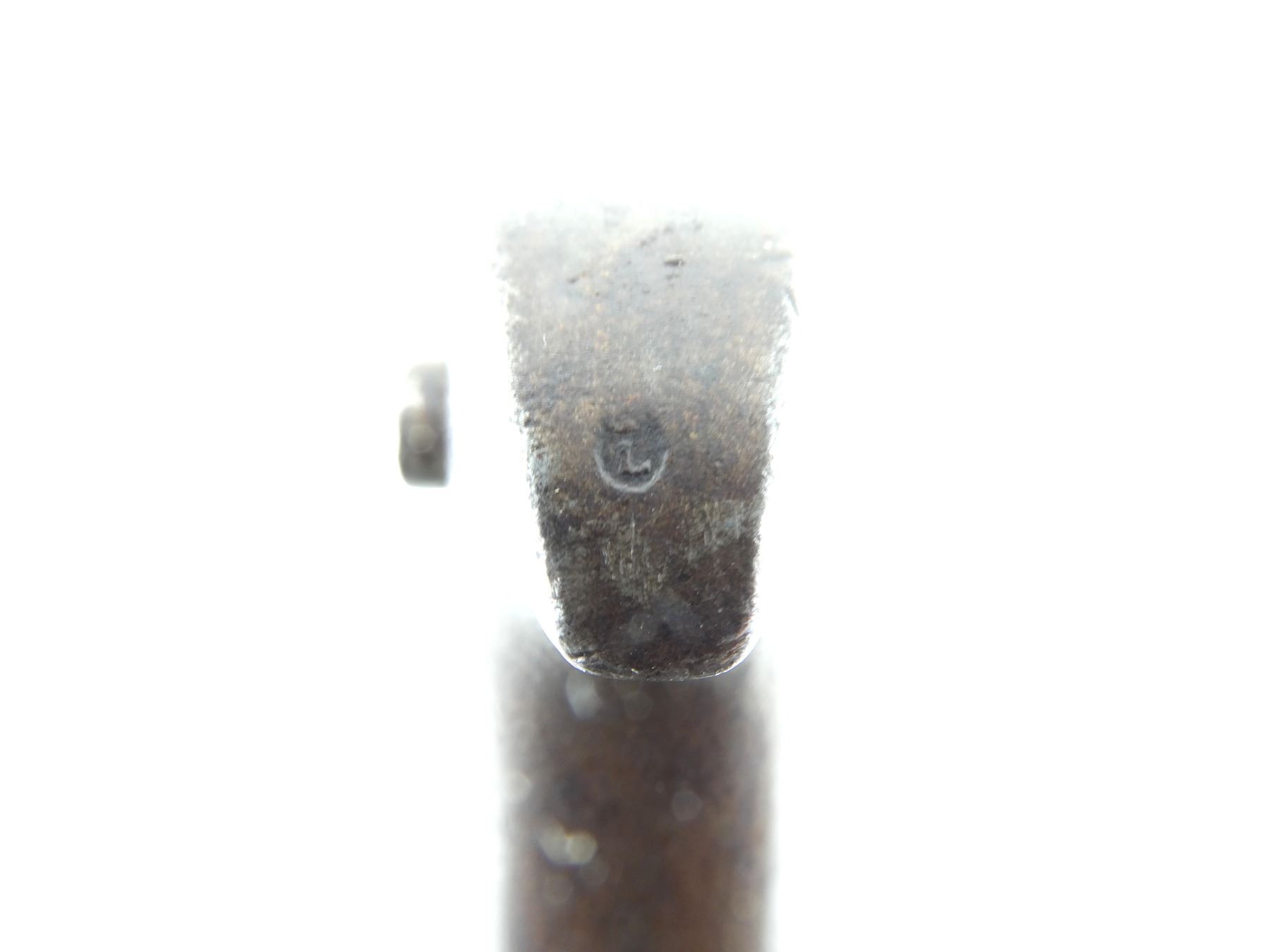 (1) FITS .577 CAL. M1853 ENFIELD SHORT MUSKETS, T-BACK BLADE, RICASSO MARKED: "B" OVER "50", OTHER-SIDE MARKED: CROWN OVER "??" OVER PARTIAL CROWN OVER "12", CROSS-PIECE MARKED: "20", 2-PIECE BLACK LEATHER GRIP, METAL POMMEL MARKED: CROWN OVER "?" OVER "16", "1220", "L" IN A CIRCLE, NO SCABBARD, BLADE APPROX. 22 7/8" & OVERALL LENGTH APPROX. 28 1/8". SEE PHOTOS.